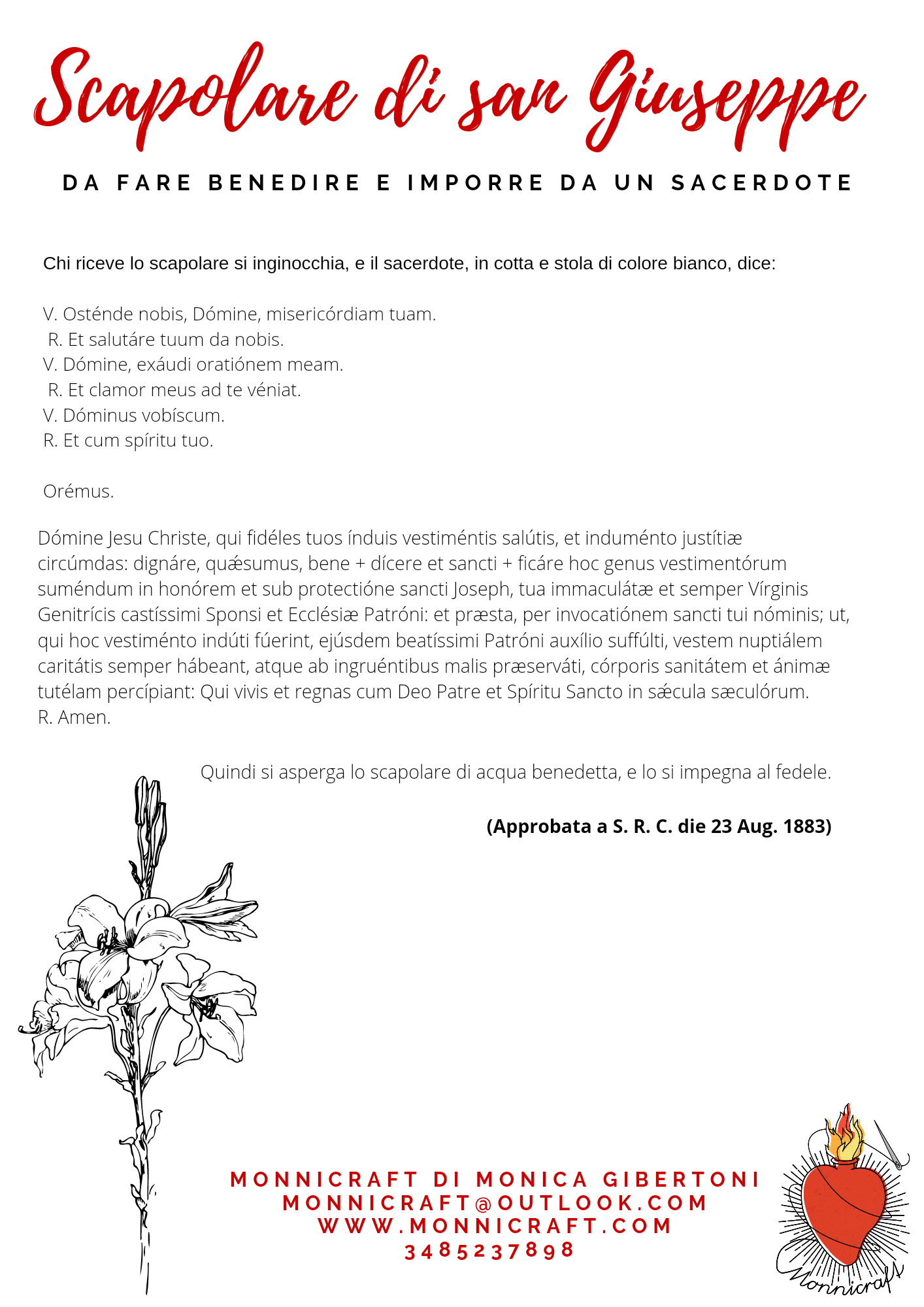 Dato che vanno benedetti e imposti da un sacerdote, con formule apposta, ho creato due volantini appositi, uno per lo scapolare del Carmelo e uno di san Giuseppe, che allego ad ogni vendita e che puoi scaricare gratuitamente.
