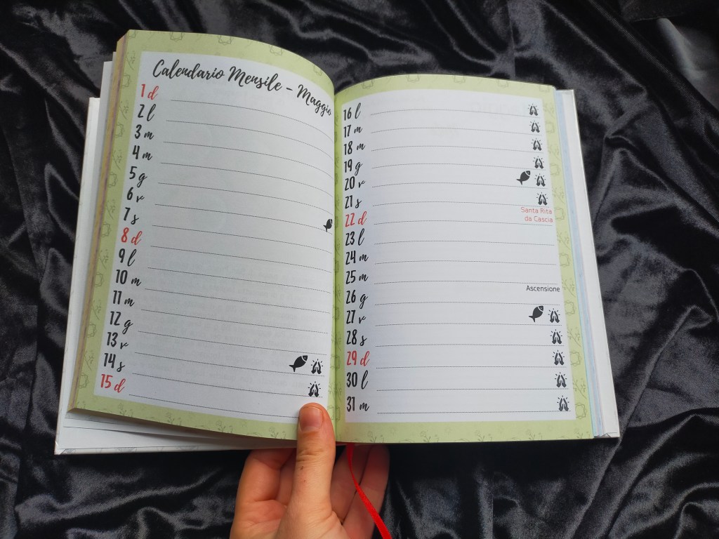 Si tratta di un’agenda SETTIMANALE, in formato A5, con copertina rigida e cartonata, segnalibro e piccola tasca in fondo per conservare qualche foglio volante. È a colori e conta 250 pagine. Oltre alle pagine settimanali (su due facciate), ci sono le seguenti rubriche: