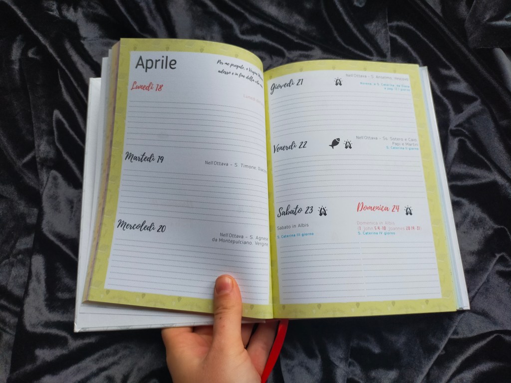 Vi presento un progetto molto ambizioso, che ho voluto con tutto il cuore. Finora in Italia non esisteva un’agenda cattolica con calendario tradizionale, e ho sempre pensato fosse un peccato…. Quindi, anche se non è certamente tra le mie competenze ho deciso di buttarmi.
