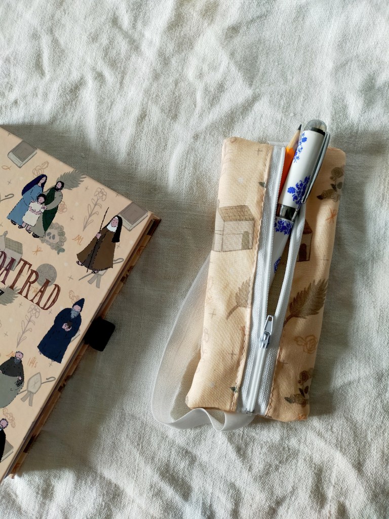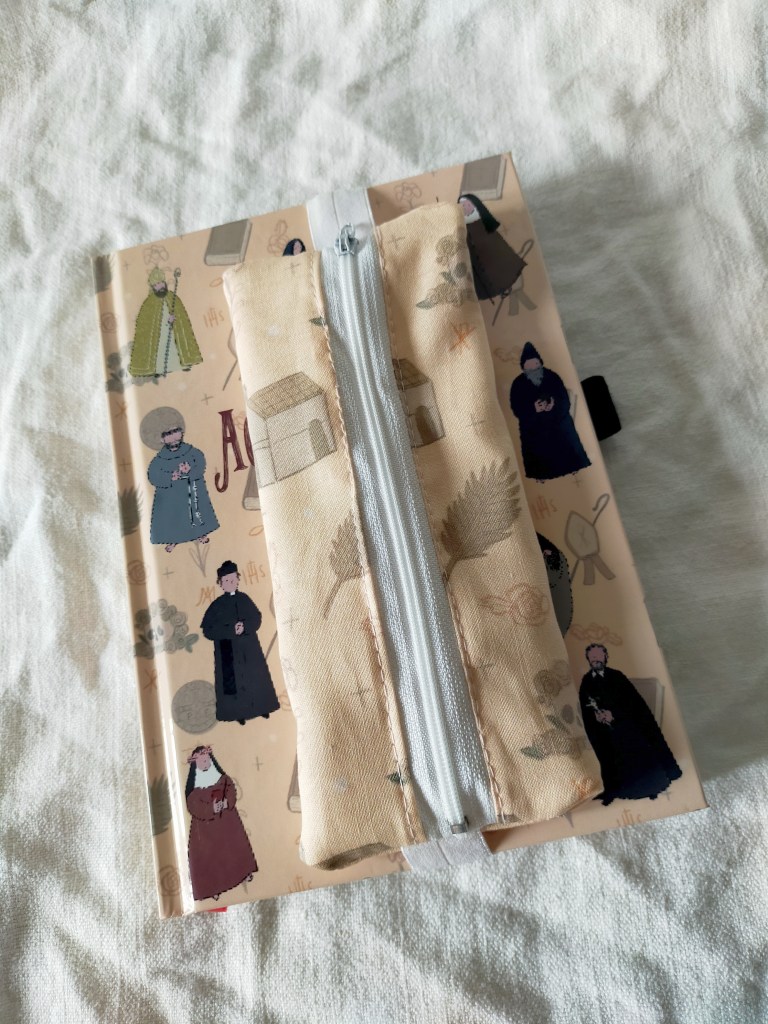 L’astuccio è realizzato con una stoffa stampata che riprende il motivo della copertina dell’agenda (con elementi dei santi che popolano le rubriche mensili), e all’interno solida canapa tessuta dalla mia bisnonna. La chiusura con cerniera e l’elastico lo rendono comodissimo da utilizzare. Mi avevate chiesto uno spazio dove inserire penne e matite e vi ho accontentate!