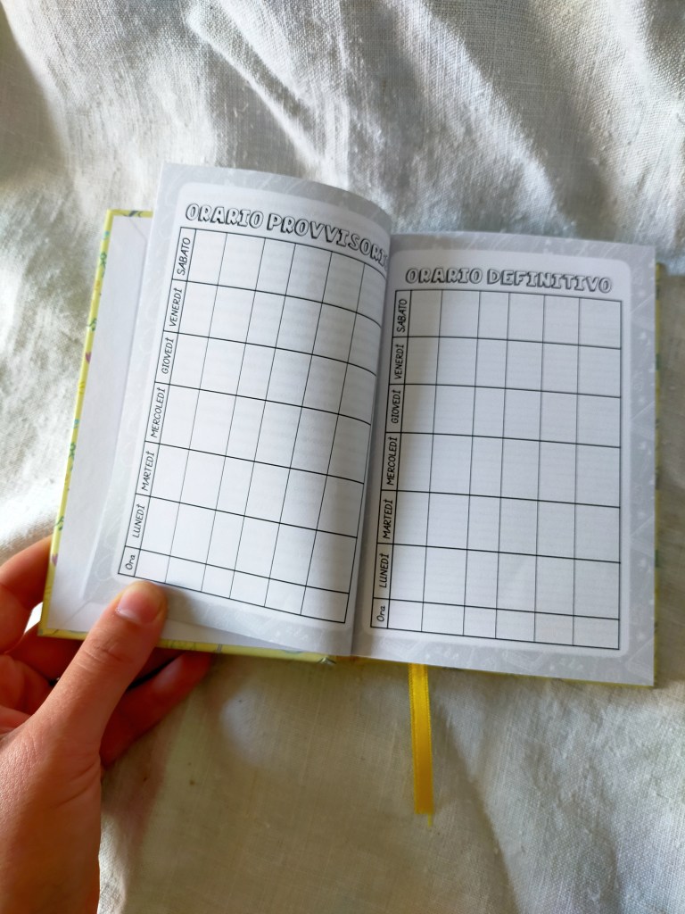 Si tratta di un diario scolastico, quindi da settembre 2023 a giugno 2024, GIORNALIERO, in formato simile all’A6 (10,5 x 15,5 cm per l’esattezza), e conta 310 pagine. La copertina è rigida e lucida e c’è un segnalibro in tono con la copertina. Il diario è interamente in bianco e nero, ed è stata una scelta motivata da due fattori: la volontà di farlo personalizzare agli studenti, e la necessità di tenere i costi contenuti per potervi proporre un prezzo competitivo.