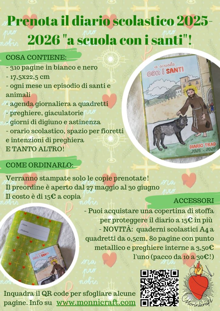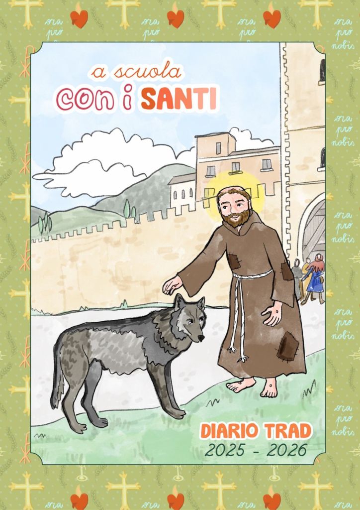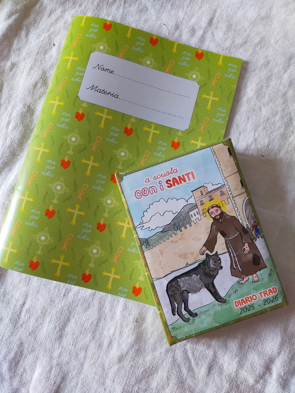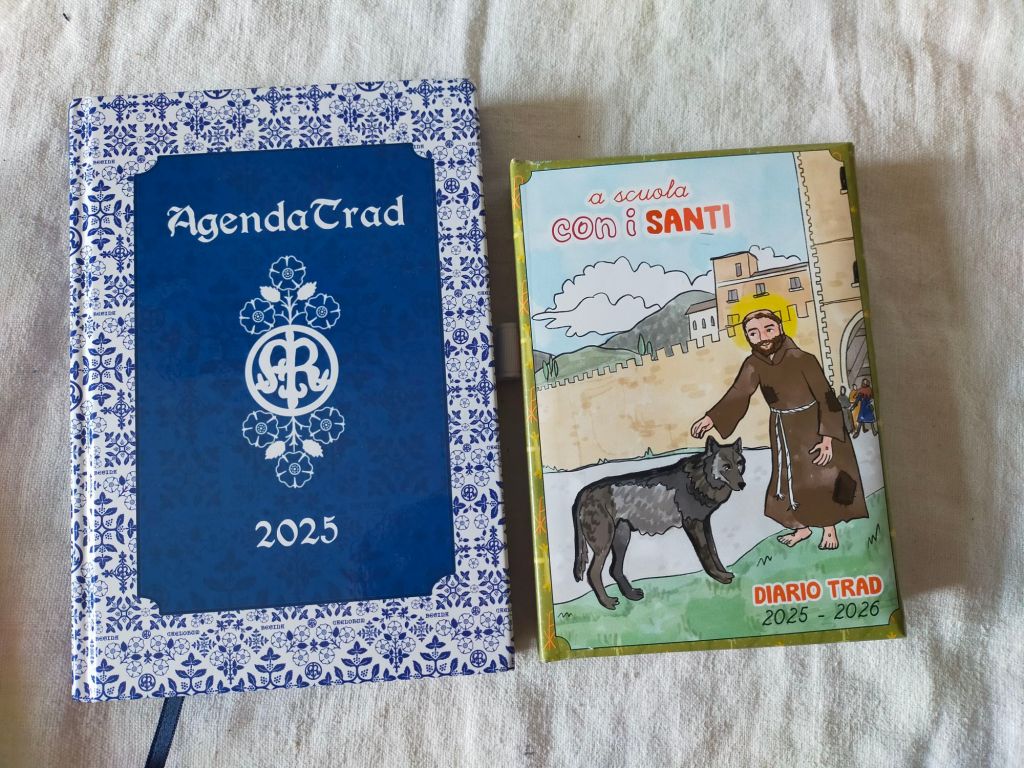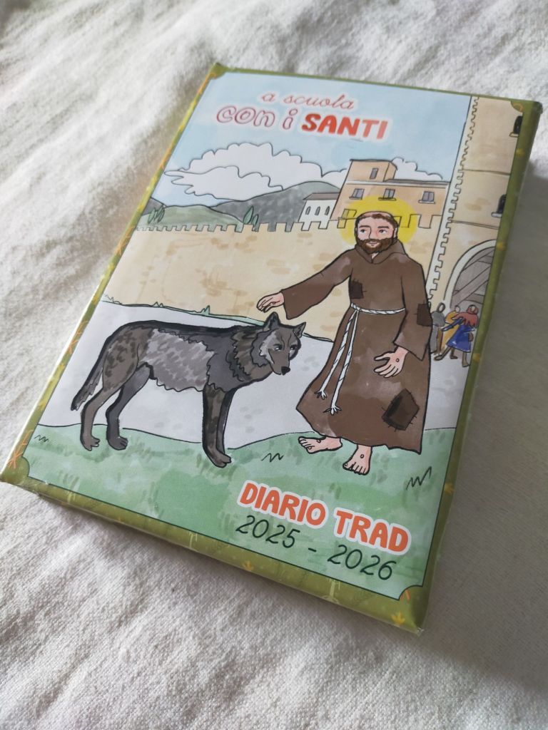 Già da quattro anni (e questo è il quinto, perchè siamo già al lavoro per il 2026!) io e l’Illustratrice Rosanna realizziamo l’unica agenda cattolica tradizionale in Italia. Anno dopo anno questo progetto cresce sempre più. Fin da subito ci è stato chiesto di realizzare un’agenda giornaliera, e un diario scolastico affinchè anche i più piccoli potessero avere uno strumento cattolico a guidare le loro giornate, un segno tangibile che la Fede permea ogni aspetto della vita, scuola compresa. E’ nato quindi il diario, ed è subito stato un successone.