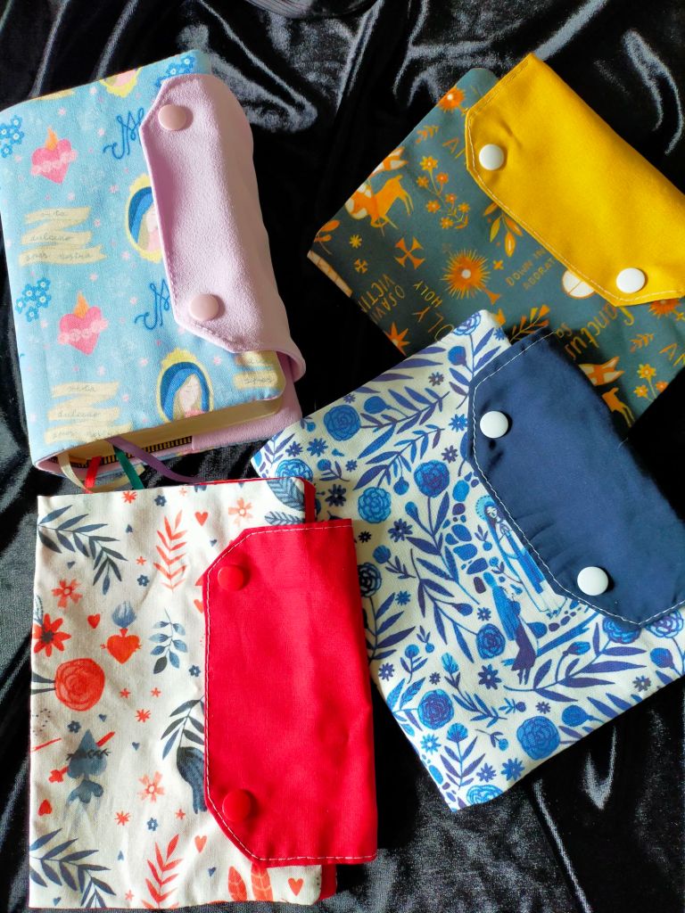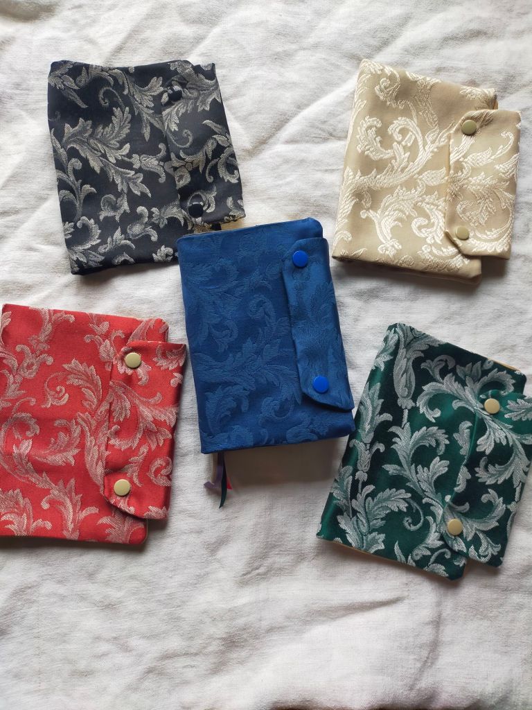 All’esterno potete scegliere le celeberrime fantasie cattoliche (quelle che utilizzo anche per le custodie portavelo e le copertine per i libri), oppure i tessuti a tinta unita damascati: