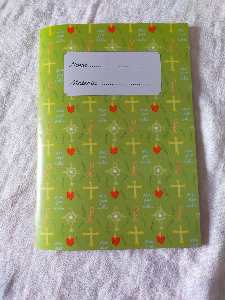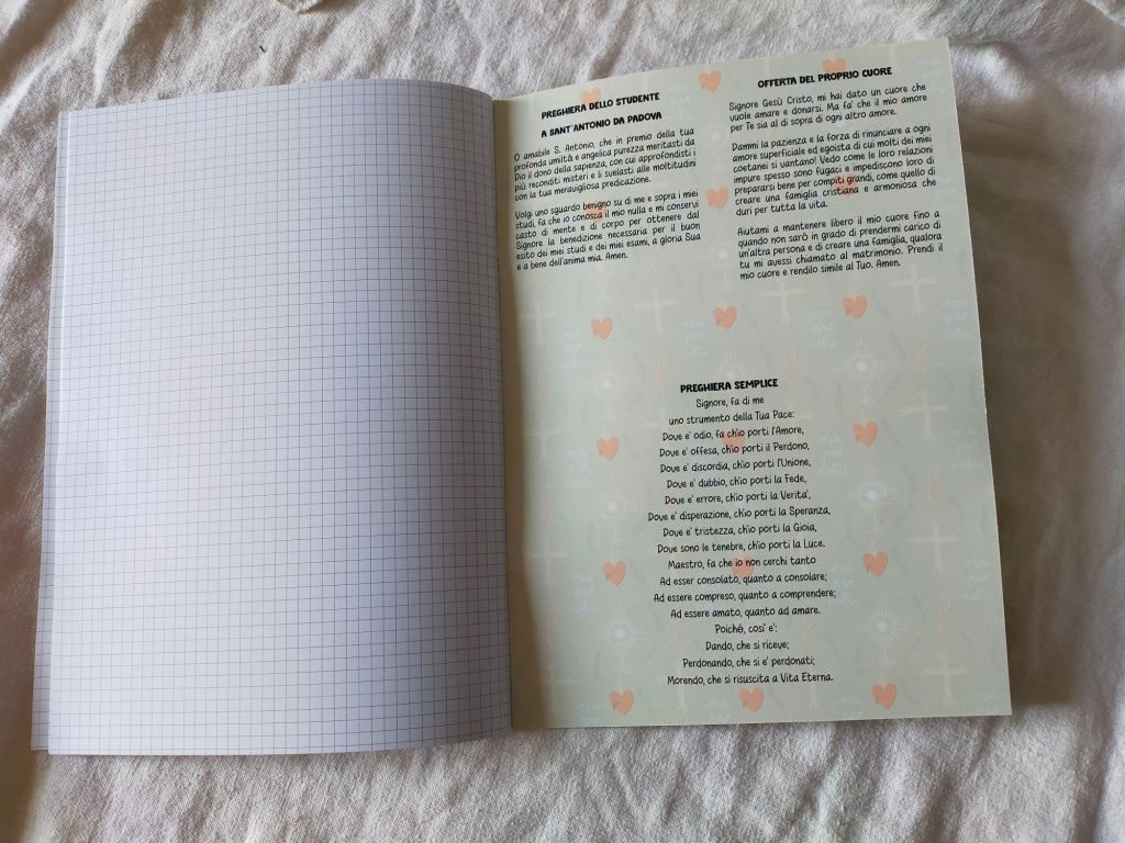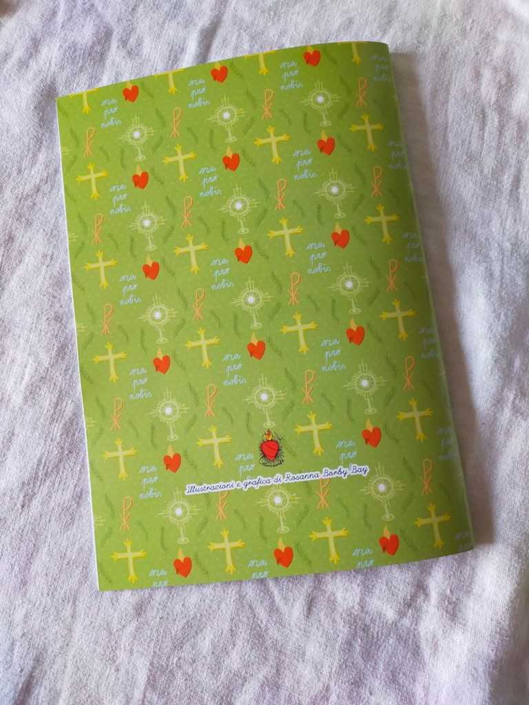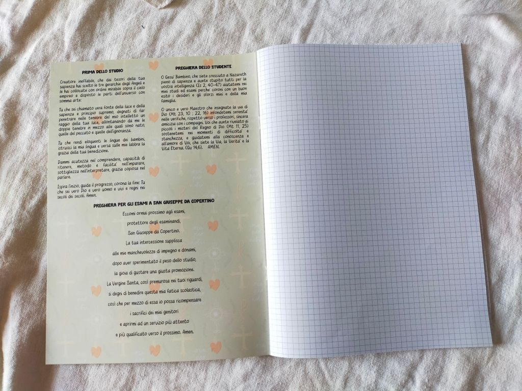 QUADERNO , la novità di quest’anno! In formato a5, conta 80 pagine a quadretti da mezzo cm. All’interno della copertina ci sono due pagine di preghiere inedite, sempre a Gesù. Il prezzo è di 3€ a copia.