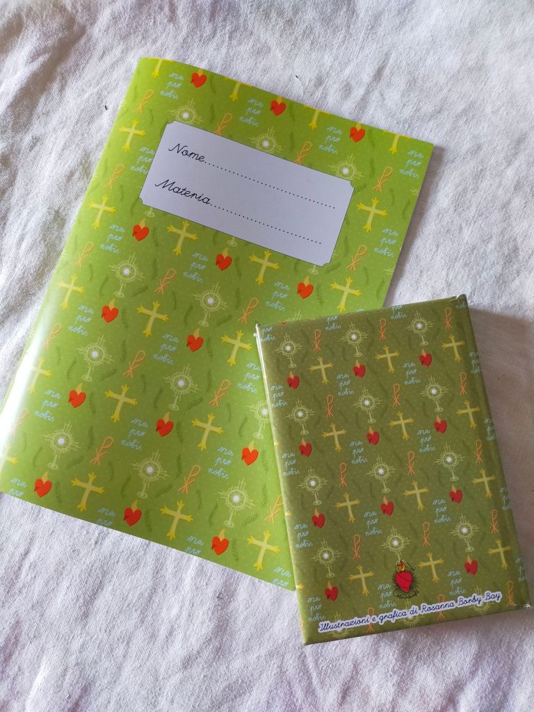 Vi proponiamo quindi i quaderni scolastici: la copertina ha il pattern del diario, e internamente invece ci sono tante belle preghiere degli studenti. Abbiamo scelto per semplicità un unico formato, A4 a quadretti da mezzo centimetro, 80 pagine con punto metallico.