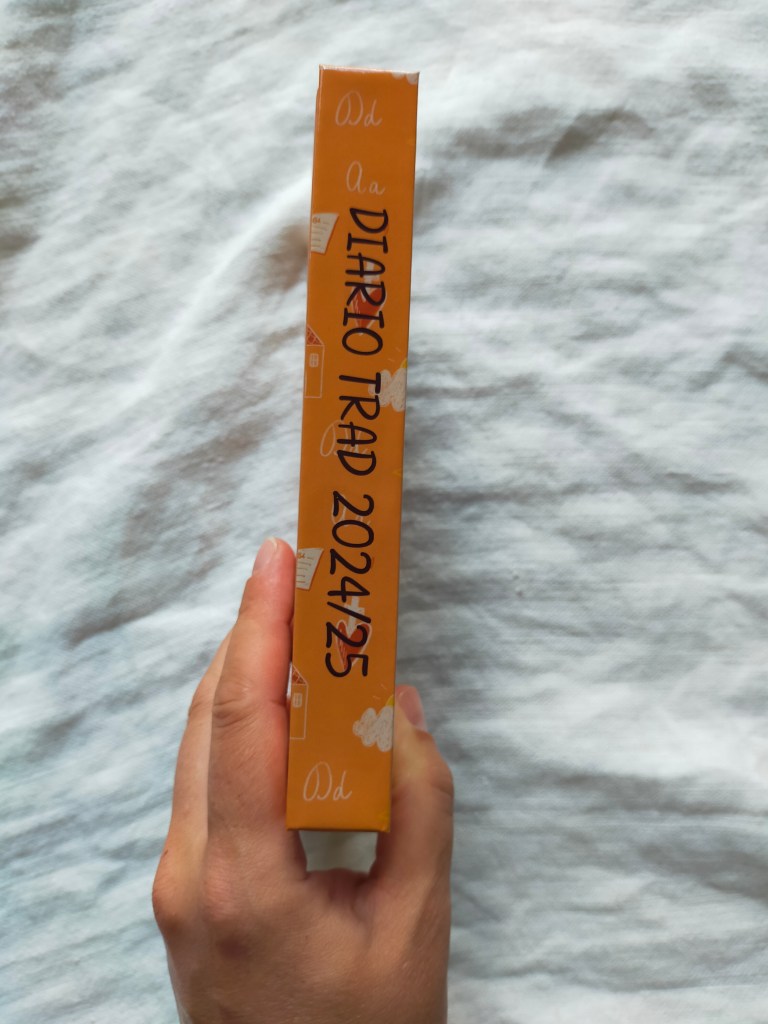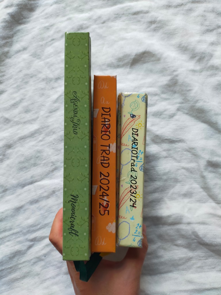 Si tratta di un diario scolastico, quindi da settembre 2024 a giugno 2025, GIORNALIERO, in formato simile all’A6, ma più grande dell’anno scorso (12,5 x 17,5 cm per l’esattezza), e conta 310 pagine. Ecco il confronto tra il diario scolastico dell’anno scorso e l’agenda trad, così da farti capire meglio le dimensioni:
