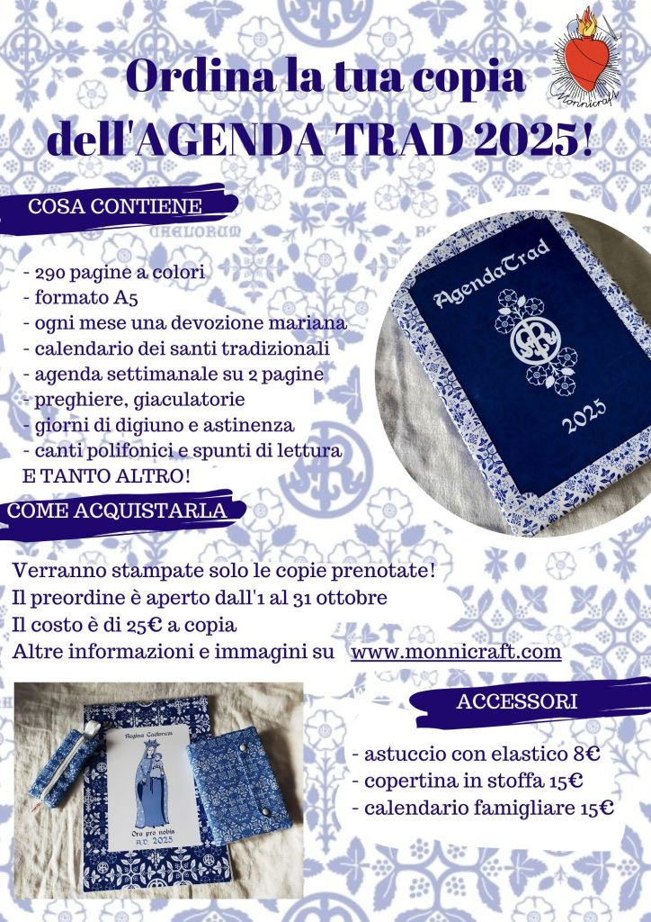 E’ proprio questo bisogno di vivere la Fede cattolica nel quotidiano che ha spinto me e Rosanna a creare, nel 2021, la prima agenda con calendario tradizionale in Italia. Ora più che mai, quando la barca di Pietro naviga in una tempesta senza precedenti, occorre tornare a vivere la Fede cattolica in maniera integrale, in barba al modernismo miscredente che cerca di bollare ogni devozione come bigottismo o scaramanzia. In tutto ciò, uno strumento banale come un’agenda può trasformarsi in un aiuto concreto per una vita di preghiera e di devozione? Io credo di sì.