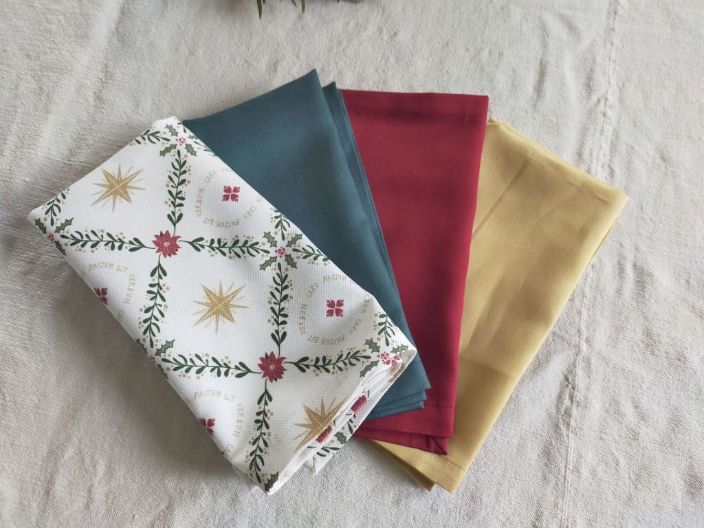 Il costo dei tovaglioli è di 12 € l’uno per la versione stampata, e di 9€ per il raso di cotone a tinta unita. OFFERTA: Il set da 6 tovaglioli (e multipli) viene 50€ stampato e 37€ a tinta unita. Da 7 tovaglioli in su il costo è di 10€ l’uno per gli stampati e di 7€ per i tinta unita I colori disponibili sono: bordeaux, senape, verde e stampato. Di seguito le combinazioni con la tovaglia stampata.