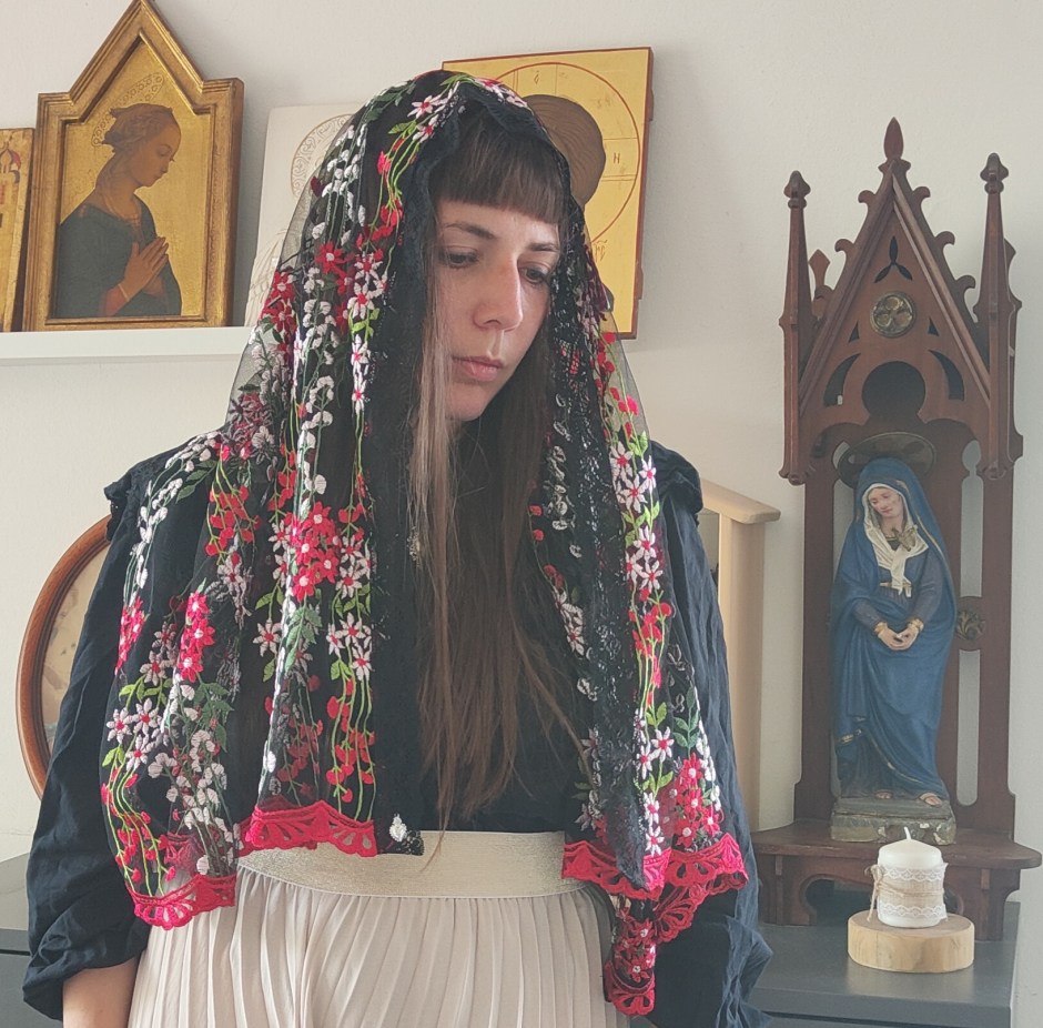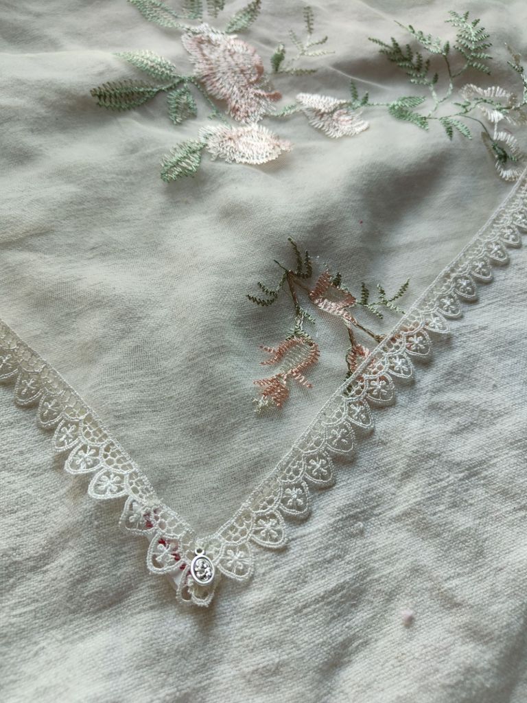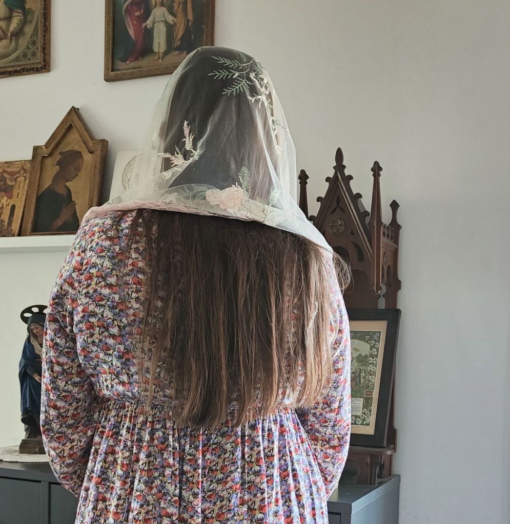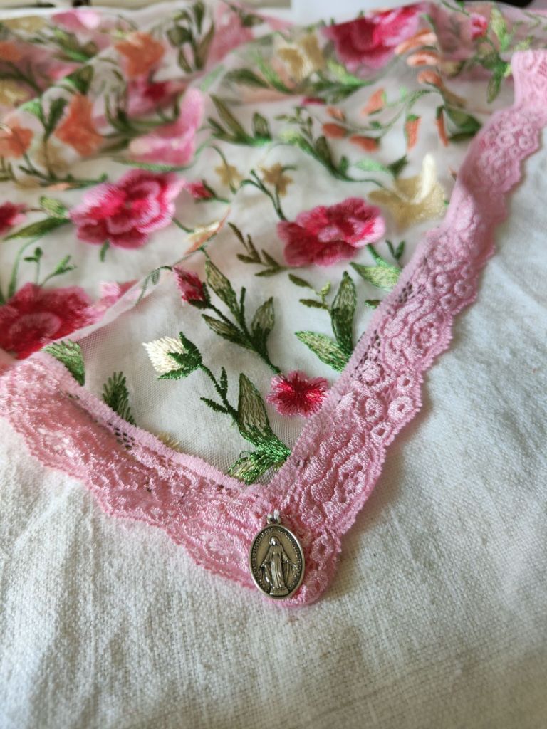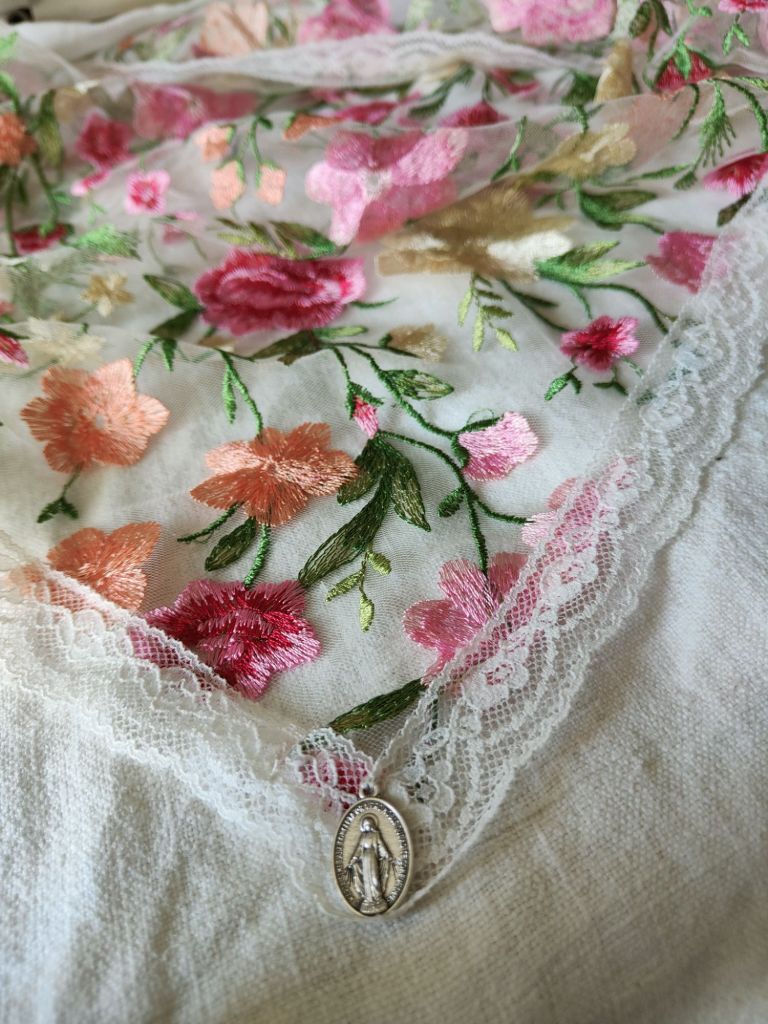 La base di tulle crema e i ricami floreali tenui e distanziati mi hanno fatto pensare al santo sposo di Maria, che con semplicità e affetto si prendeva cura della Madonna e di Gesù.