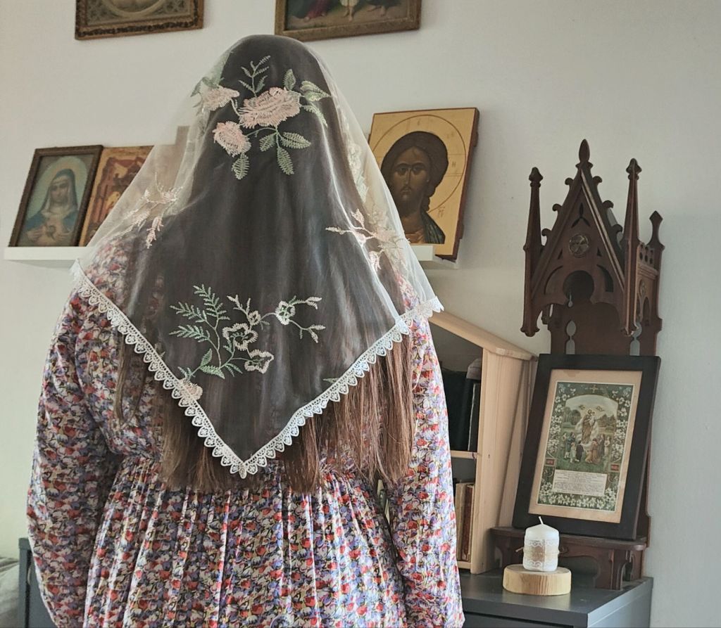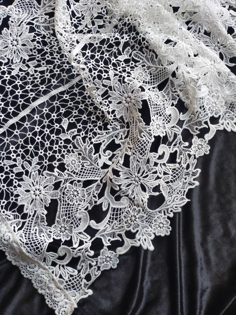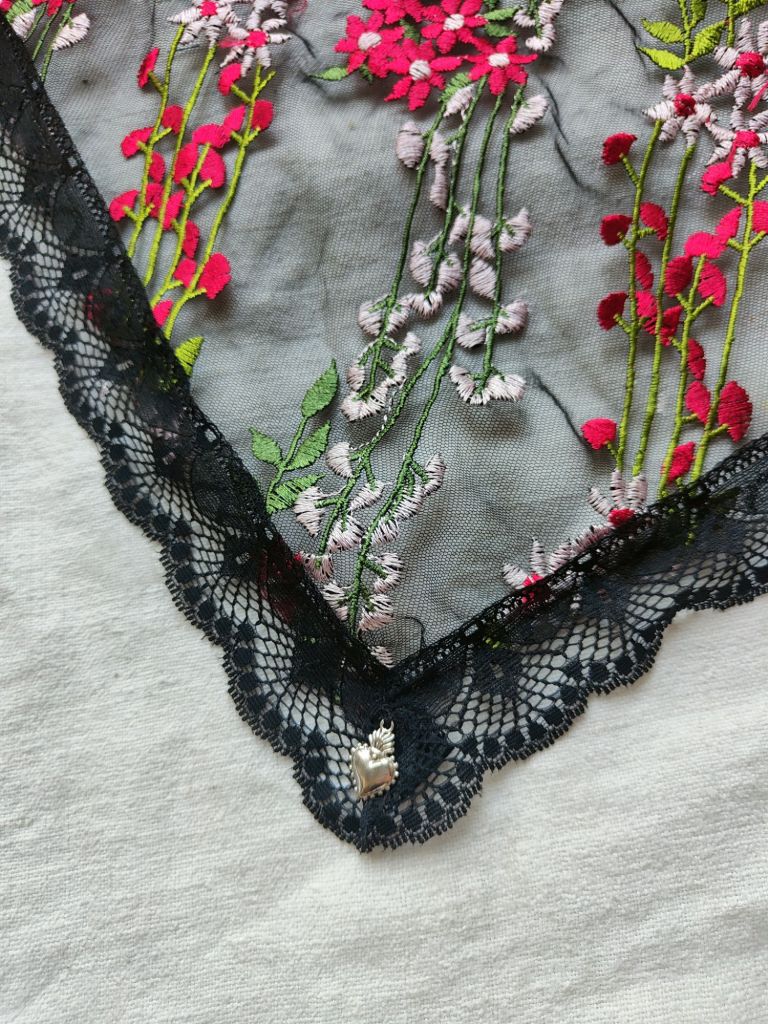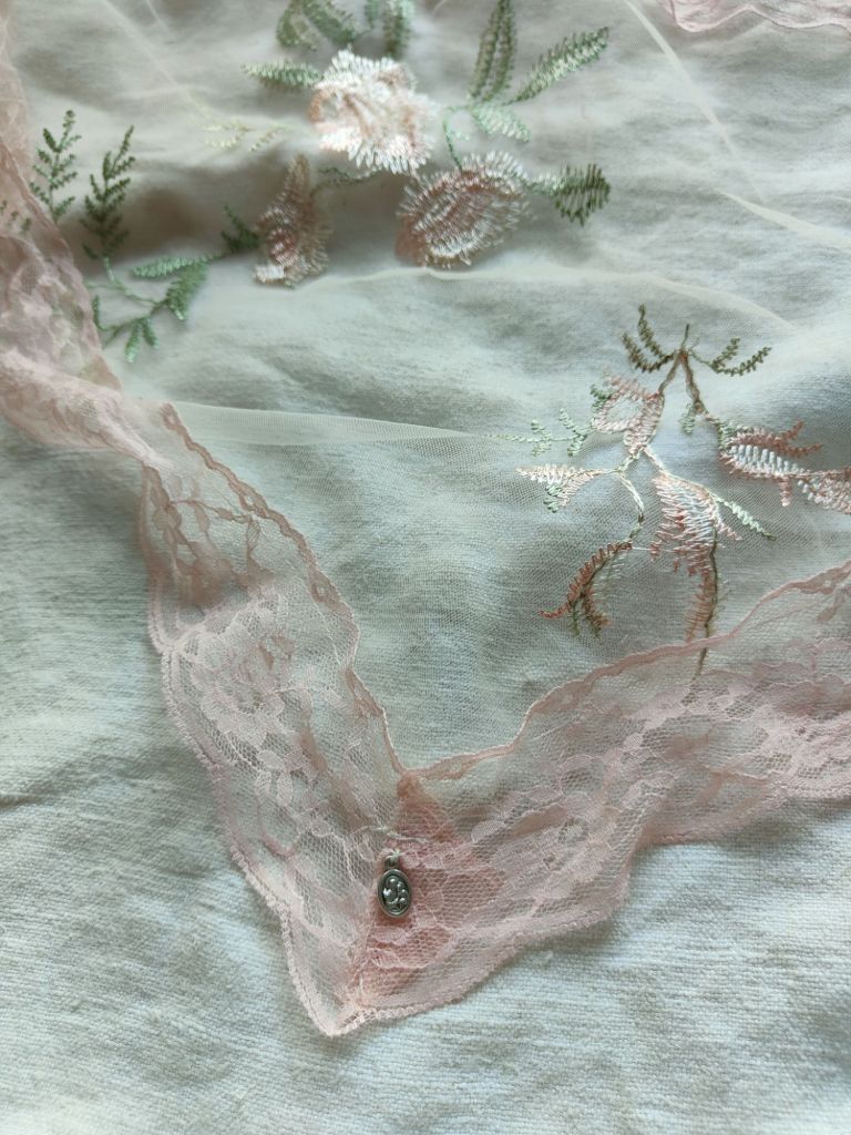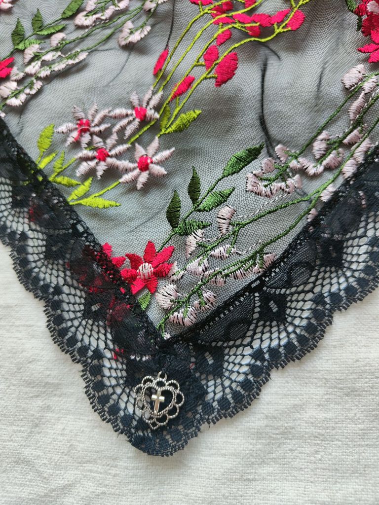 La base di tulle crema e i ricami floreali tenui e distanziati mi hanno fatto pensare al santo sposo di Maria, che con semplicità e affetto si prendeva cura della Madonna e di Gesù.