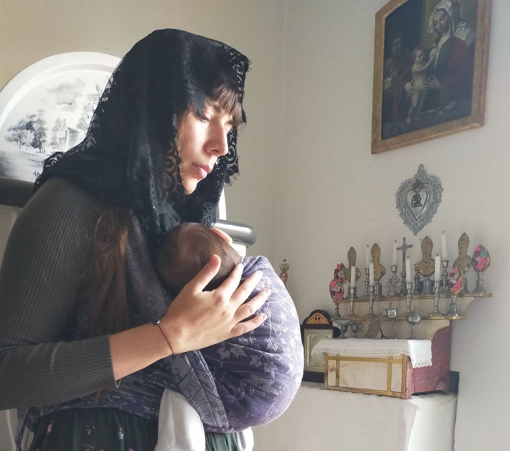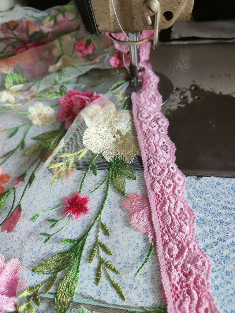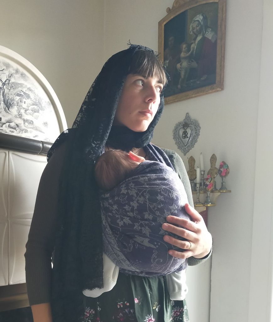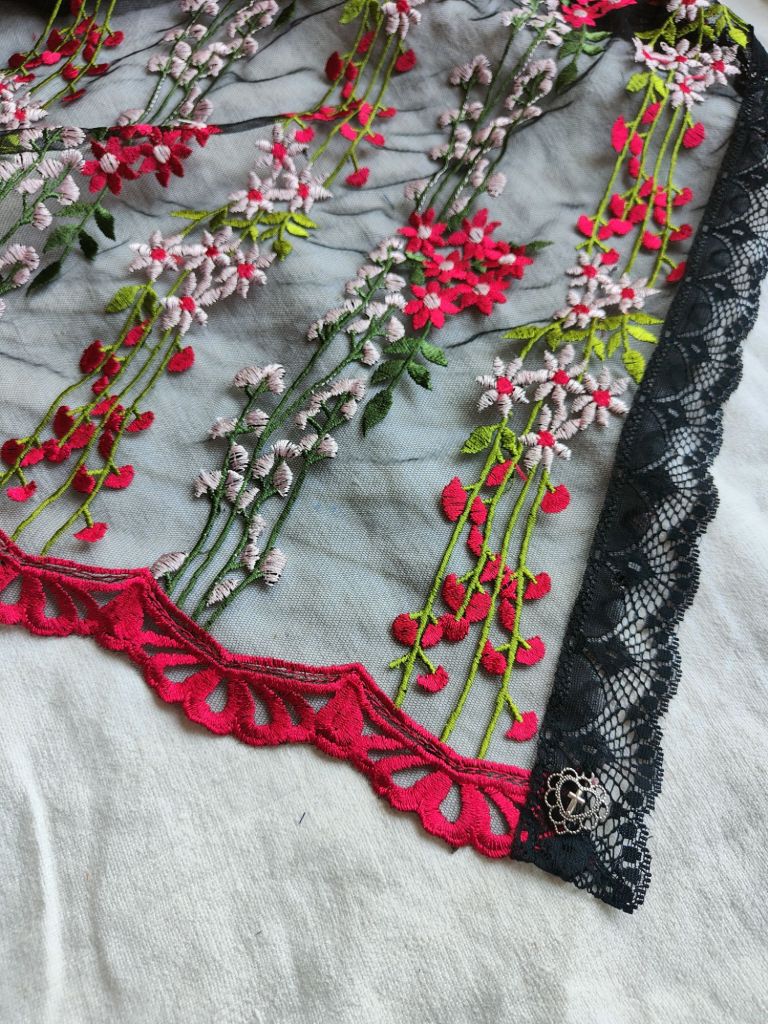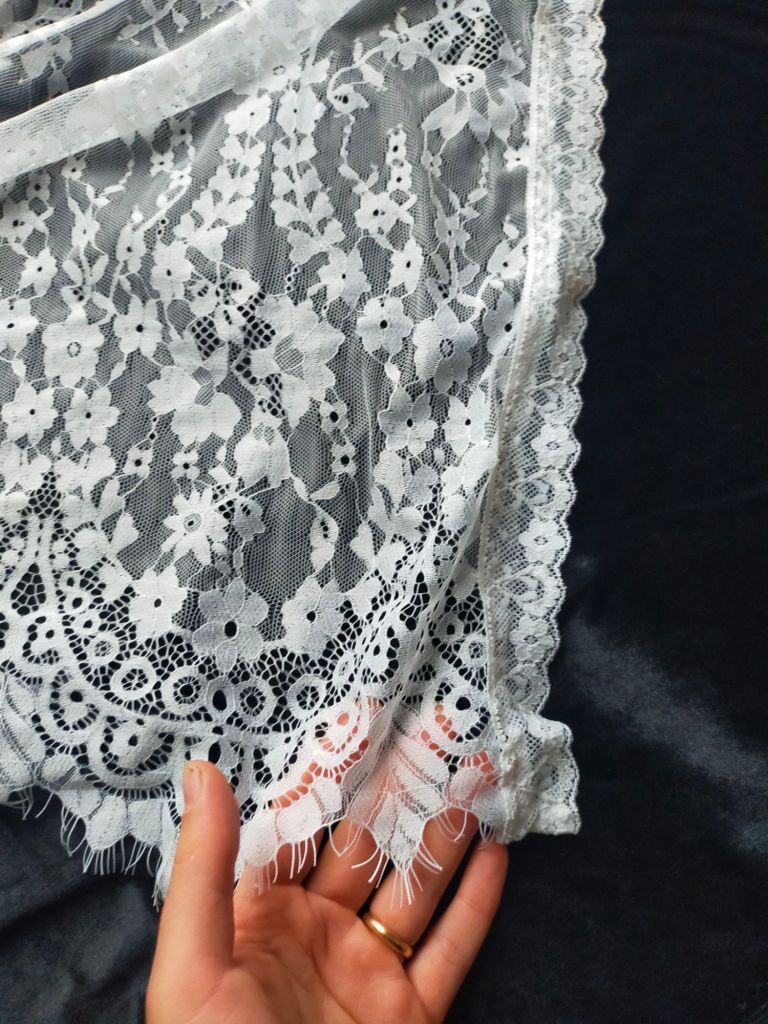 La base di tulle crema e i ricami floreali tenui e distanziati mi hanno fatto pensare al santo sposo di Maria, che con semplicità e affetto si prendeva cura della Madonna e di Gesù.