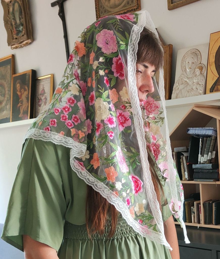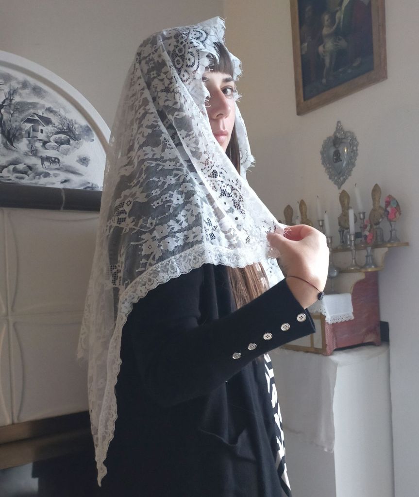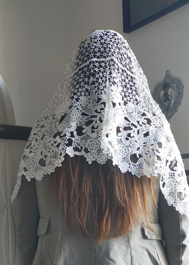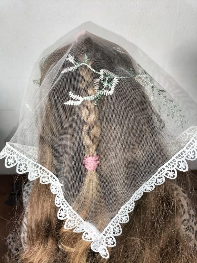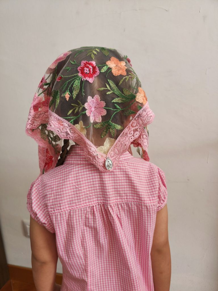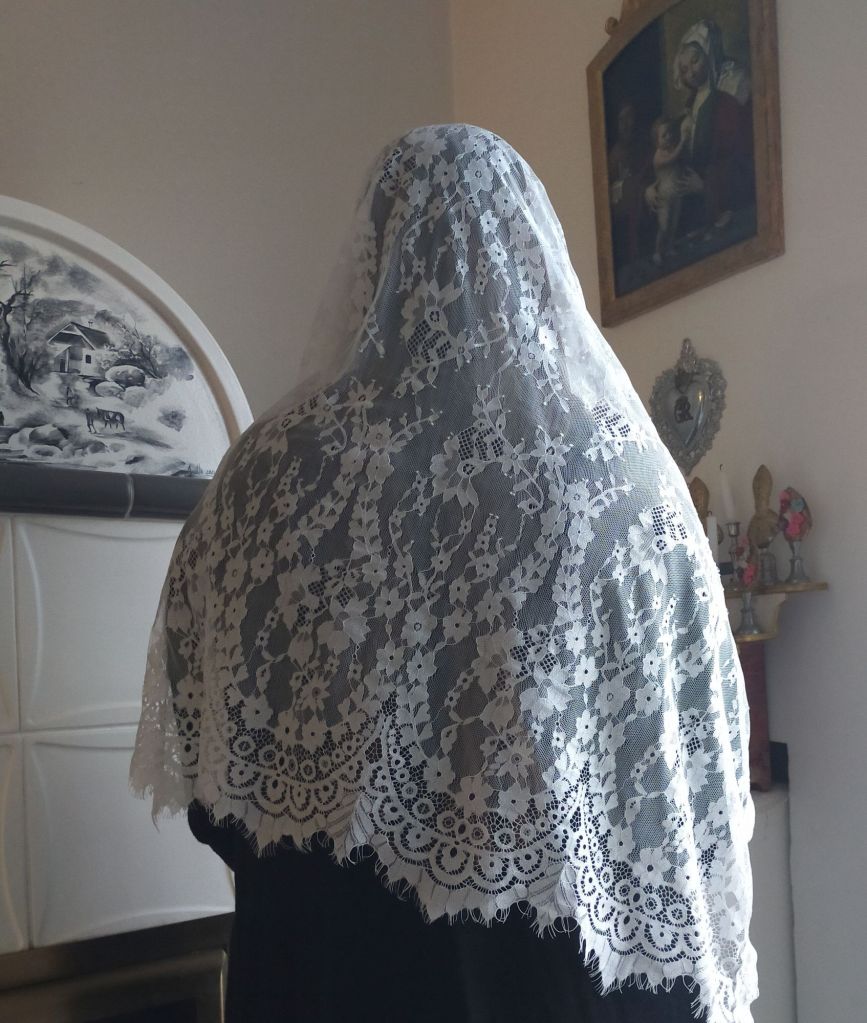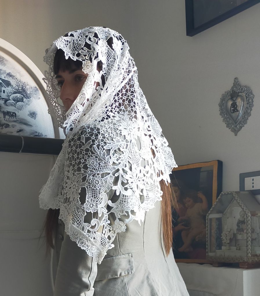 Questo modello misura 70x70x100cm, e il suo costo è di 20€. Nella punta dietro viene cucita una medaglietta. Il bordo di pizzo bianco o rosa segue tutti i bordi. Per questo modello non è necessaria la spilletta, ma può essere cucita su richiesta. Consigliato per chi si approccia per la prima volta alla pratica del velo muliebre, perché poco ingombrante, e per le bambine dai 6 anni in su.