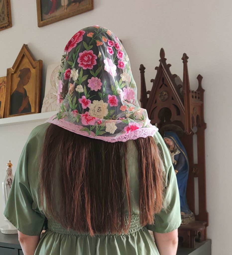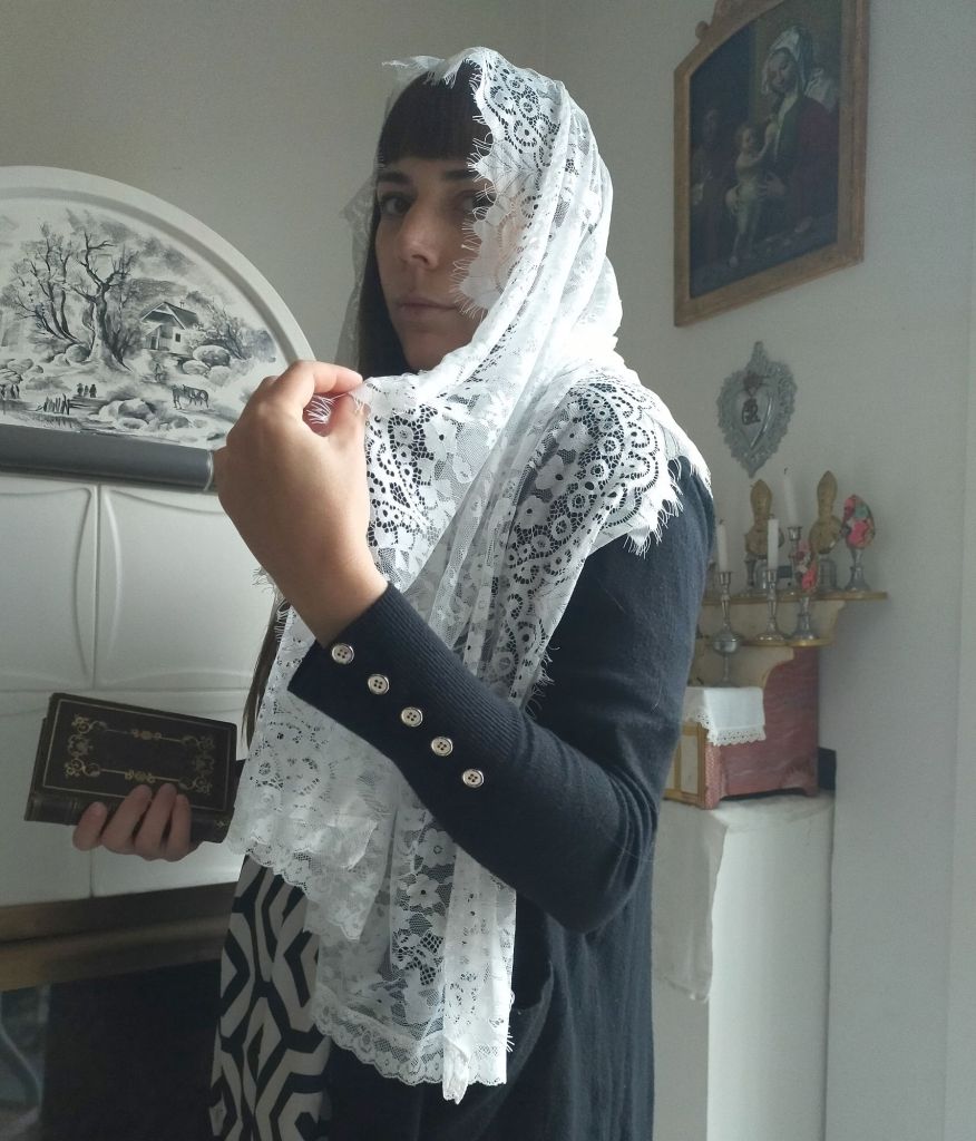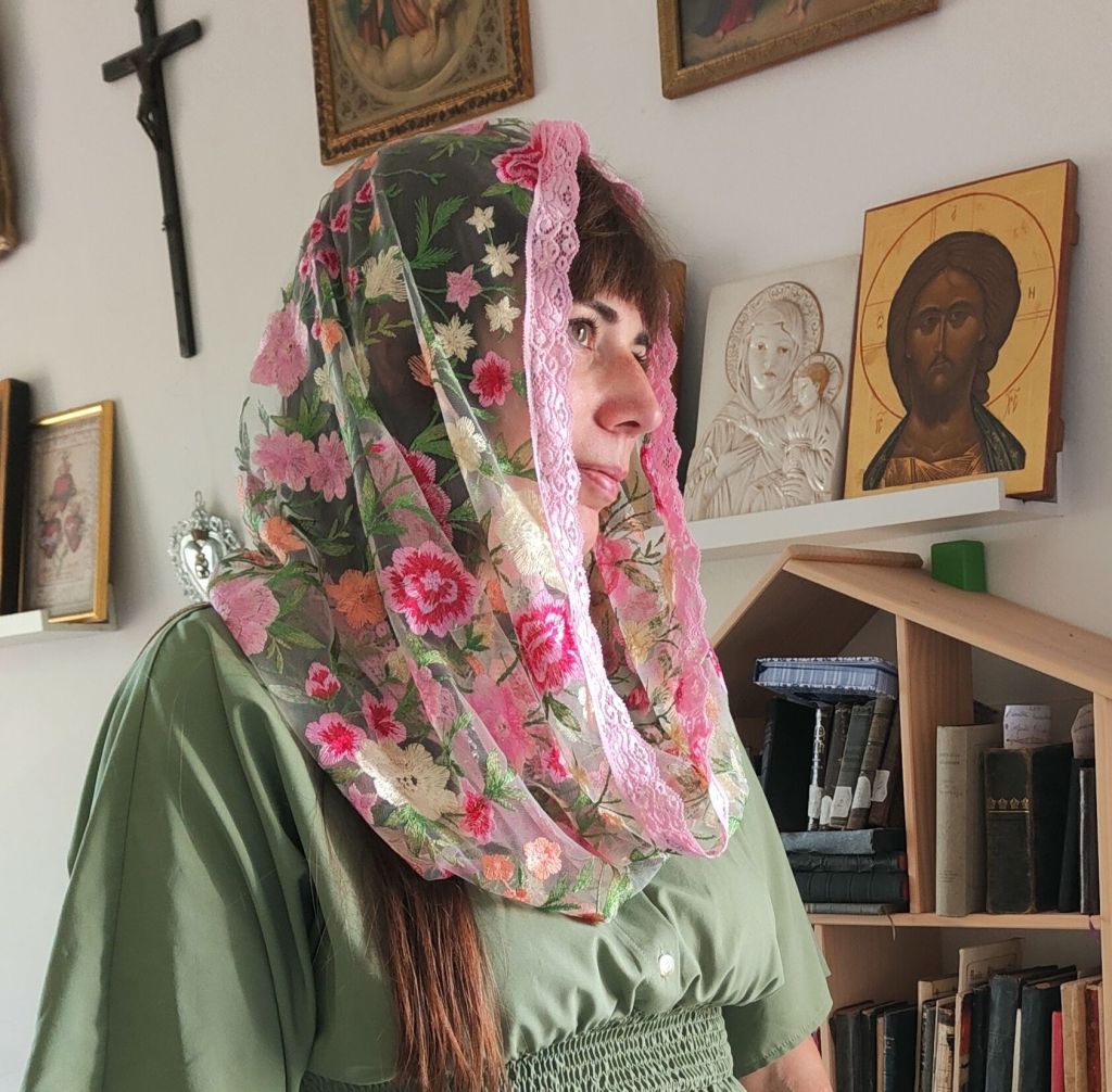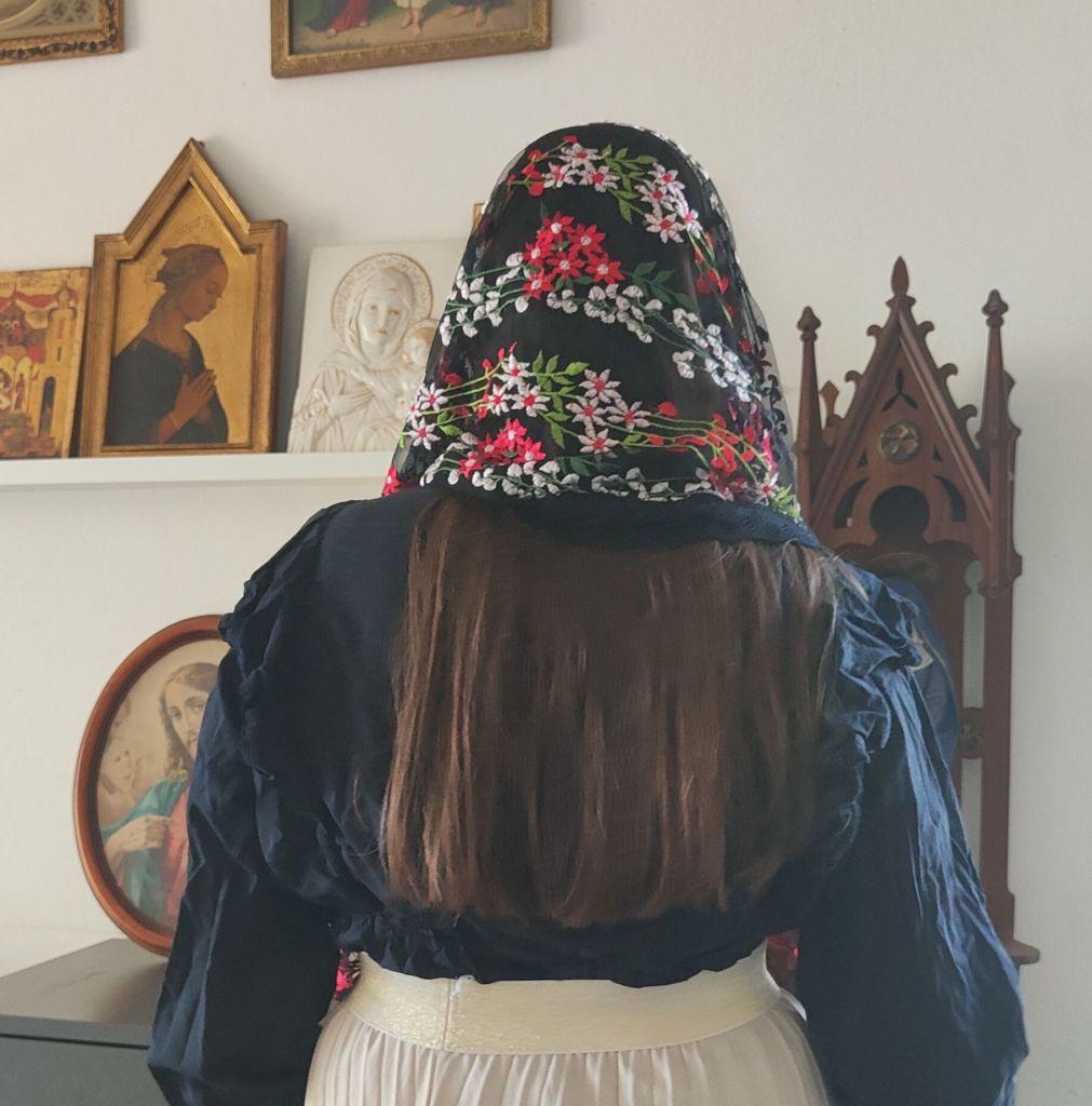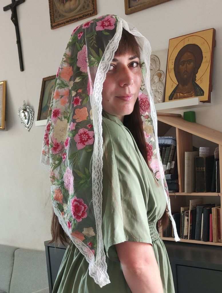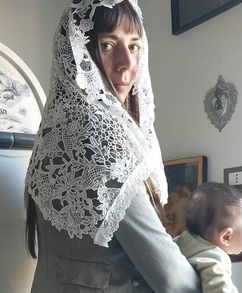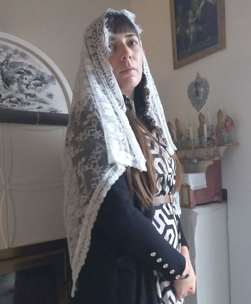 Questo modello misura 70x70x100cm, e il suo costo è di 20€. Nella punta dietro viene cucita una medaglietta. Il bordo di pizzo bianco o rosa segue tutti i bordi. Per questo modello non è necessaria la spilletta, ma può essere cucita su richiesta. Consigliato per chi si approccia per la prima volta alla pratica del velo muliebre, perché poco ingombrante, e per le bambine dai 6 anni in su.