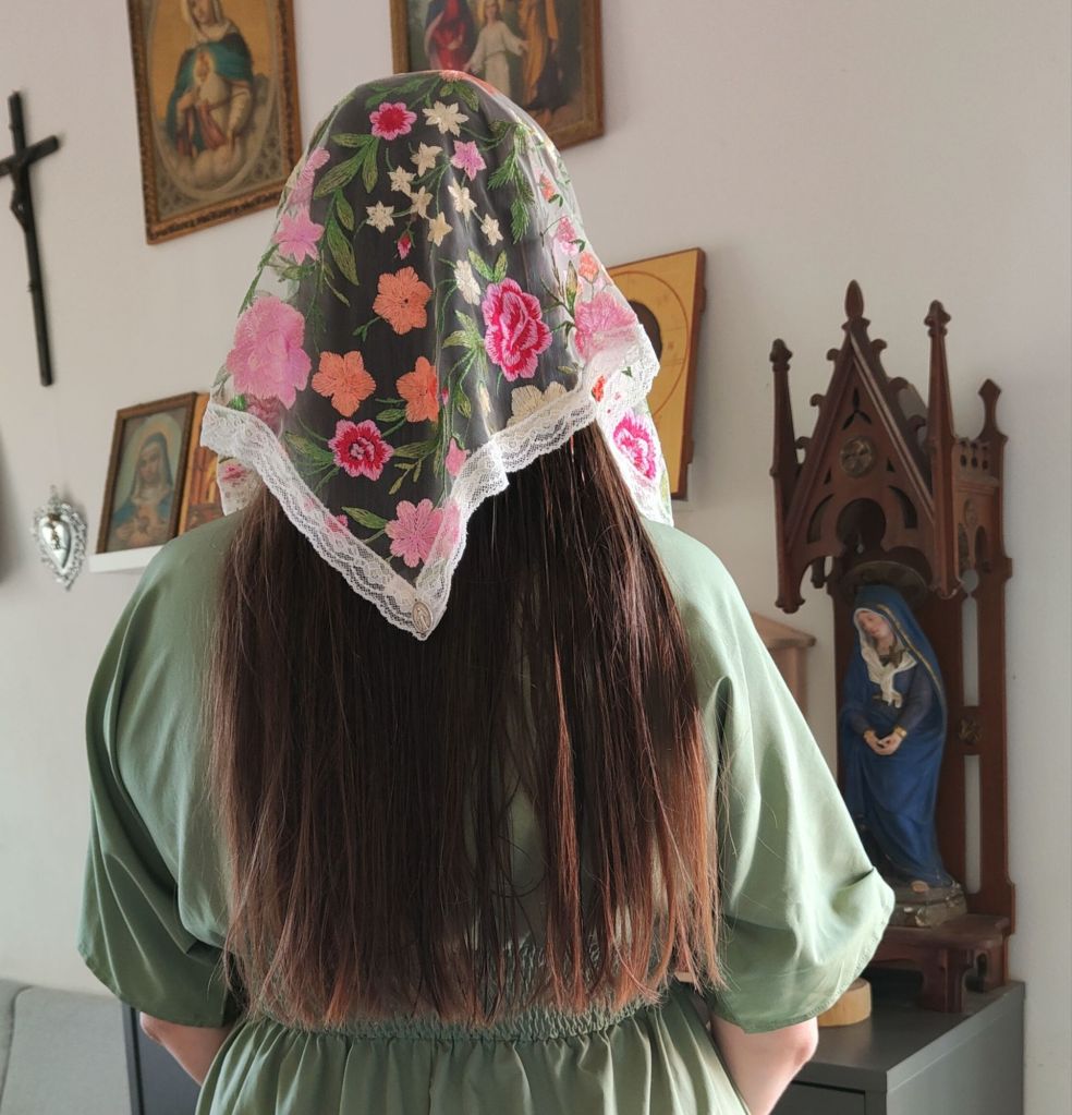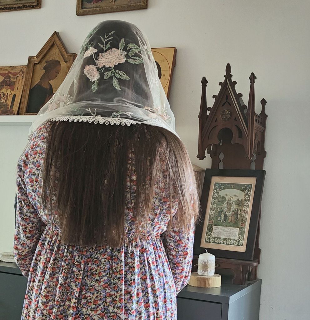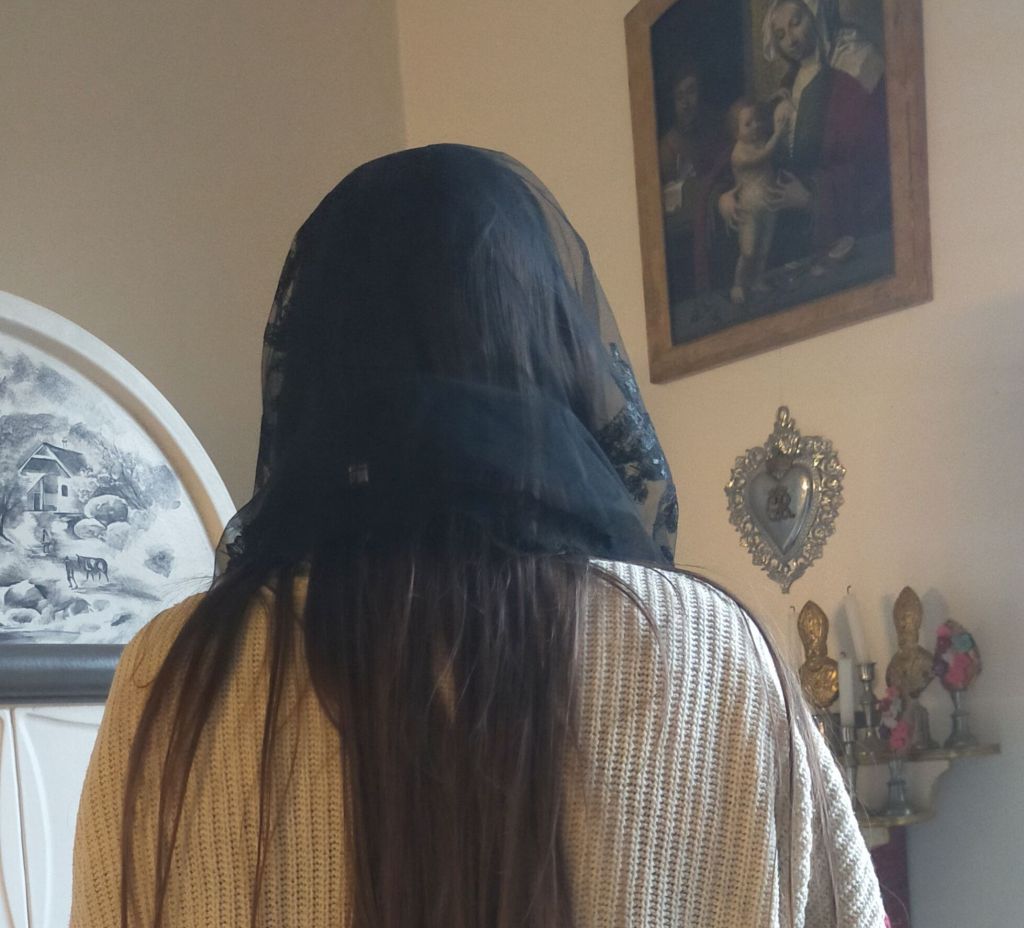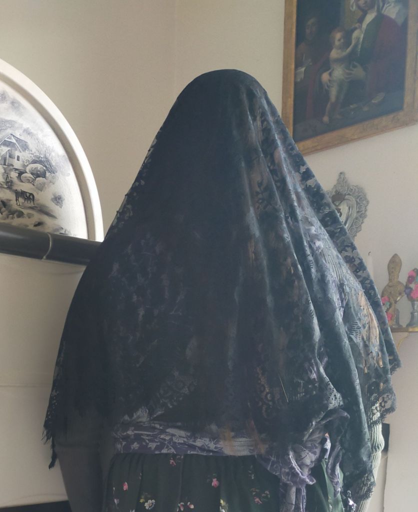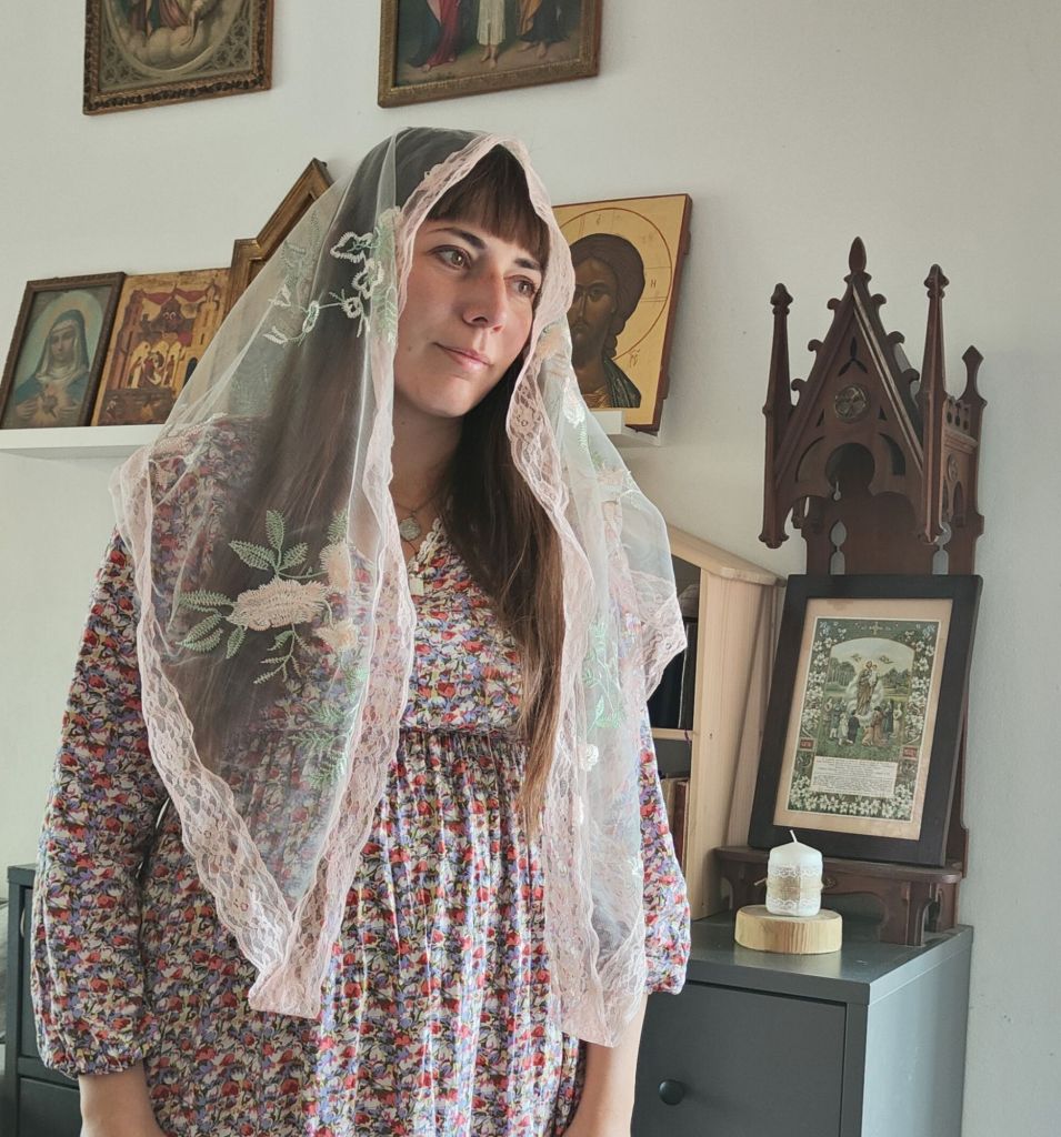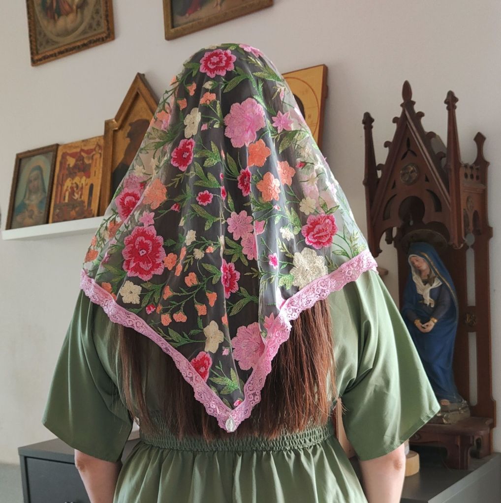 Questo modello misura 70x70x100cm, e il suo costo è di 20€. Nella punta dietro viene cucita una medaglietta. Il bordo di pizzo bianco o rosa segue tutti i bordi. Per questo modello non è necessaria la spilletta, ma può essere cucita su richiesta. Consigliato per chi si approccia per la prima volta alla pratica del velo muliebre, perché poco ingombrante, e per le bambine dai 6 anni in su.