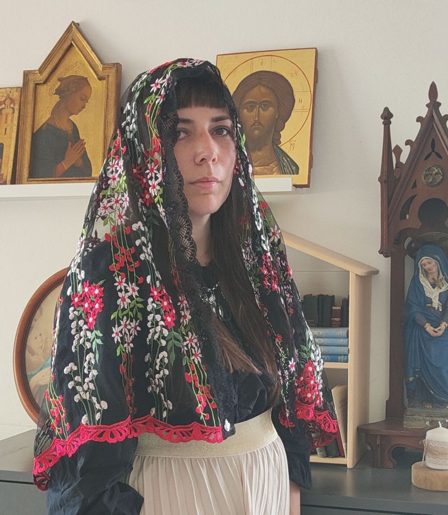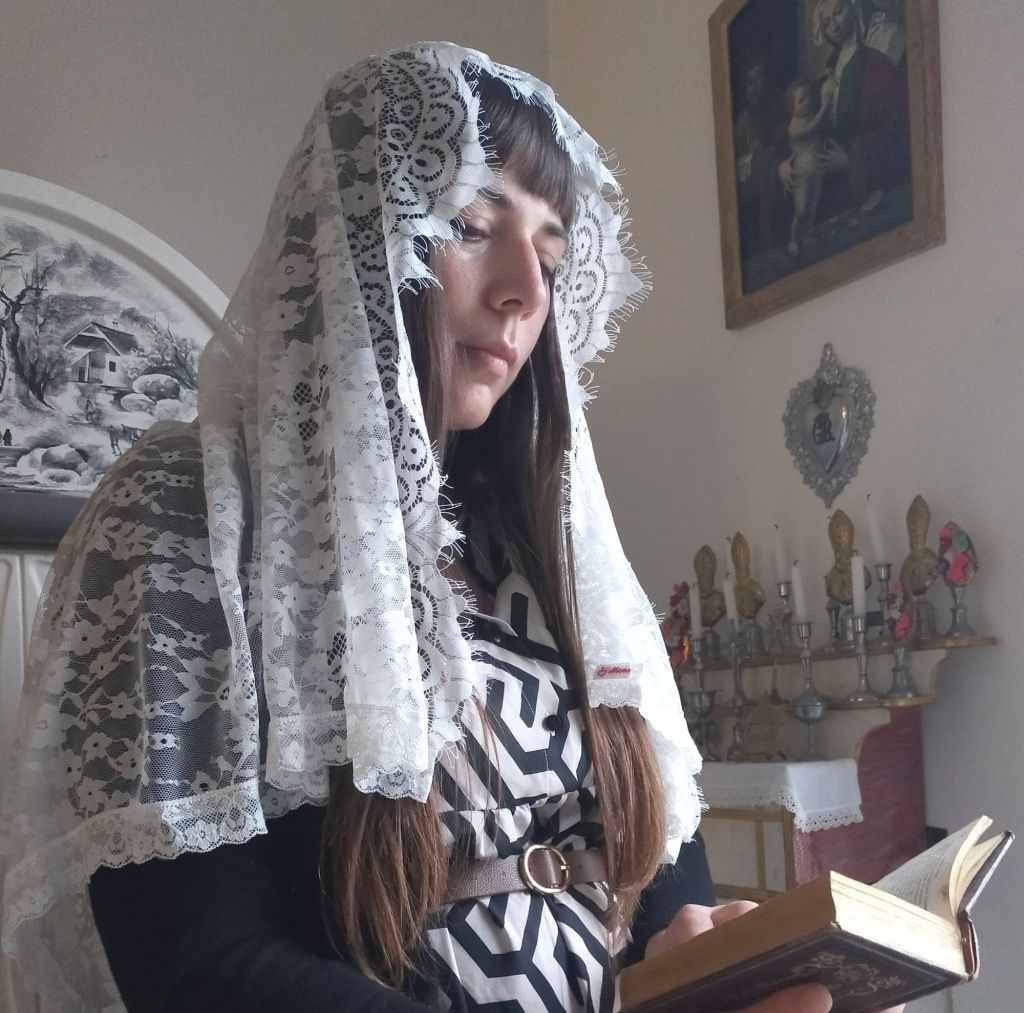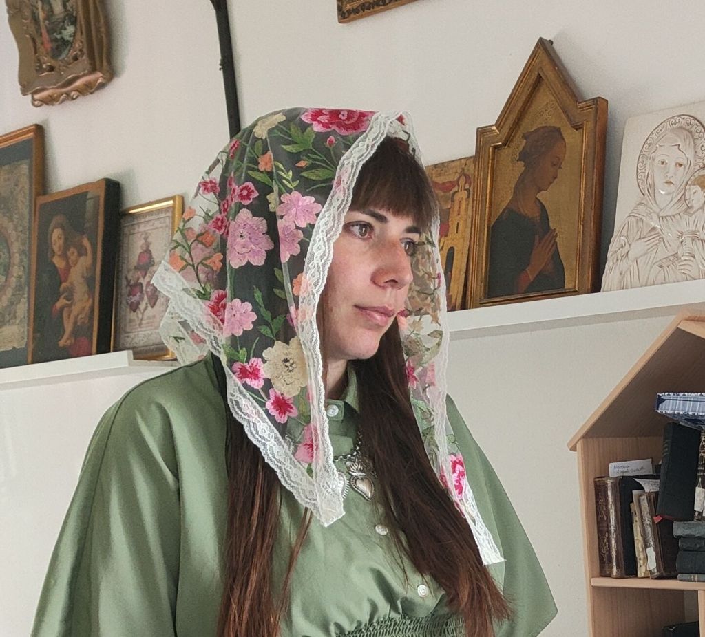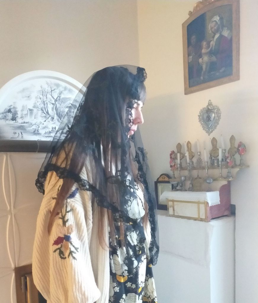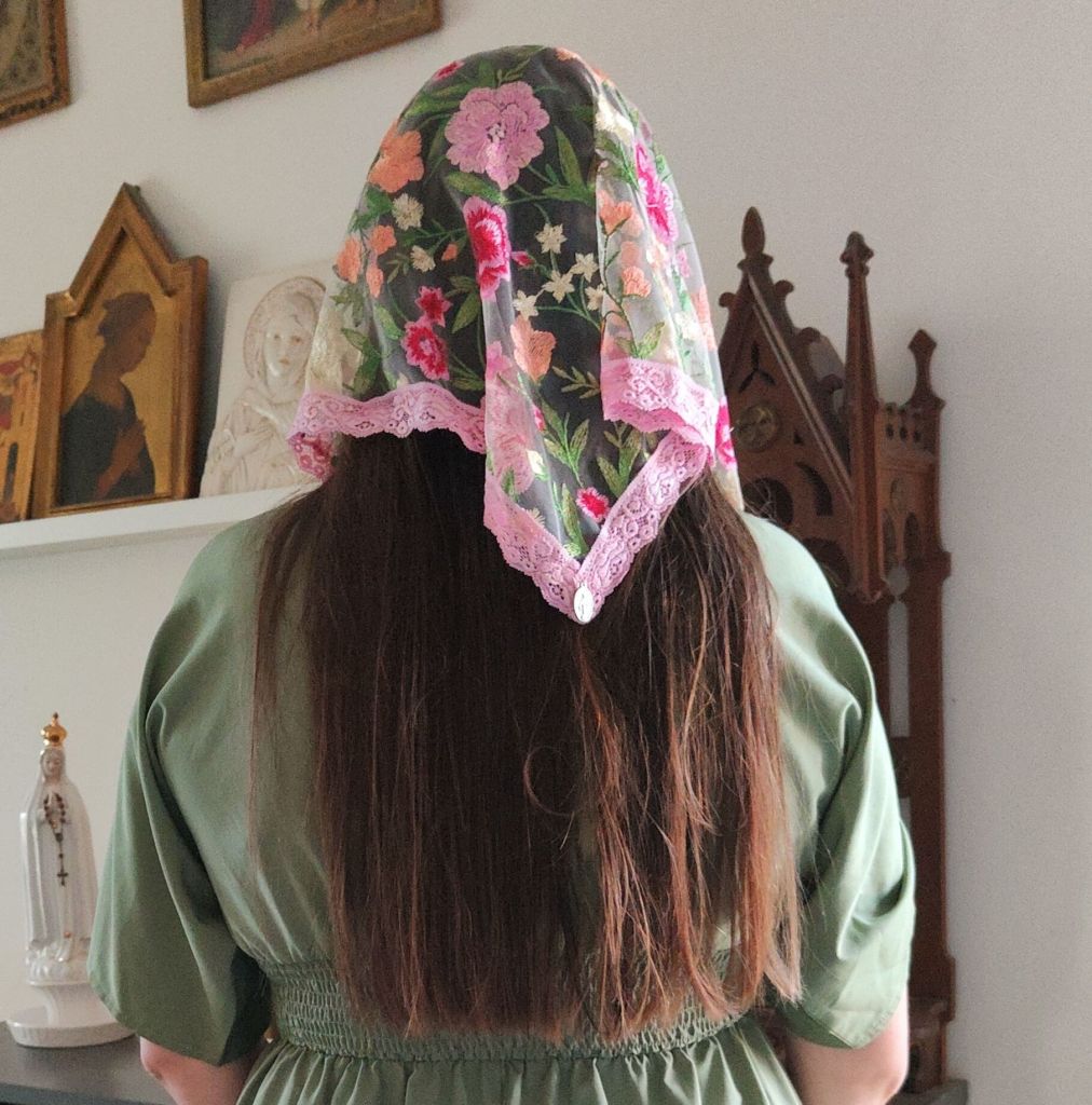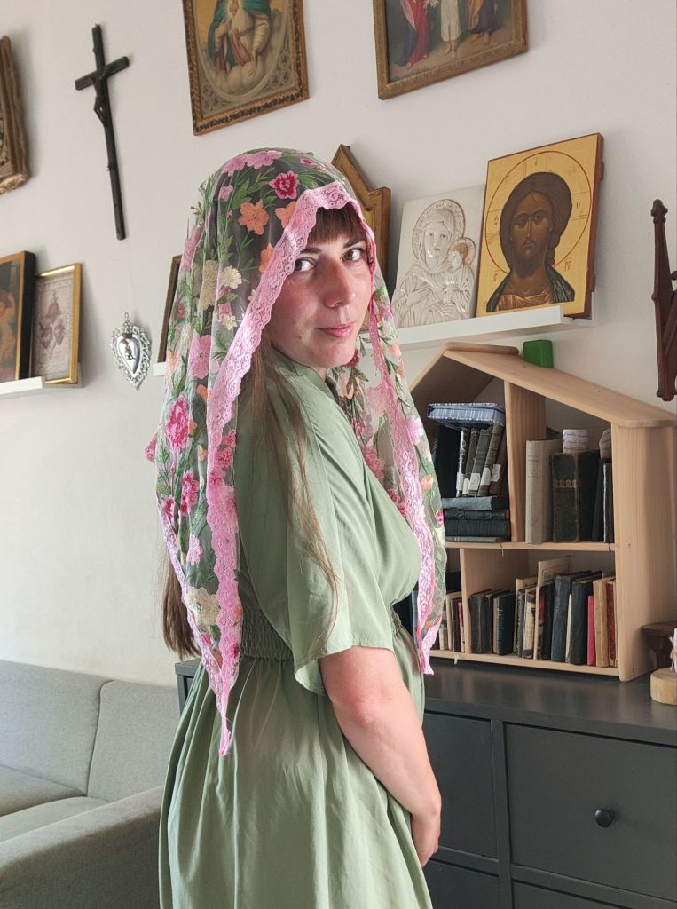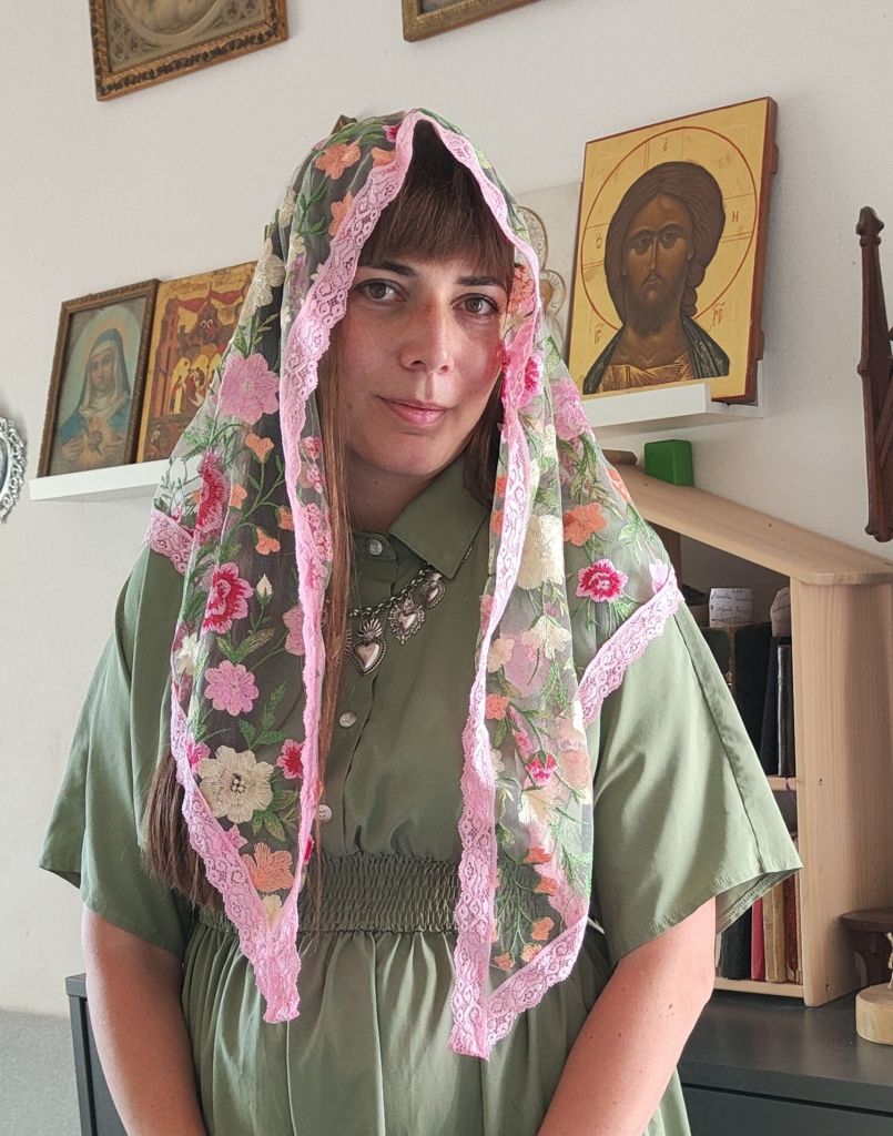 Questo modello misura 70x70x100cm, e il suo costo è di 20€. Nella punta dietro viene cucita una medaglietta. Il bordo di pizzo bianco o rosa segue tutti i bordi. Per questo modello non è necessaria la spilletta, ma può essere cucita su richiesta. Consigliato per chi si approccia per la prima volta alla pratica del velo muliebre, perché poco ingombrante, e per le bambine dai 6 anni in su.