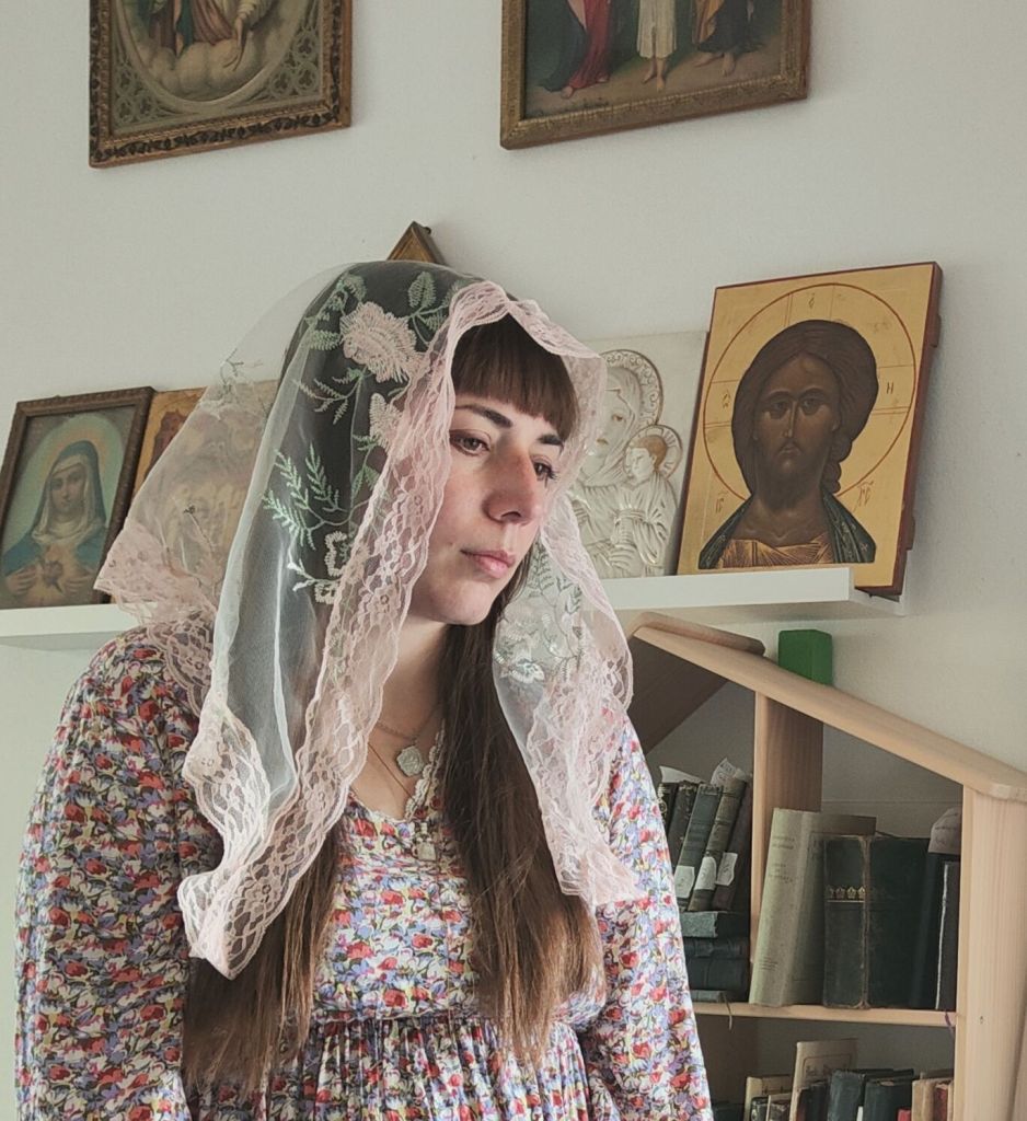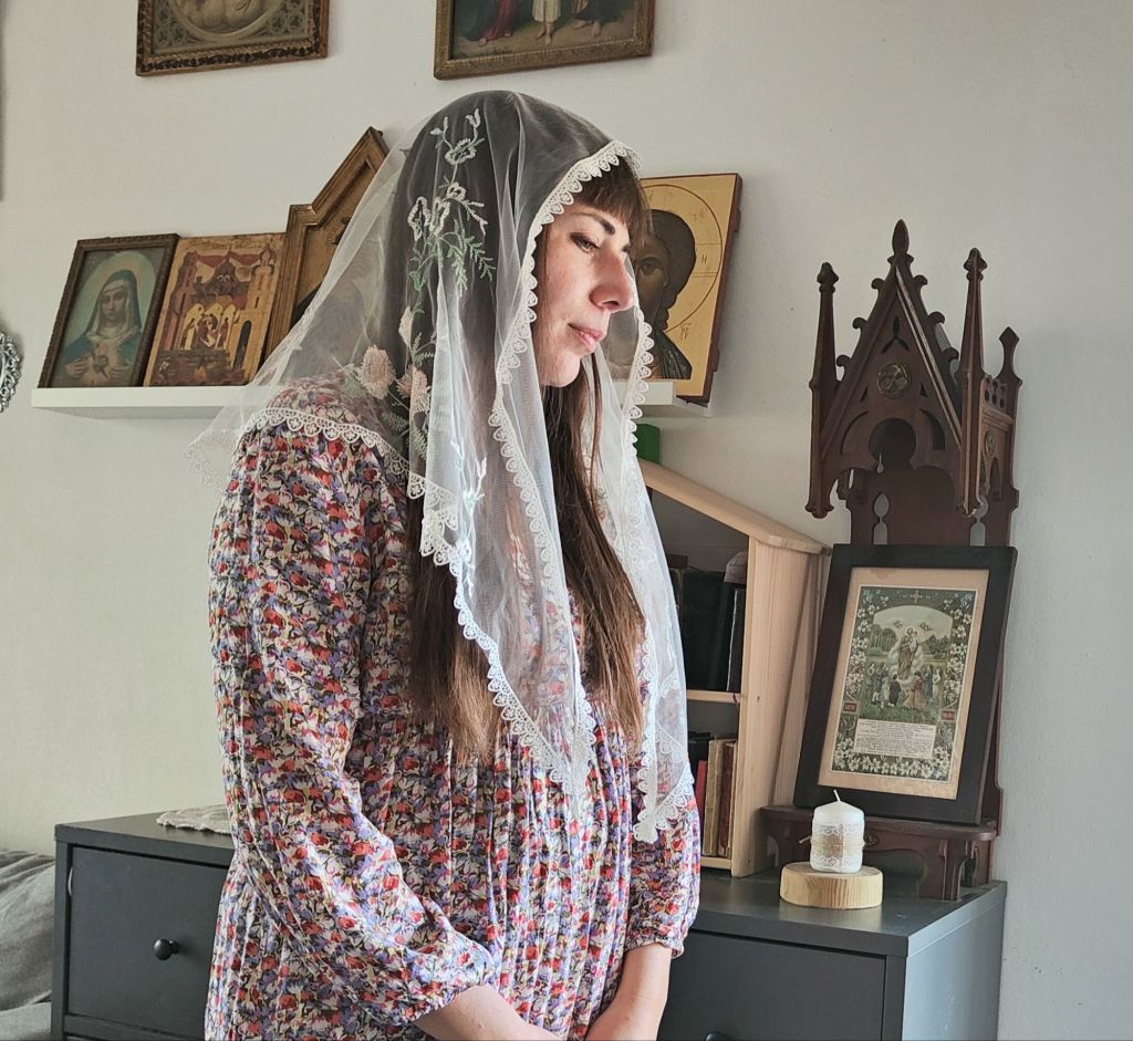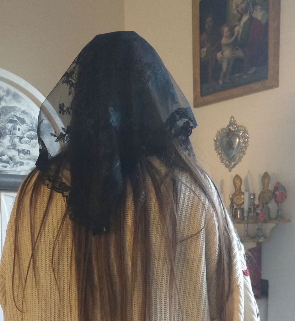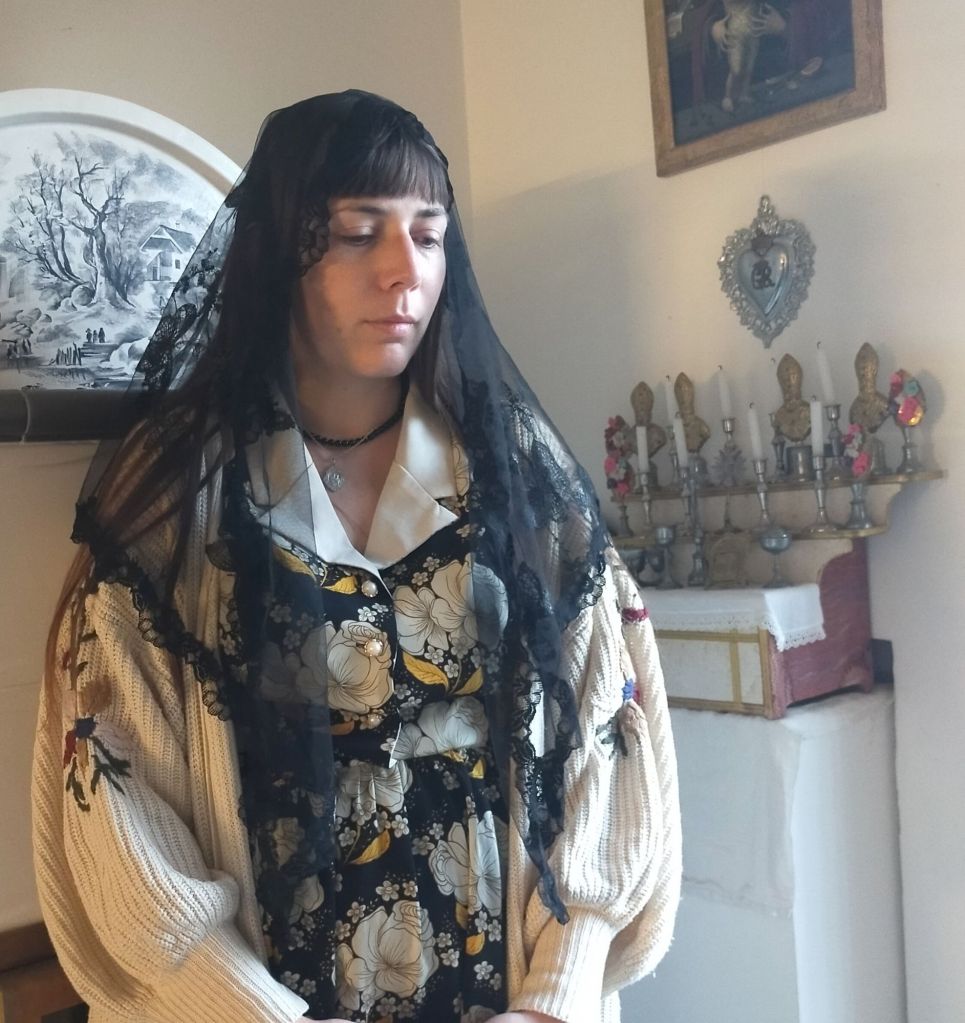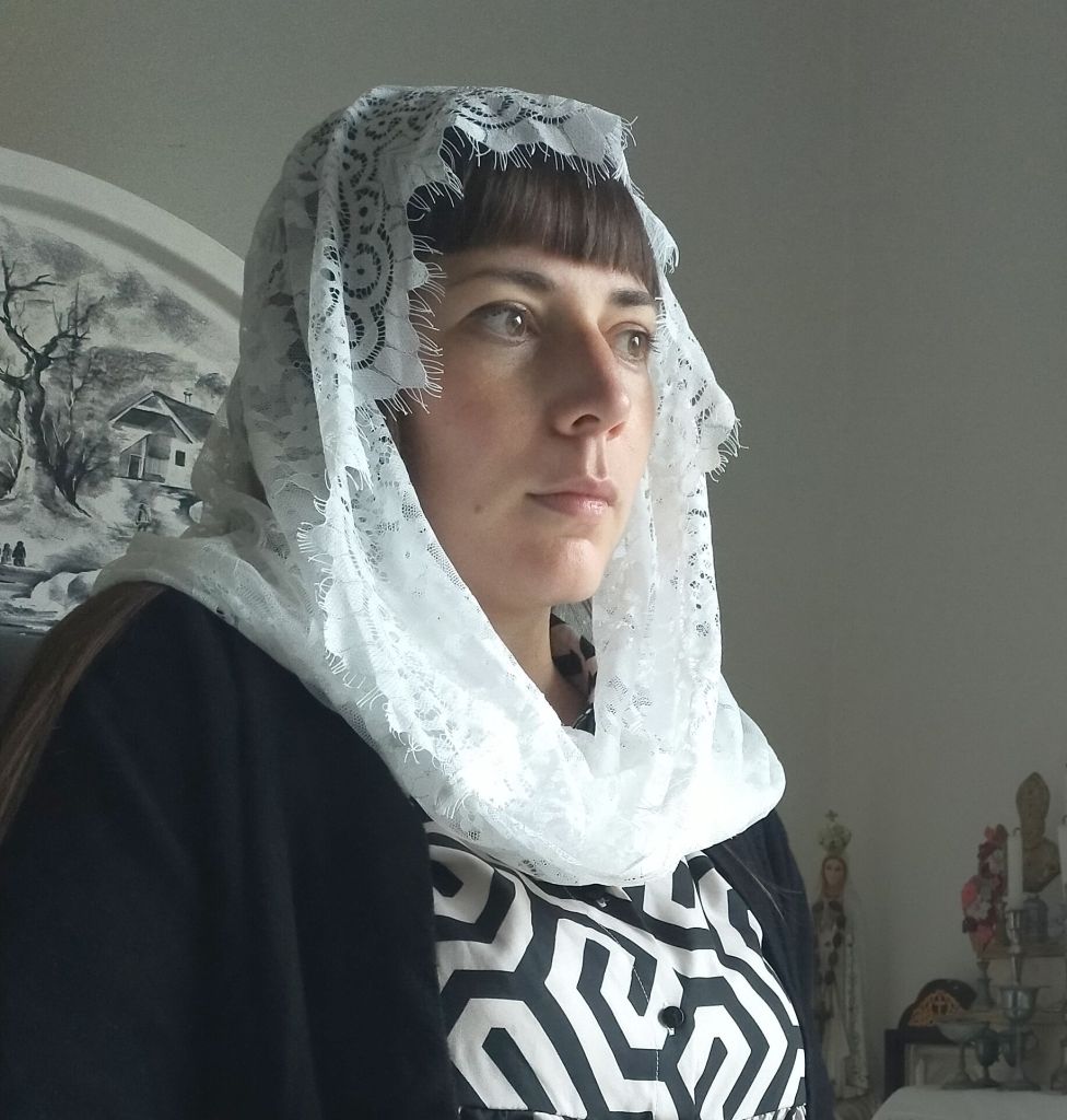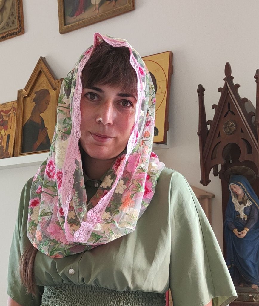 Questo modello misura 70x70x100cm, e il suo costo è di 20€. Nella punta dietro viene cucita una medaglietta. Il bordo di pizzo bianco o rosa segue tutti i bordi. Per questo modello non è necessaria la spilletta, ma può essere cucita su richiesta. Consigliato per chi si approccia per la prima volta alla pratica del velo muliebre, perché poco ingombrante, e per le bambine dai 6 anni in su.