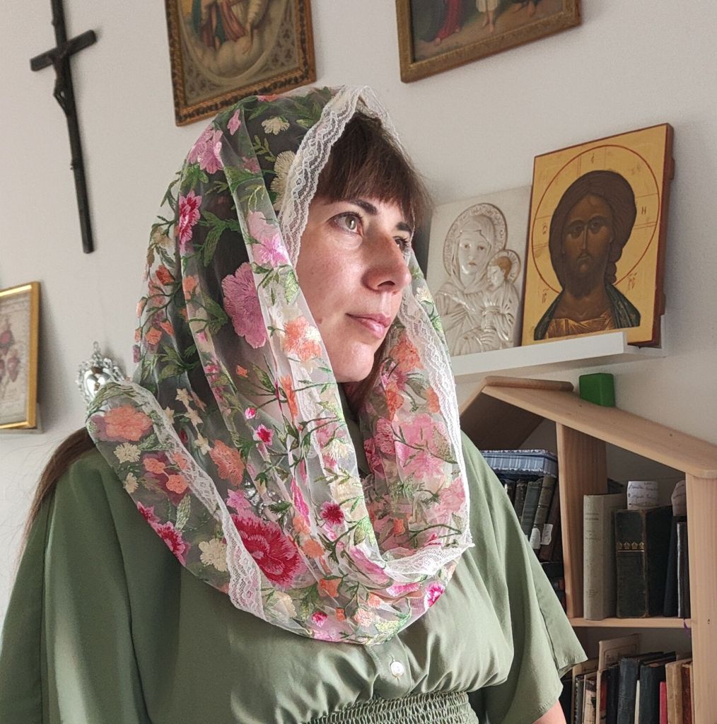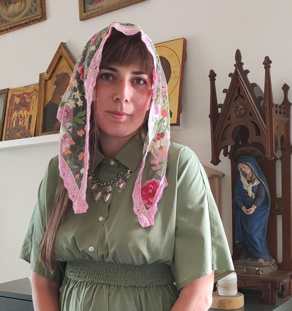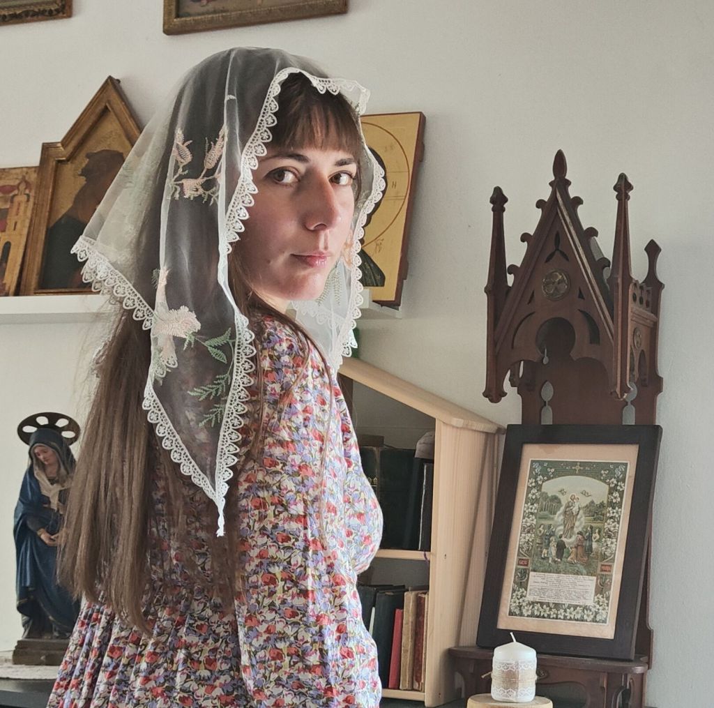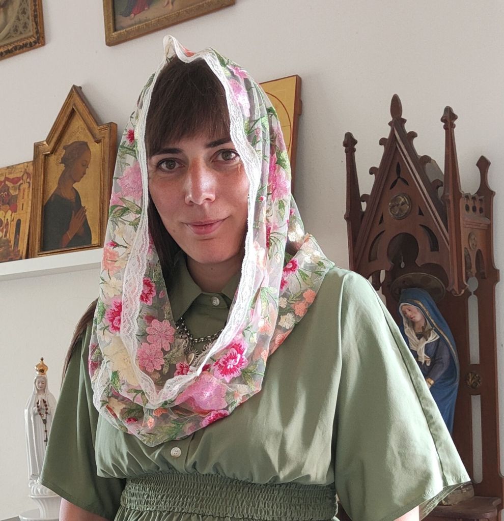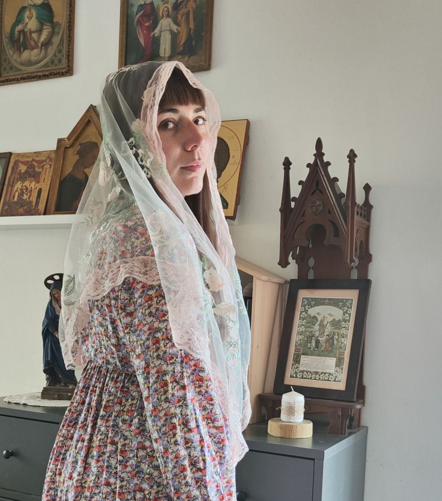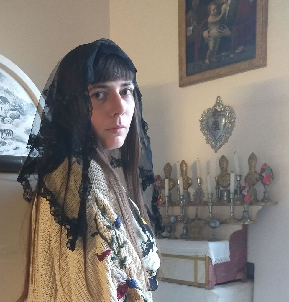 Questo modello misura 70x70x100cm, e il suo costo è di 20€. Nella punta dietro viene cucita una medaglietta. Il bordo di pizzo bianco o rosa segue tutti i bordi. Per questo modello non è necessaria la spilletta, ma può essere cucita su richiesta. Consigliato per chi si approccia per la prima volta alla pratica del velo muliebre, perché poco ingombrante, e per le bambine dai 6 anni in su.