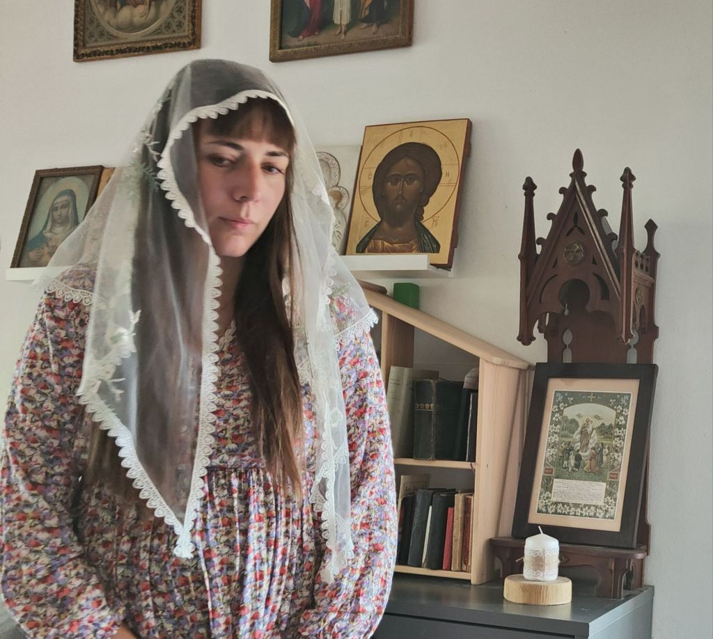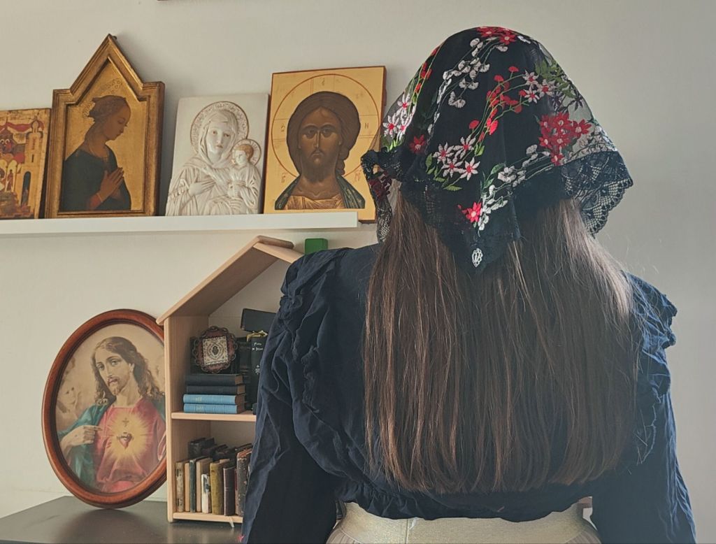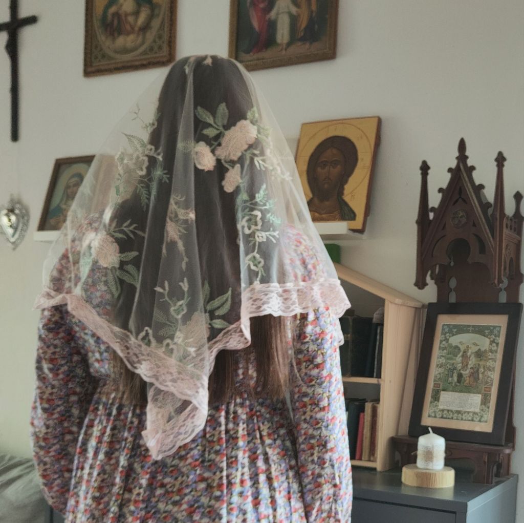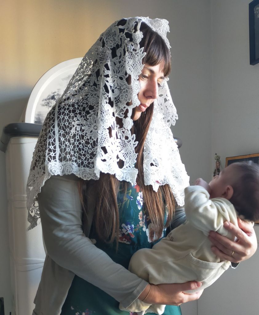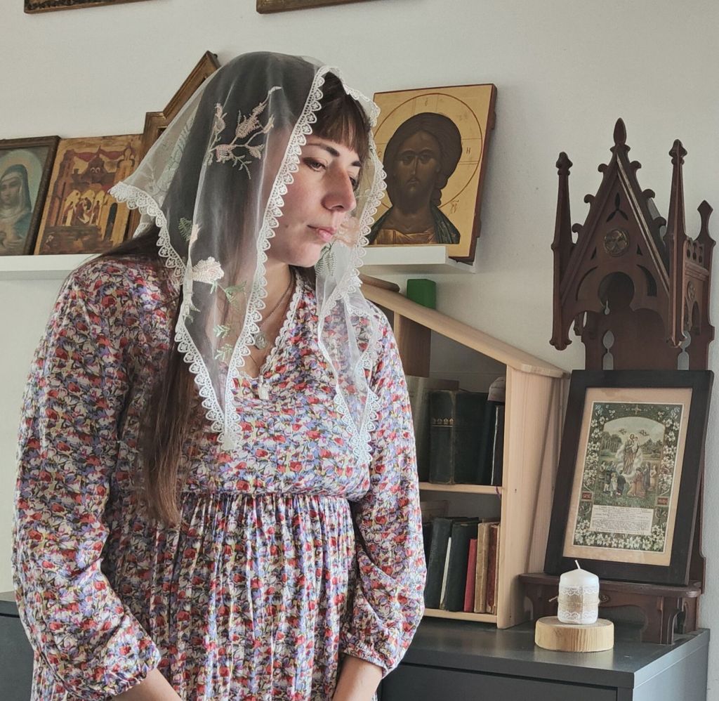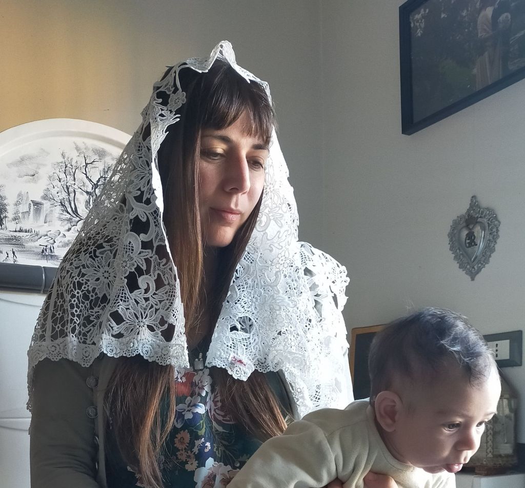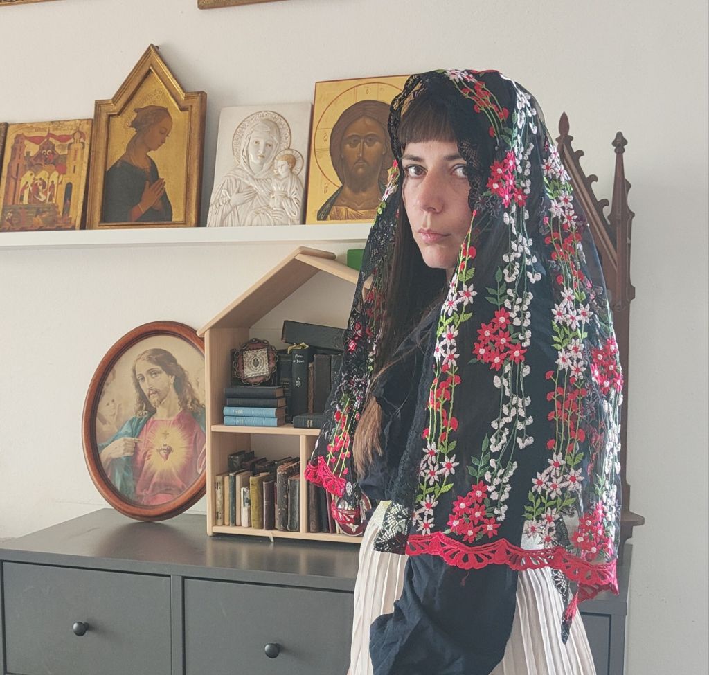 Questo modello misura 70x70x100cm, e il suo costo è di 20€. Nella punta dietro viene cucita una medaglietta. Il bordo di pizzo bianco o rosa segue tutti i bordi. Per questo modello non è necessaria la spilletta, ma può essere cucita su richiesta. Consigliato per chi si approccia per la prima volta alla pratica del velo muliebre, perché poco ingombrante, e per le bambine dai 6 anni in su.