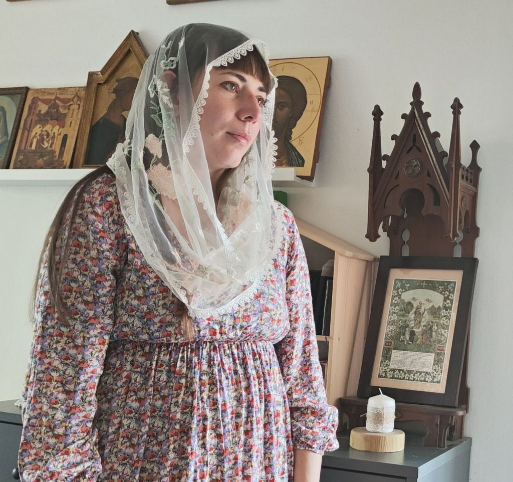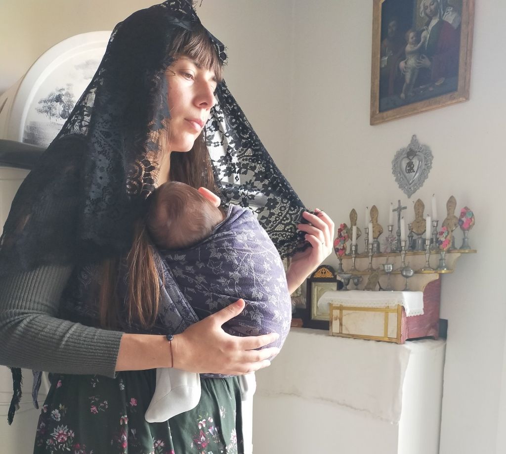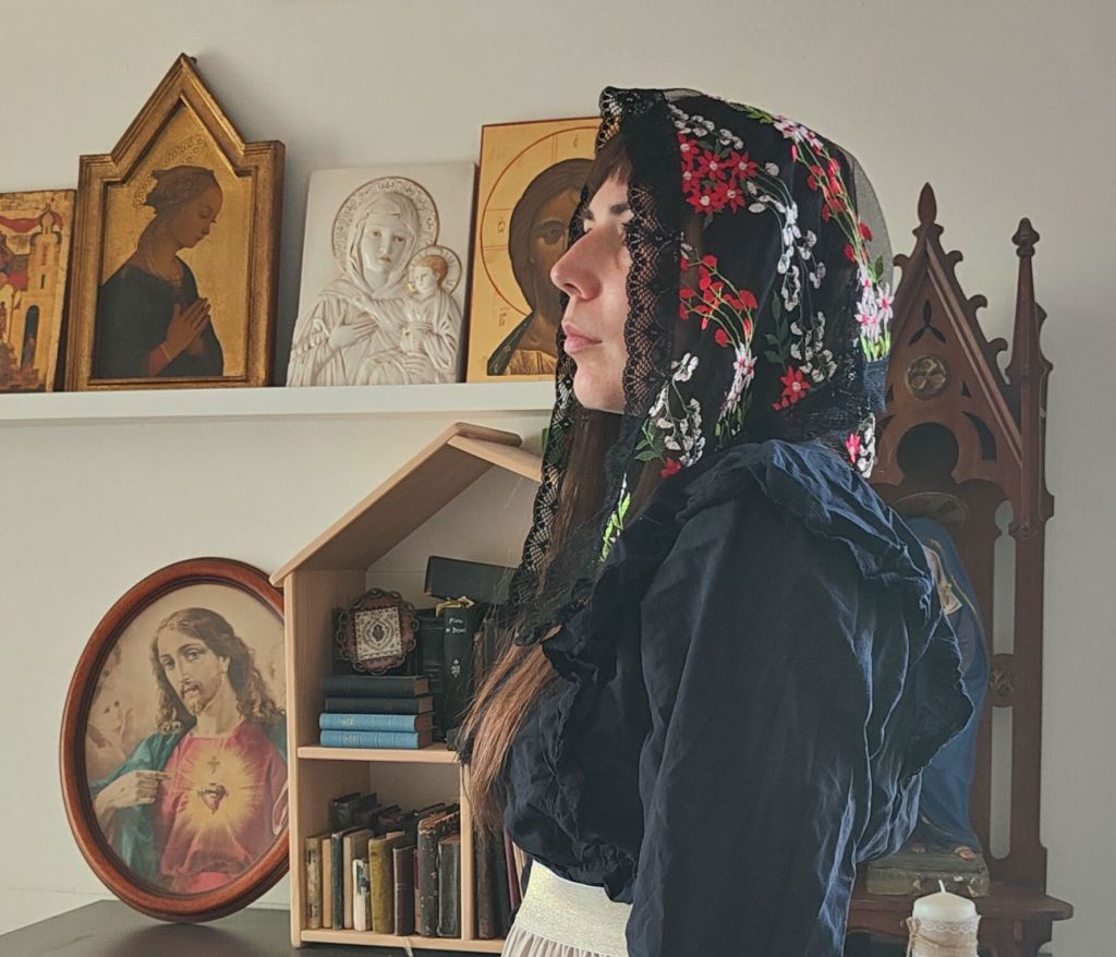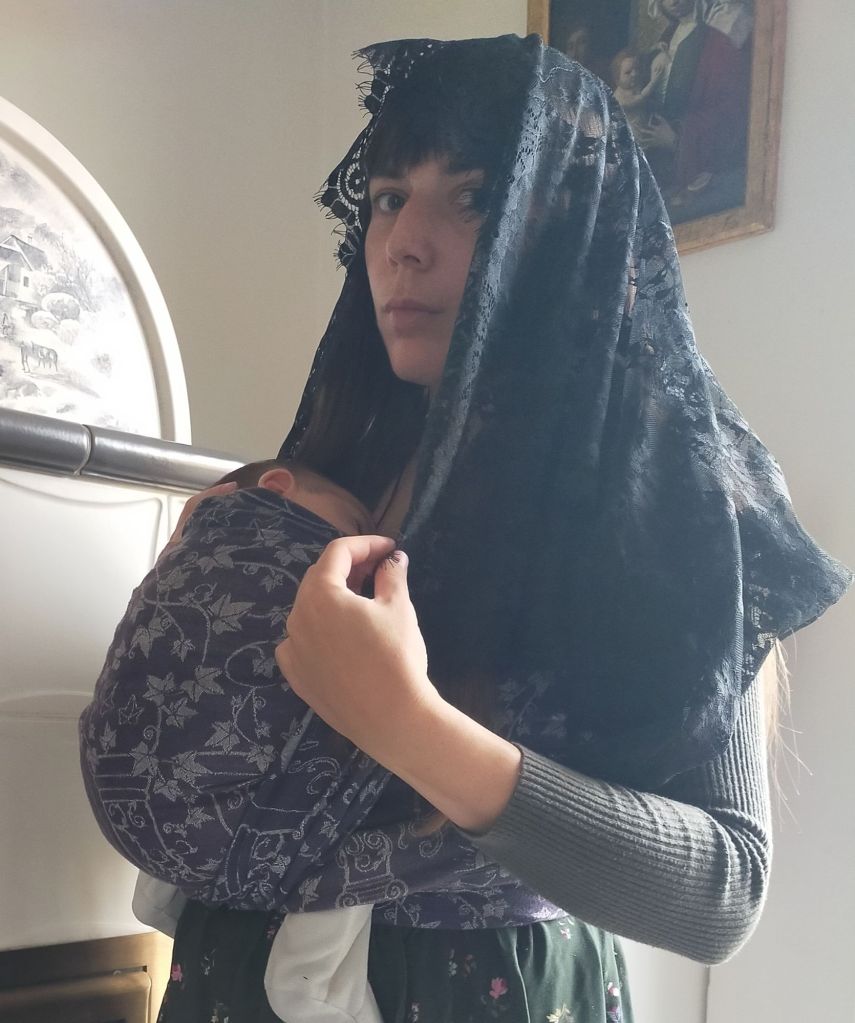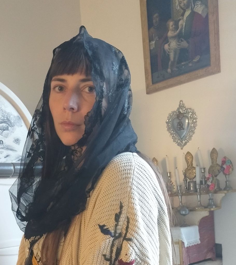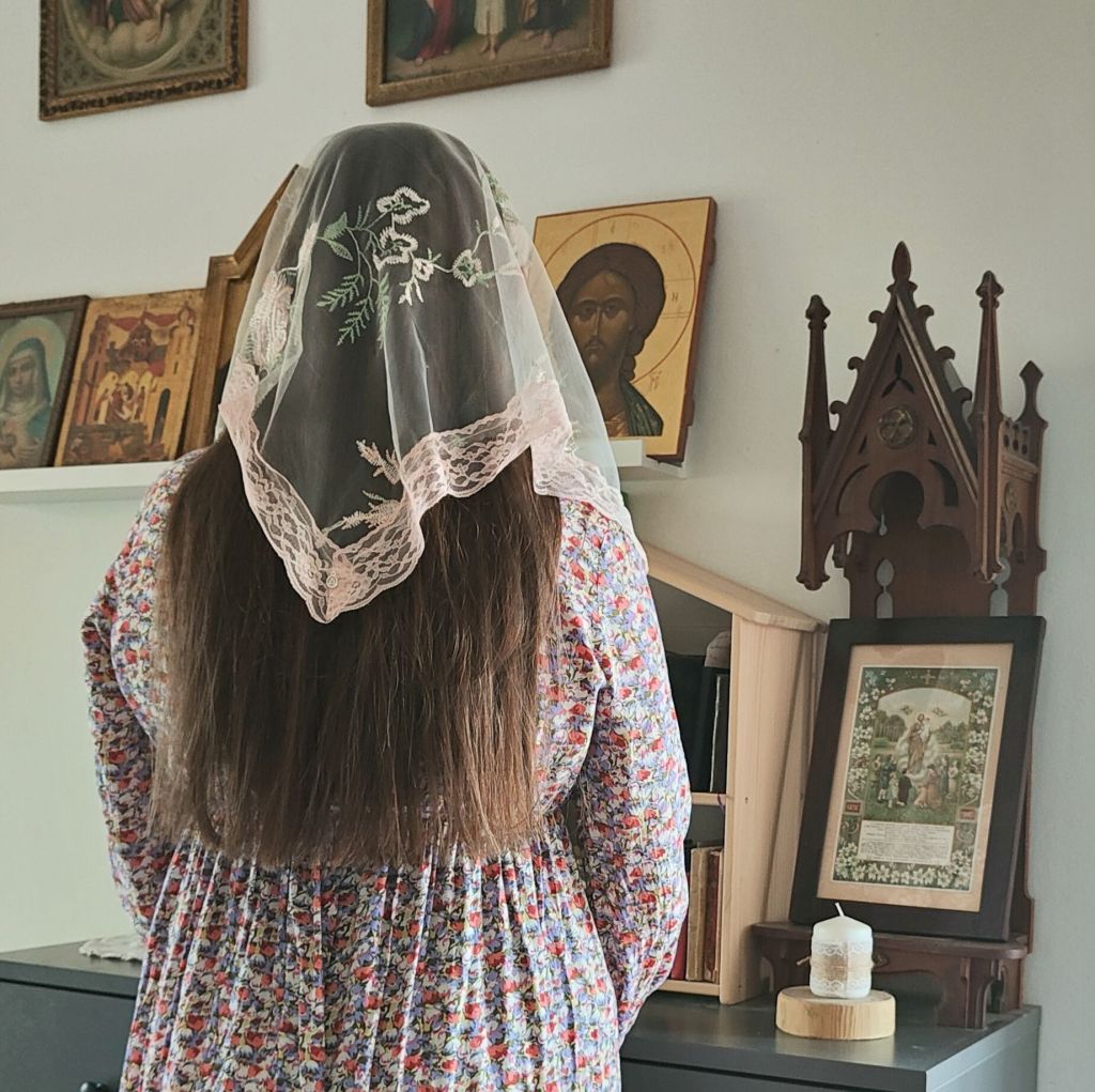 Questo modello misura 70x70x100cm, e il suo costo è di 20€. Nella punta dietro viene cucita una medaglietta. Il bordo di pizzo bianco o rosa segue tutti i bordi. Per questo modello non è necessaria la spilletta, ma può essere cucita su richiesta. Consigliato per chi si approccia per la prima volta alla pratica del velo muliebre, perché poco ingombrante, e per le bambine dai 6 anni in su.
