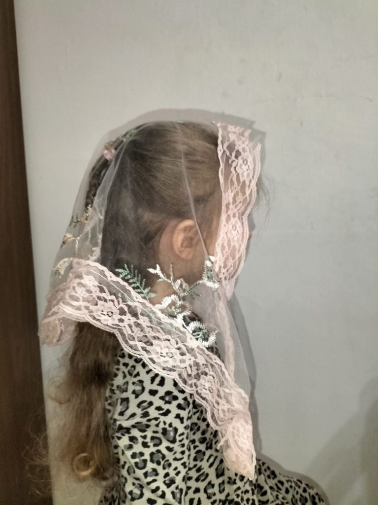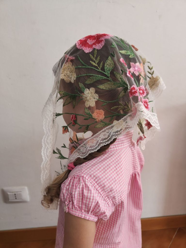 Il modello bambina misura 50x50x70cm, e il suo costo è di 15€. Sul retro, nella punta, viene cucito una medaglietta .Tutti i bordi sono rifiniti con bordo di pizzo banco o rosa. Questo modello è molto piccolo e leggero, è compresa una spilletta cucita, così da tenere ben saldo il velo. Questo modello è consigliato per le bambine dai 2 ai 6 anni circa.