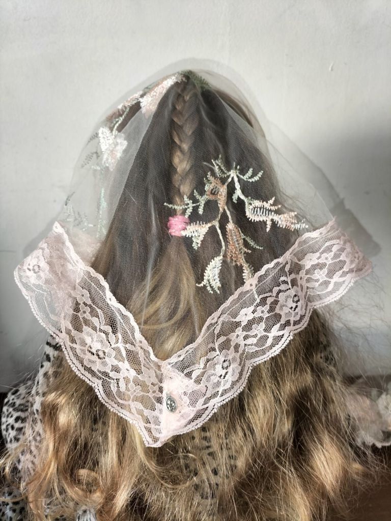Questo modello misura 50x50cm (ripiegato), e il prezzo è di 30€. Questo modello ha il bordo (bianco o rosa) lungo i due lati, chiusi ad anello. Non è compresa la medaglietta, e non è necessaria la spilletta. Questo velo è molto comodo da indossare e non scivola.