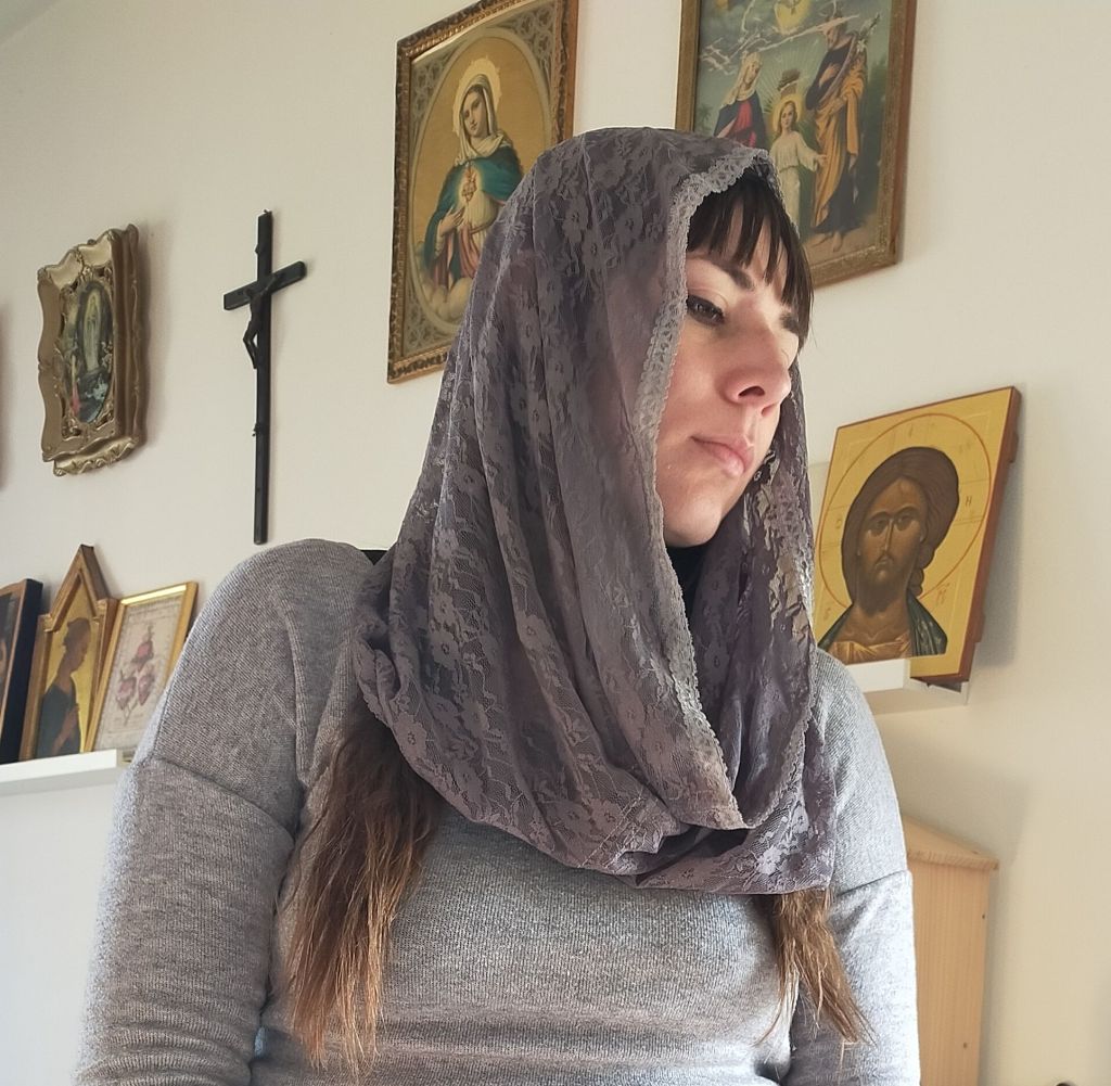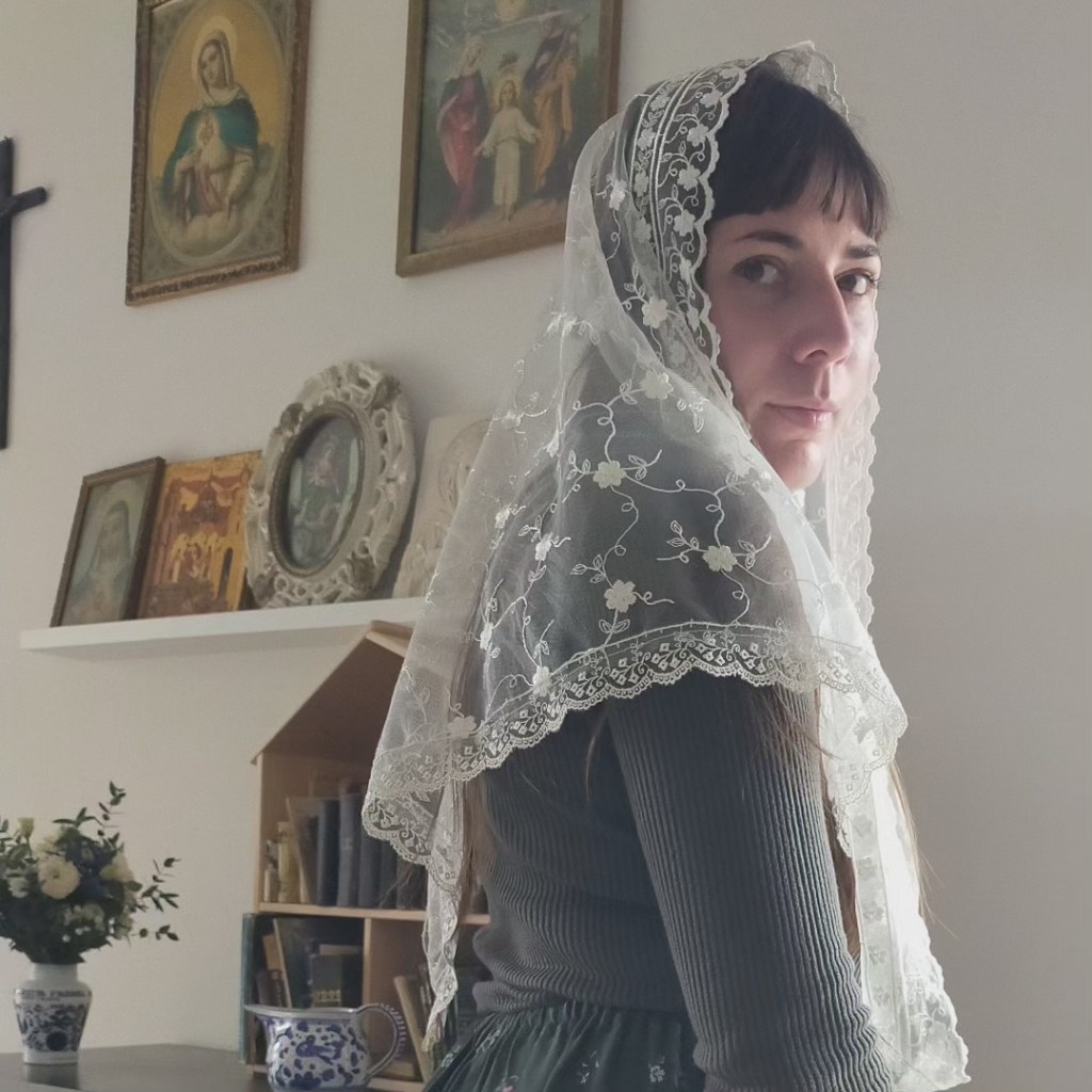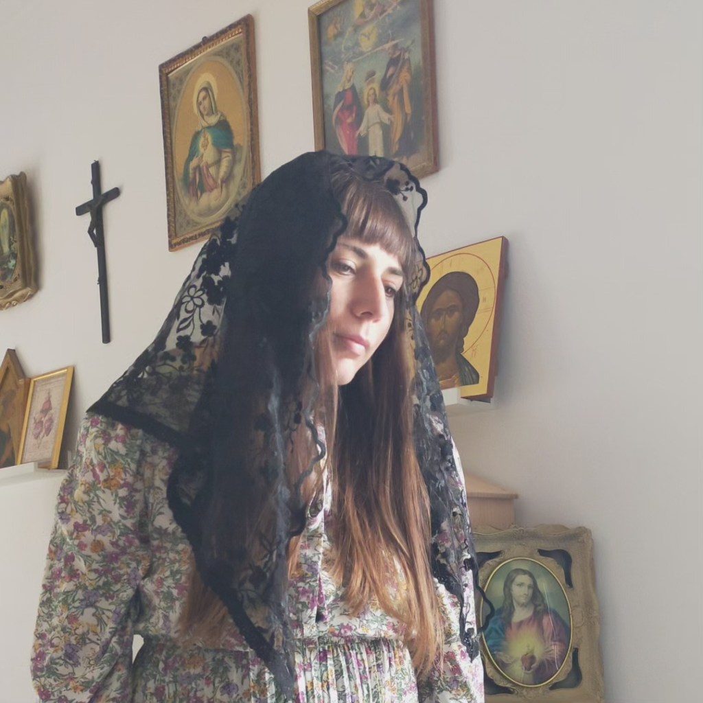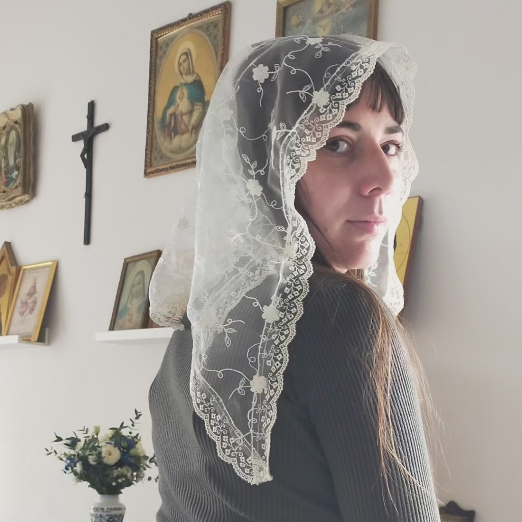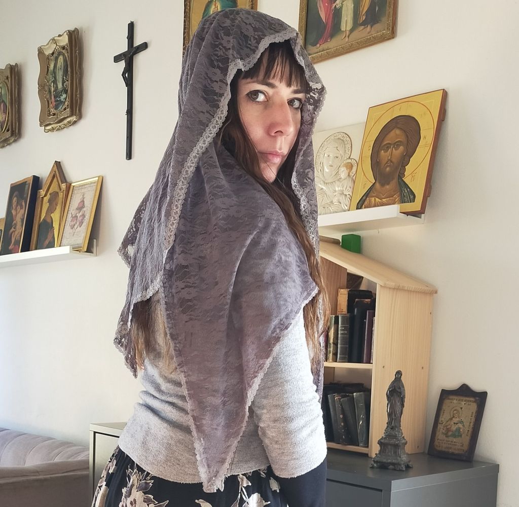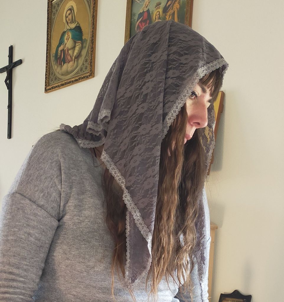 Ho pensato che questo giorno fosse perfetto per presentarvi l’ultimo velo della collezione in edizione limitata, di colore grigio. Tra l’altro, la fantasia è la medesima del primo velo della collezione, il blu Regina Sacratissimi Rosarii. Il cerchio si chiude.