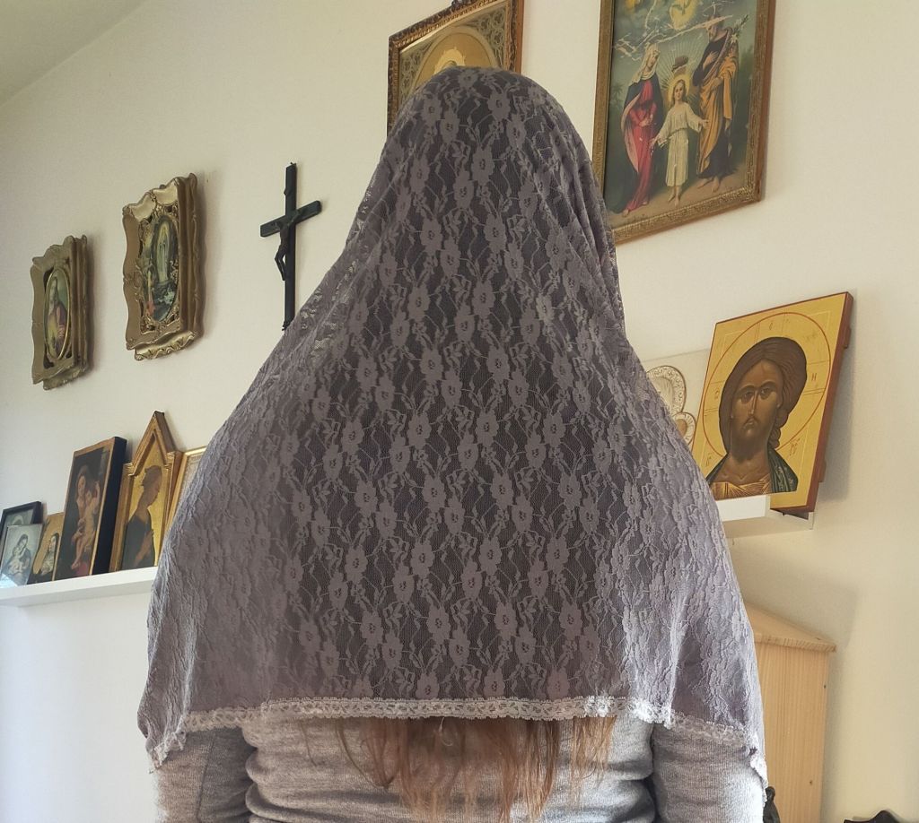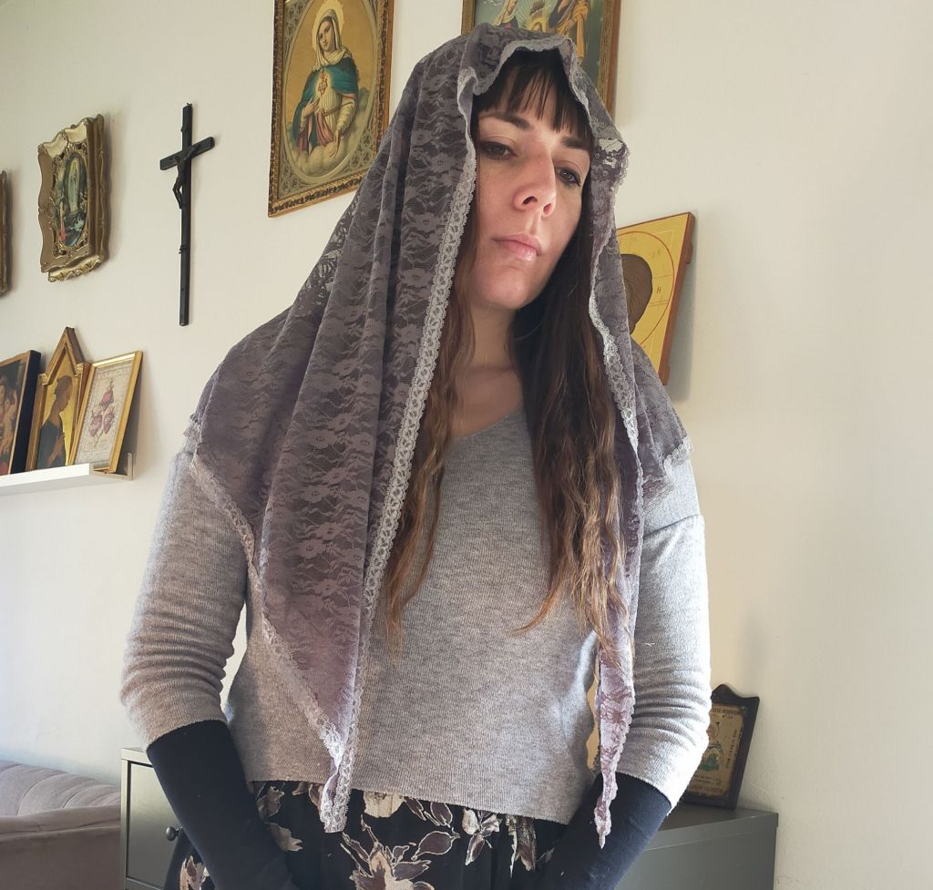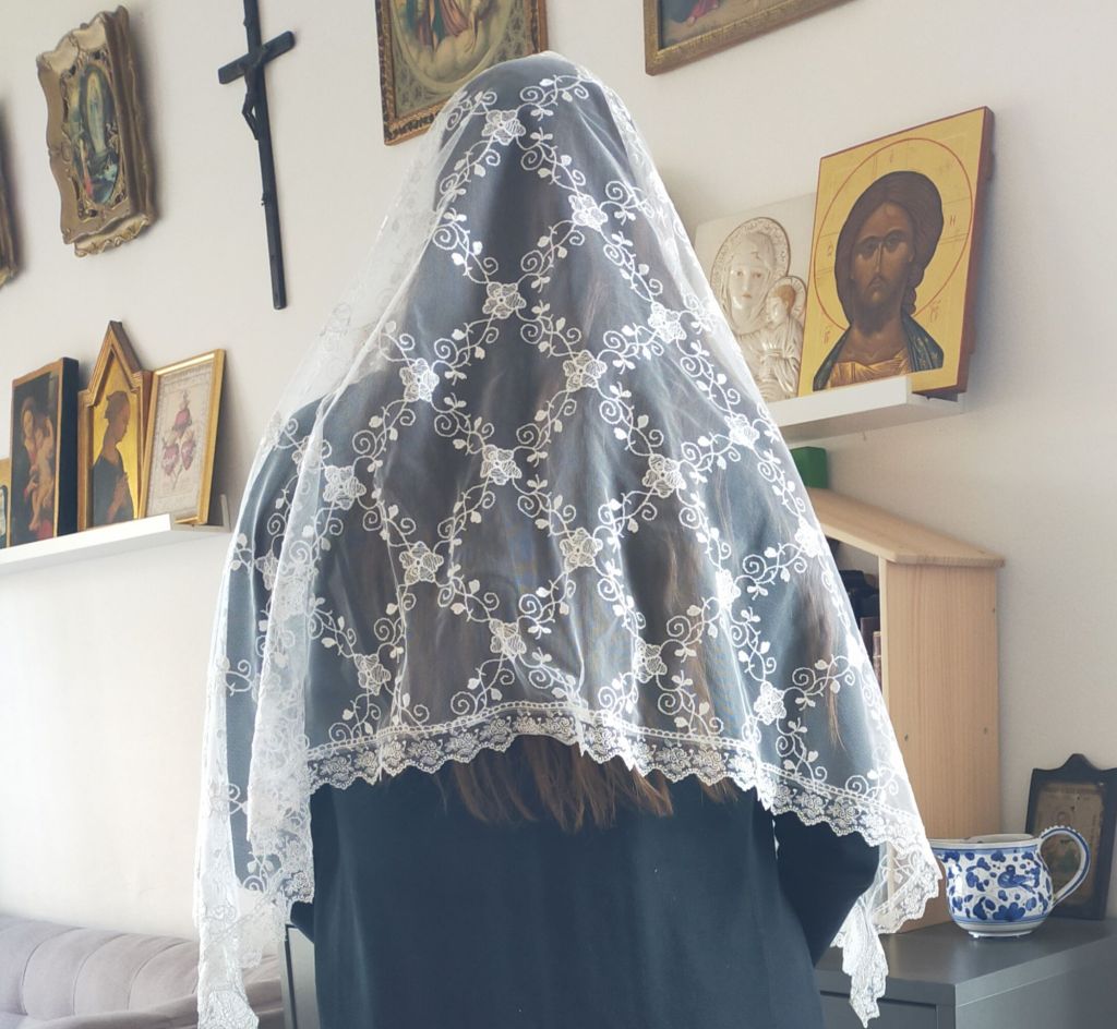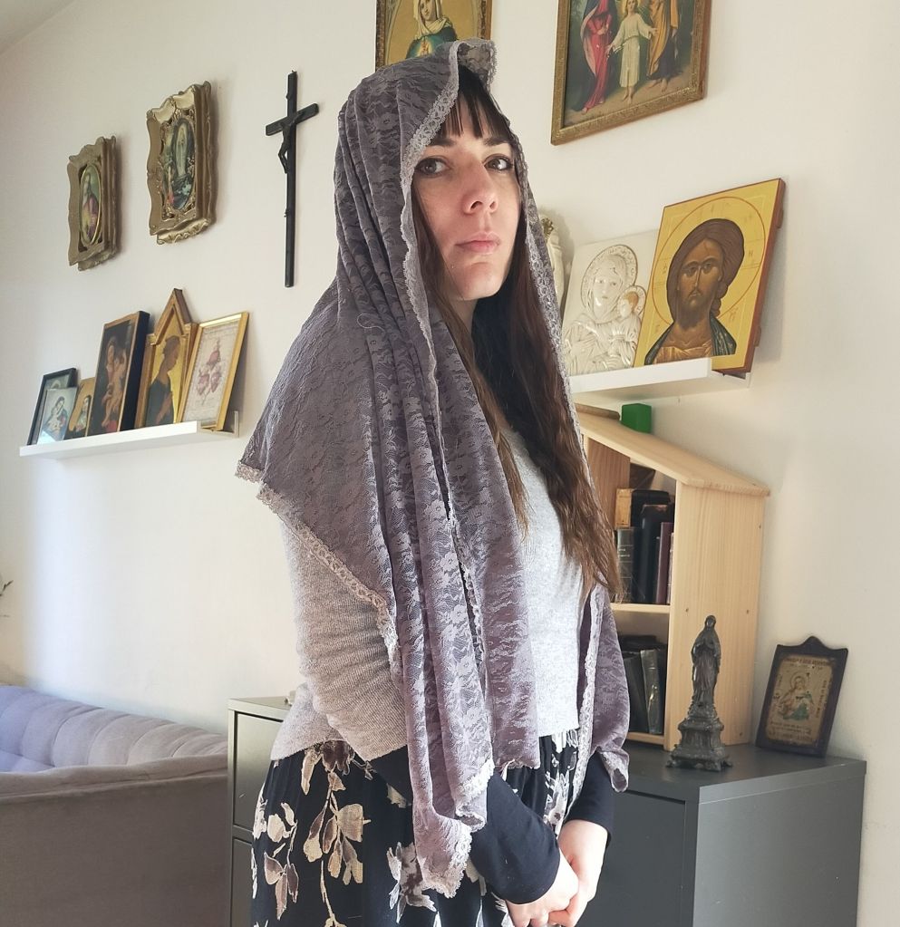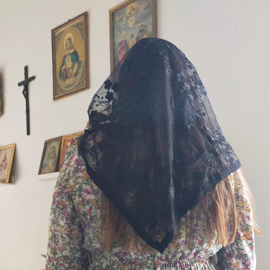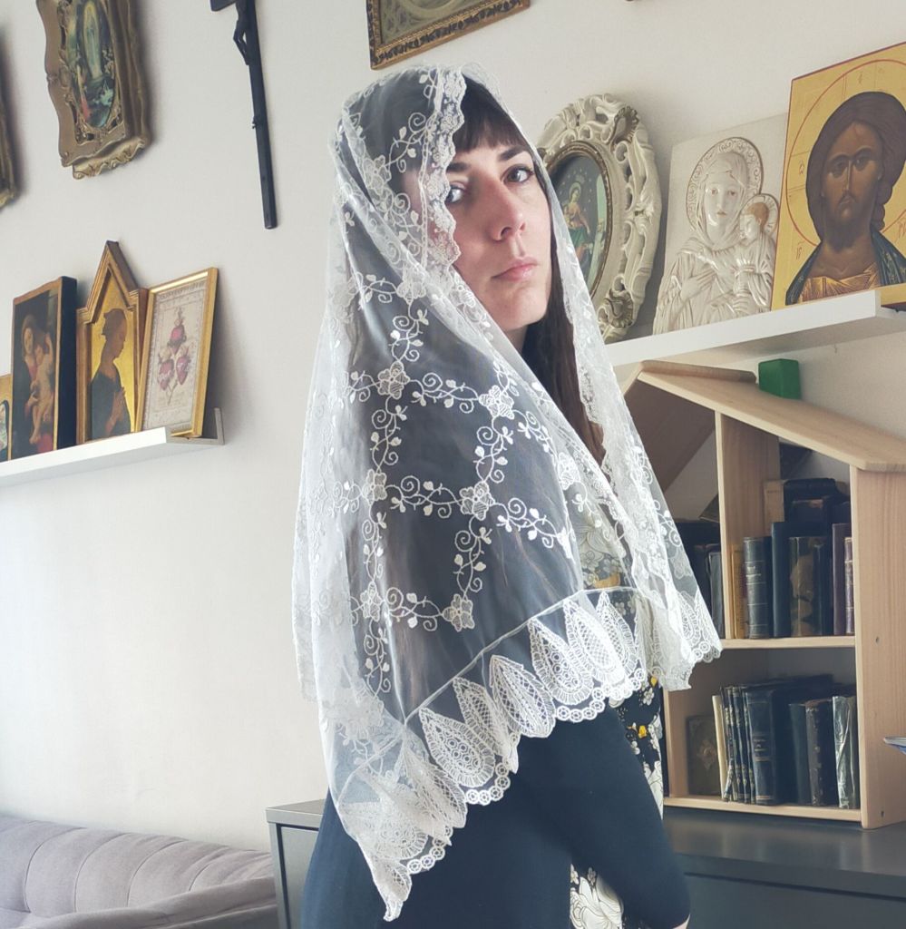 Ho pensato che questo giorno fosse perfetto per presentarvi l’ultimo velo della collezione in edizione limitata, di colore grigio. Tra l’altro, la fantasia è la medesima del primo velo della collezione, il blu Regina Sacratissimi Rosarii. Il cerchio si chiude.