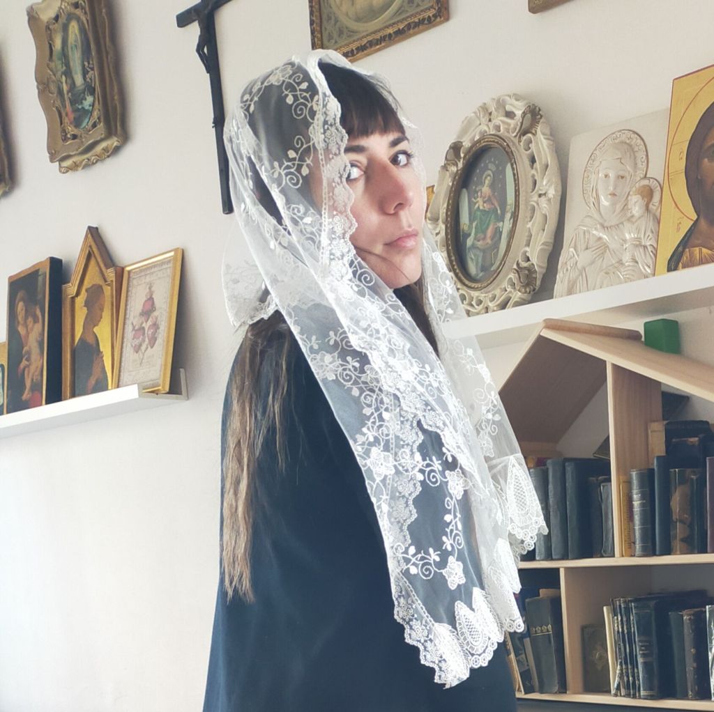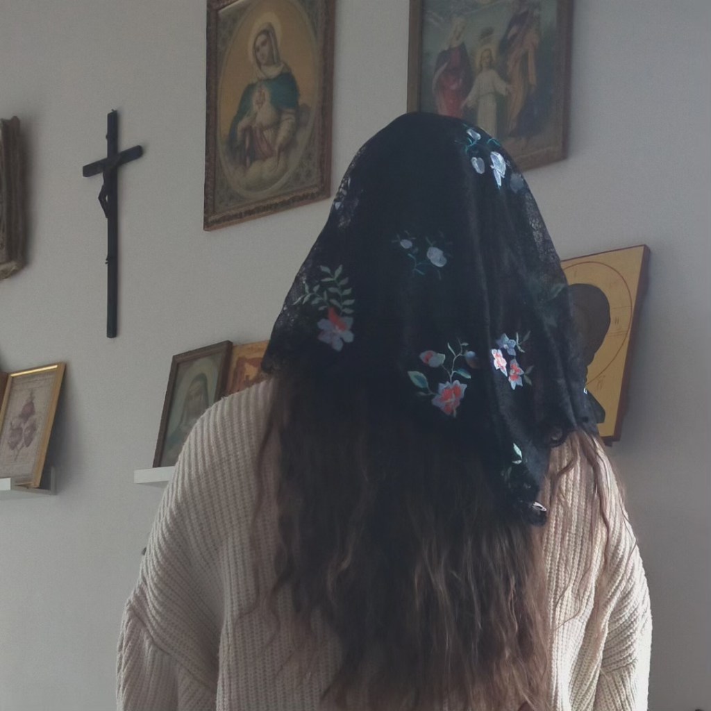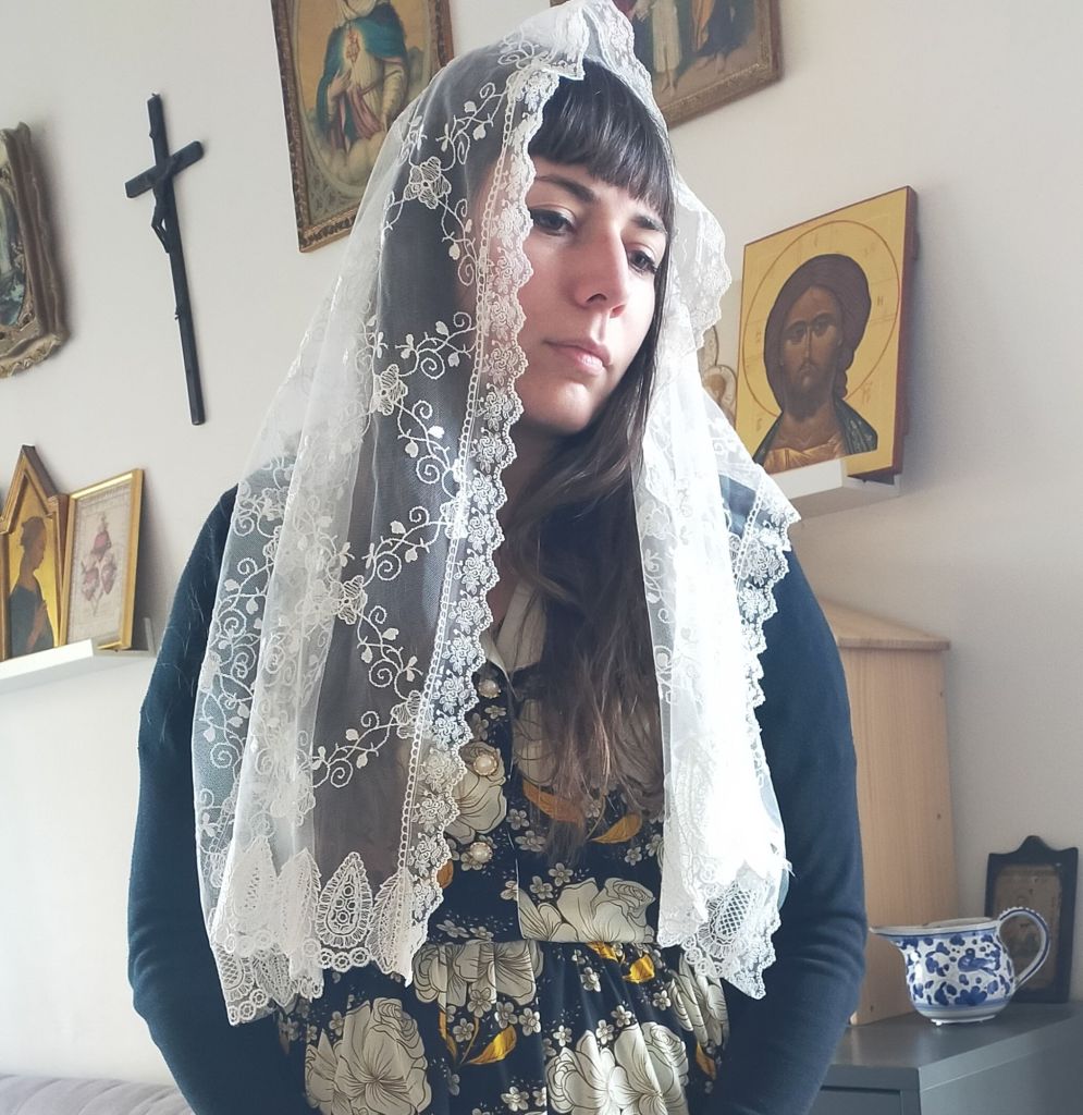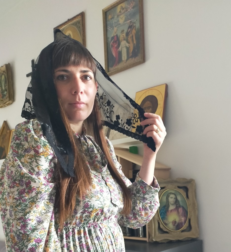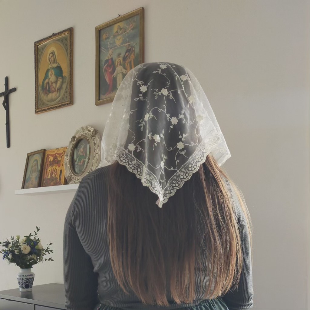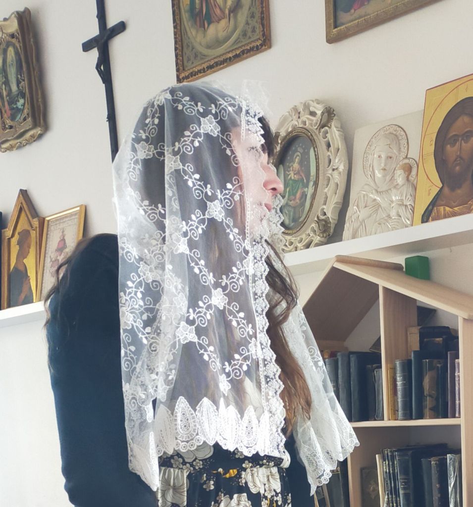 Ho pensato che questo giorno fosse perfetto per presentarvi l’ultimo velo della collezione in edizione limitata, di colore grigio. Tra l’altro, la fantasia è la medesima del primo velo della collezione, il blu Regina Sacratissimi Rosarii. Il cerchio si chiude.