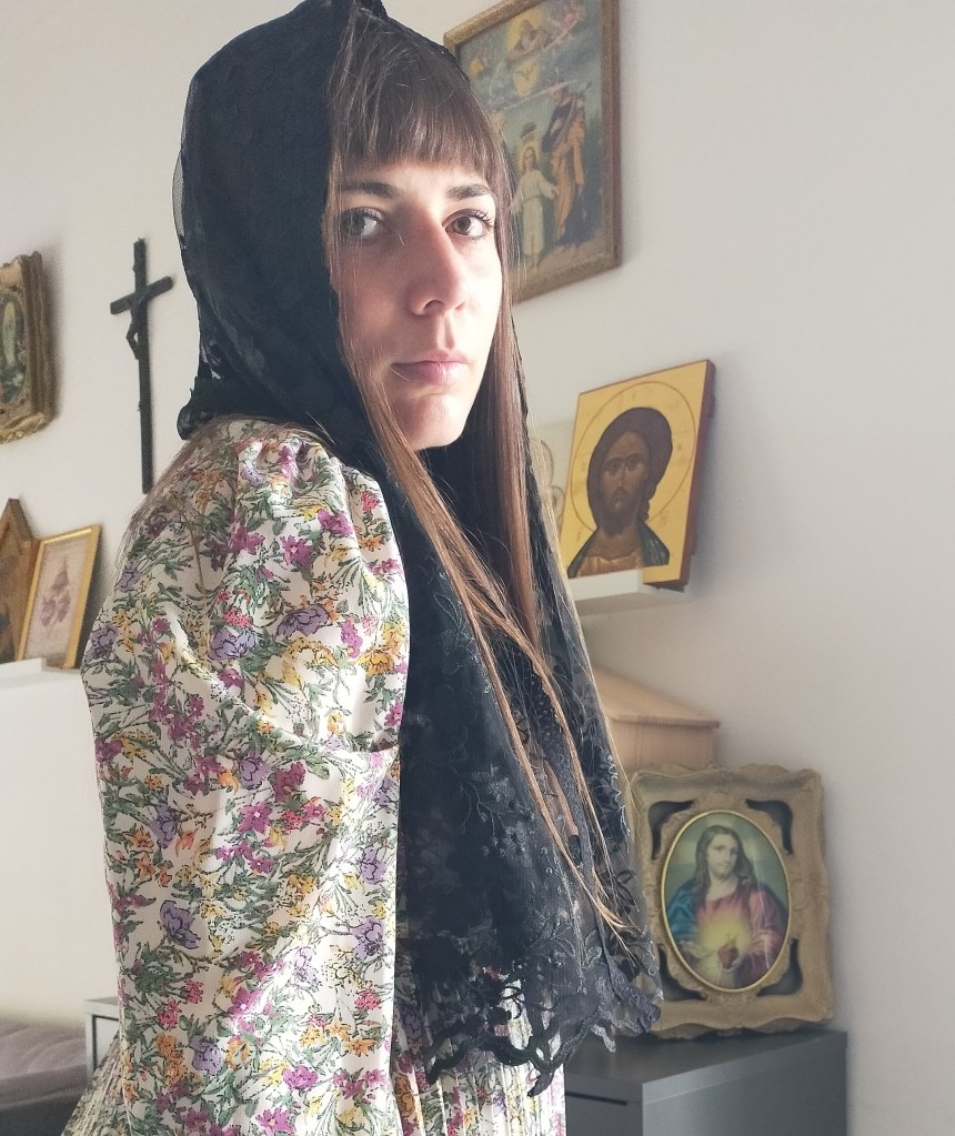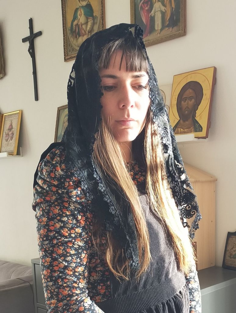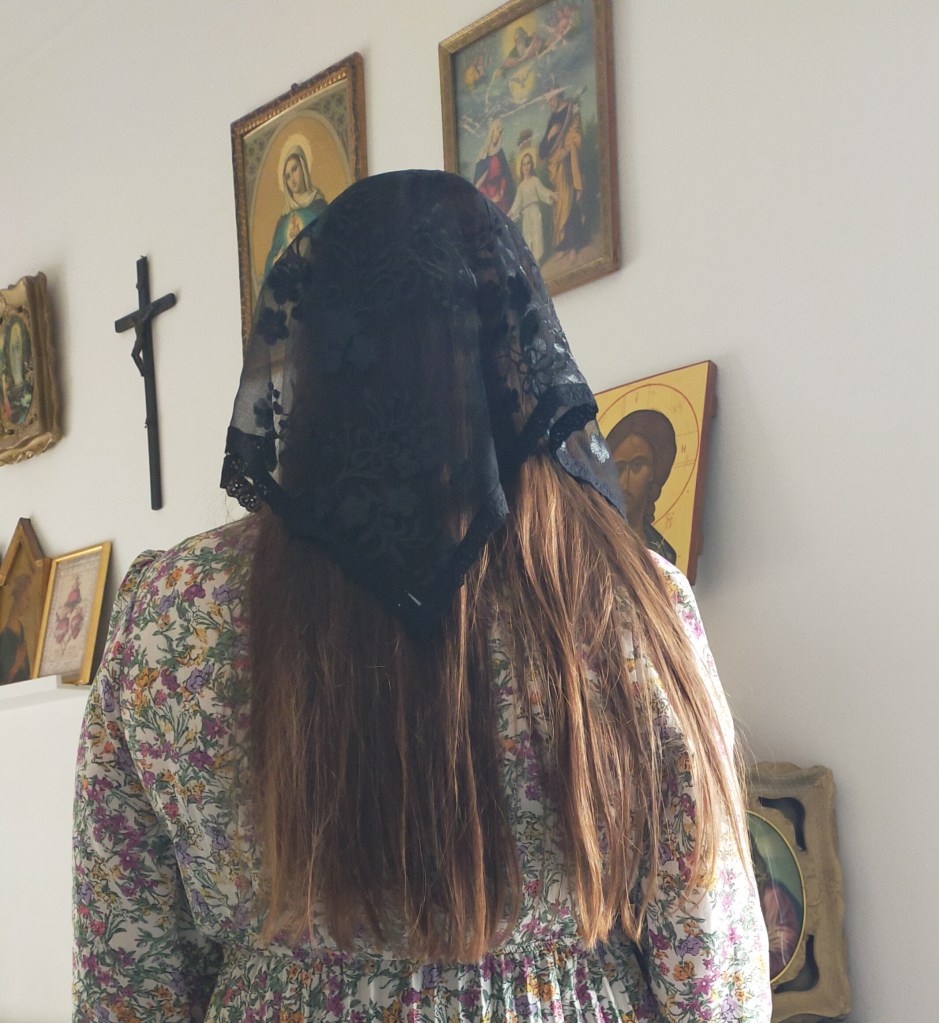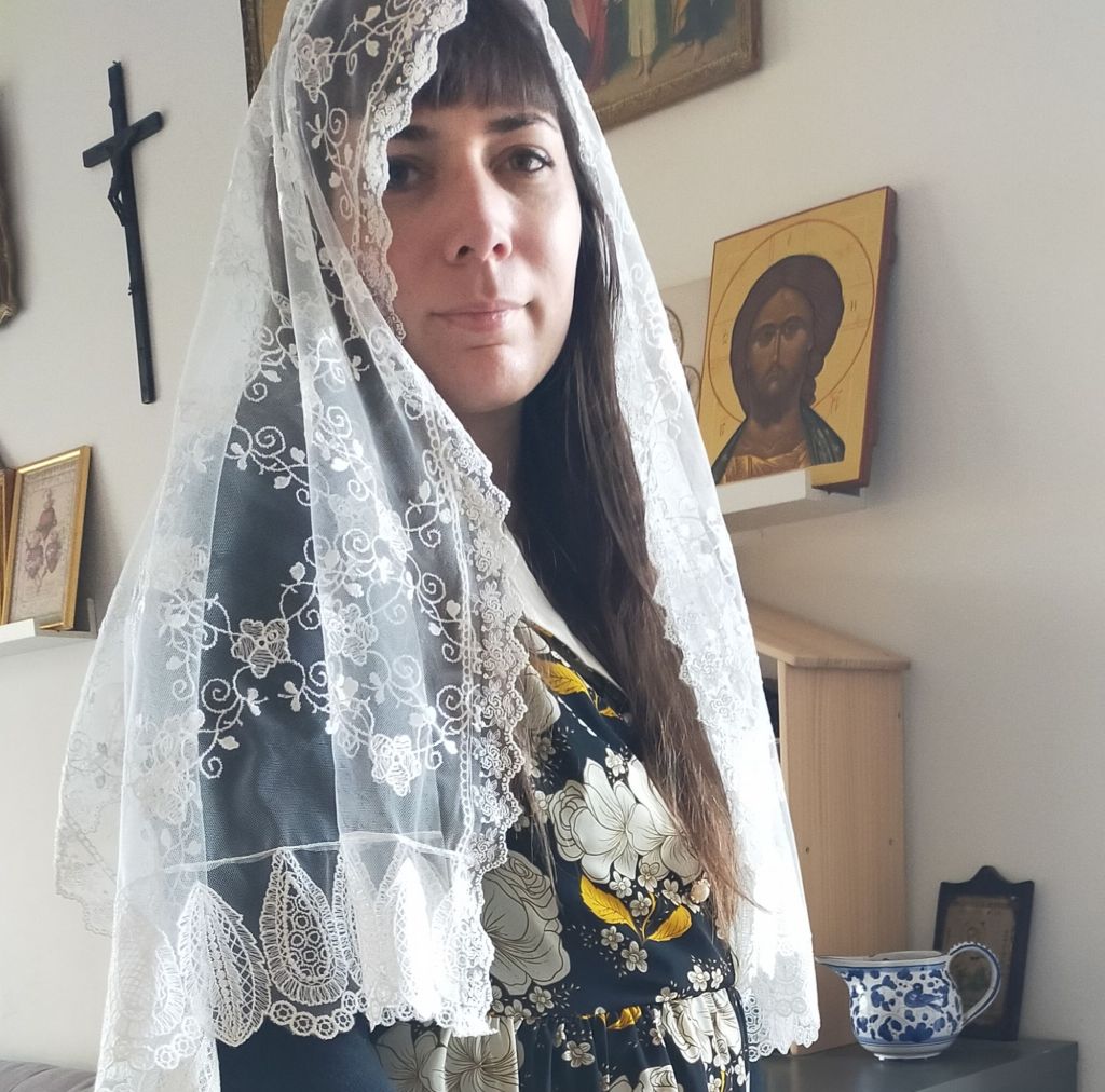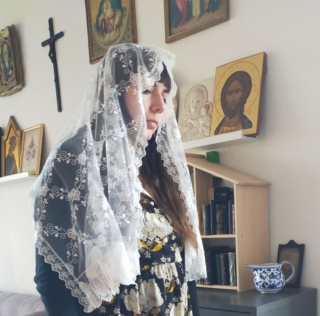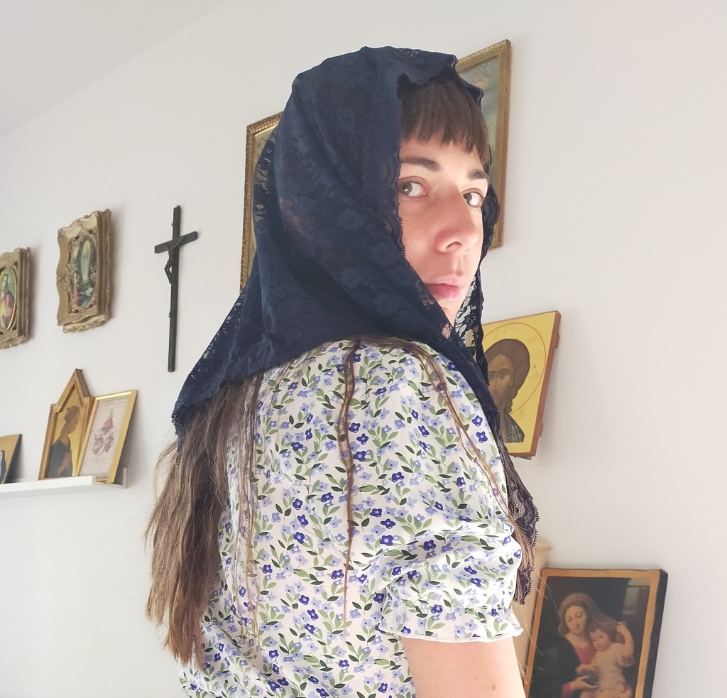 Ho pensato che questo giorno fosse perfetto per presentarvi l’ultimo velo della collezione in edizione limitata, di colore grigio. Tra l’altro, la fantasia è la medesima del primo velo della collezione, il blu Regina Sacratissimi Rosarii. Il cerchio si chiude.