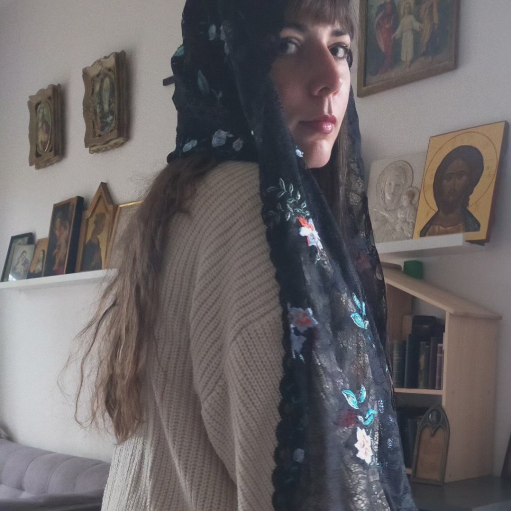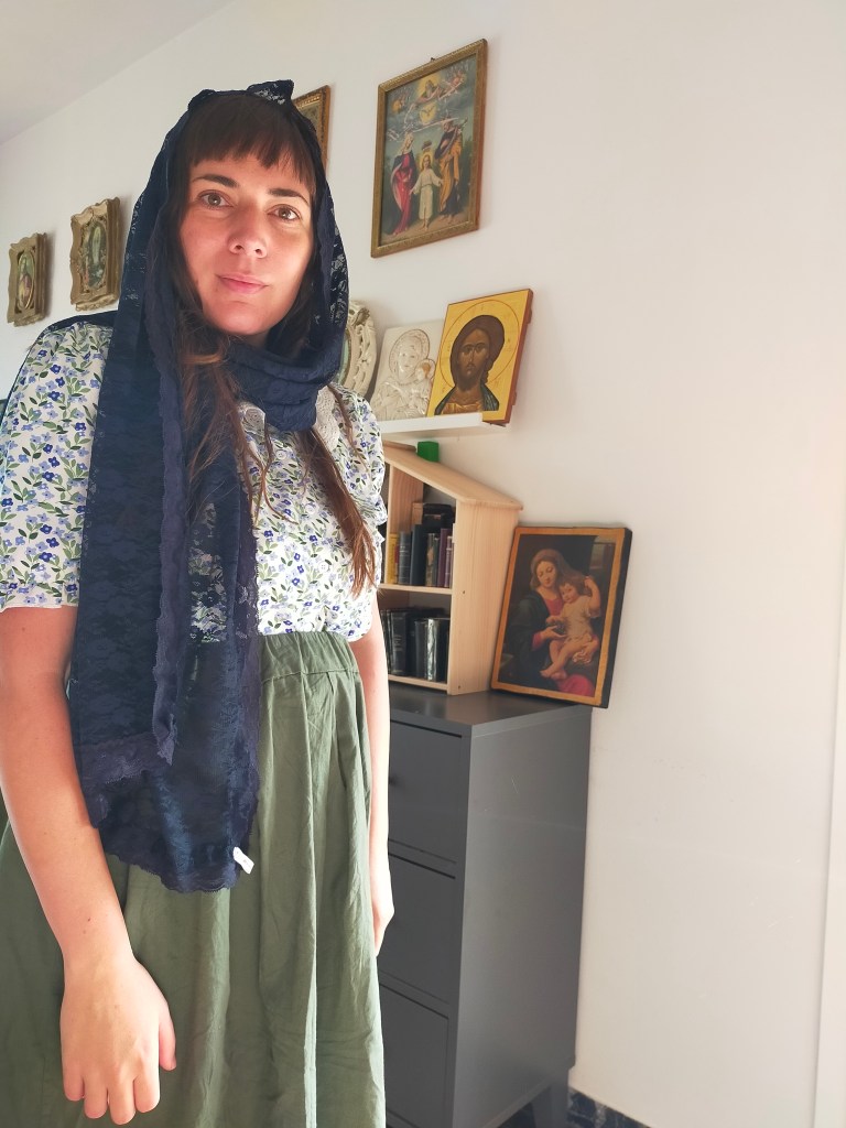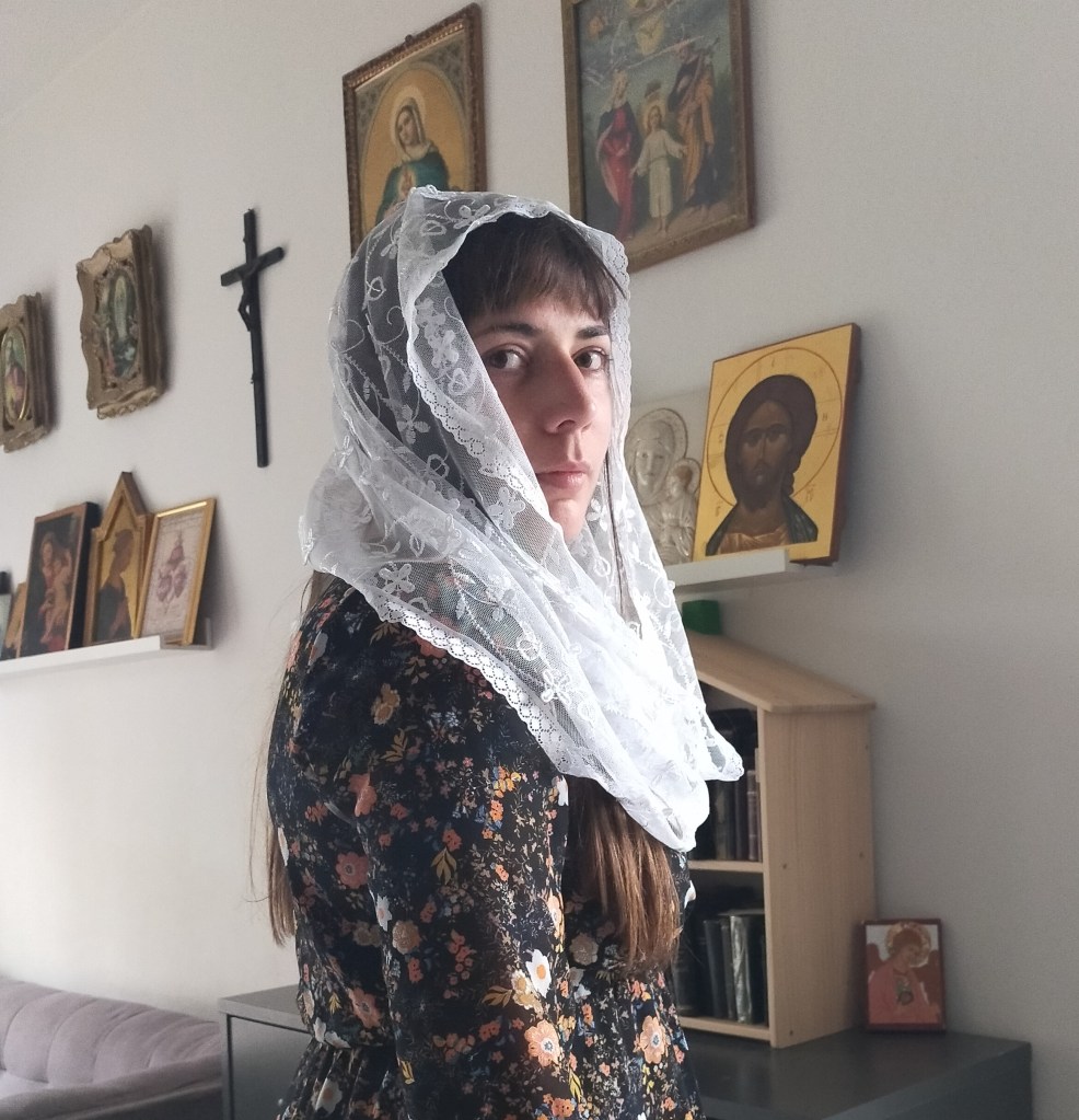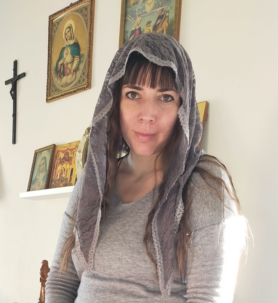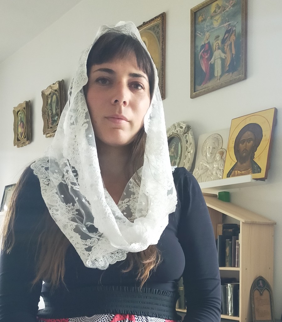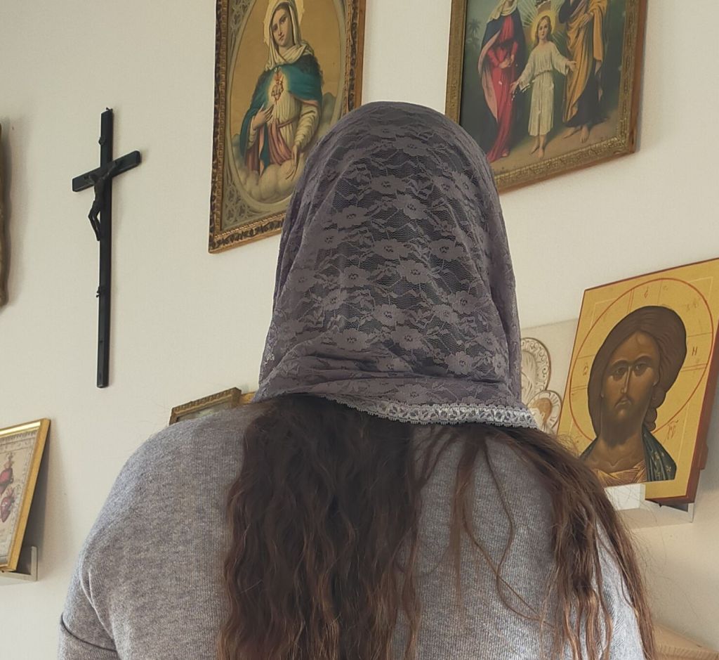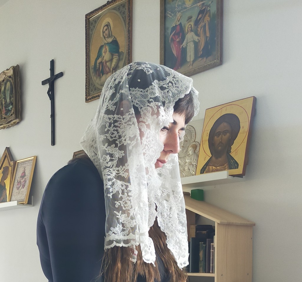 Ho pensato che questo giorno fosse perfetto per presentarvi l’ultimo velo della collezione in edizione limitata, di colore grigio. Tra l’altro, la fantasia è la medesima del primo velo della collezione, il blu Regina Sacratissimi Rosarii. Il cerchio si chiude.