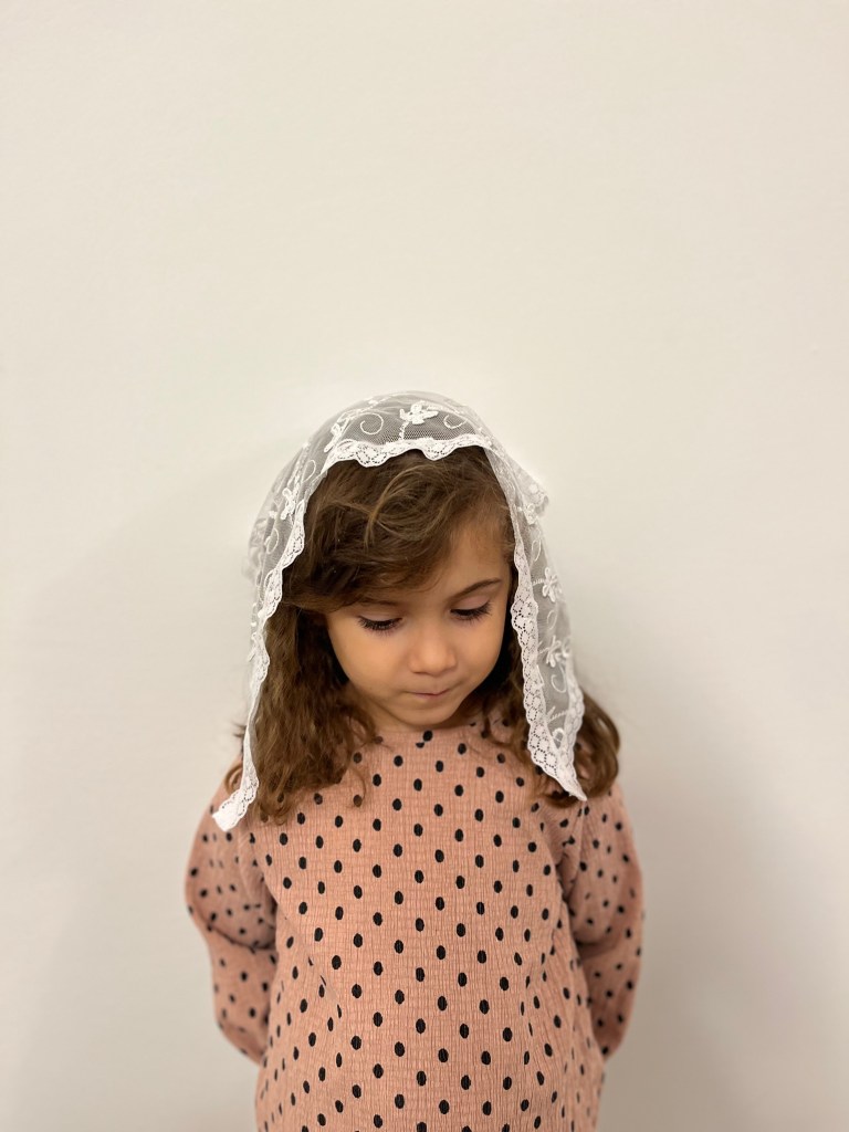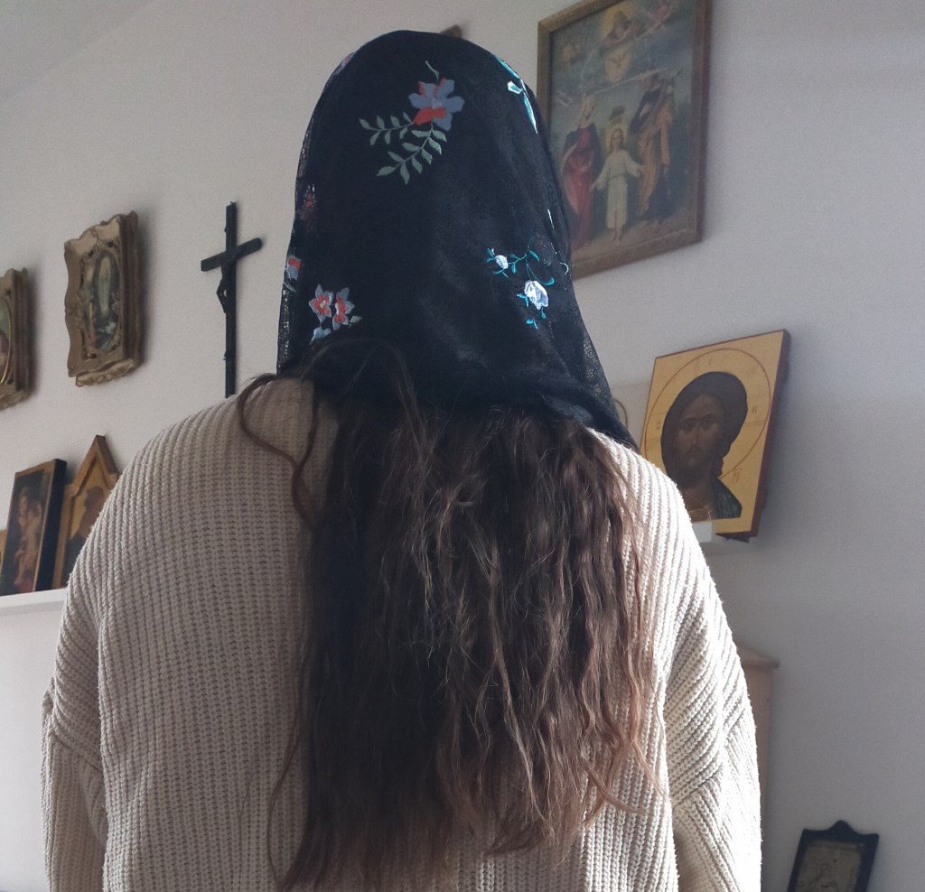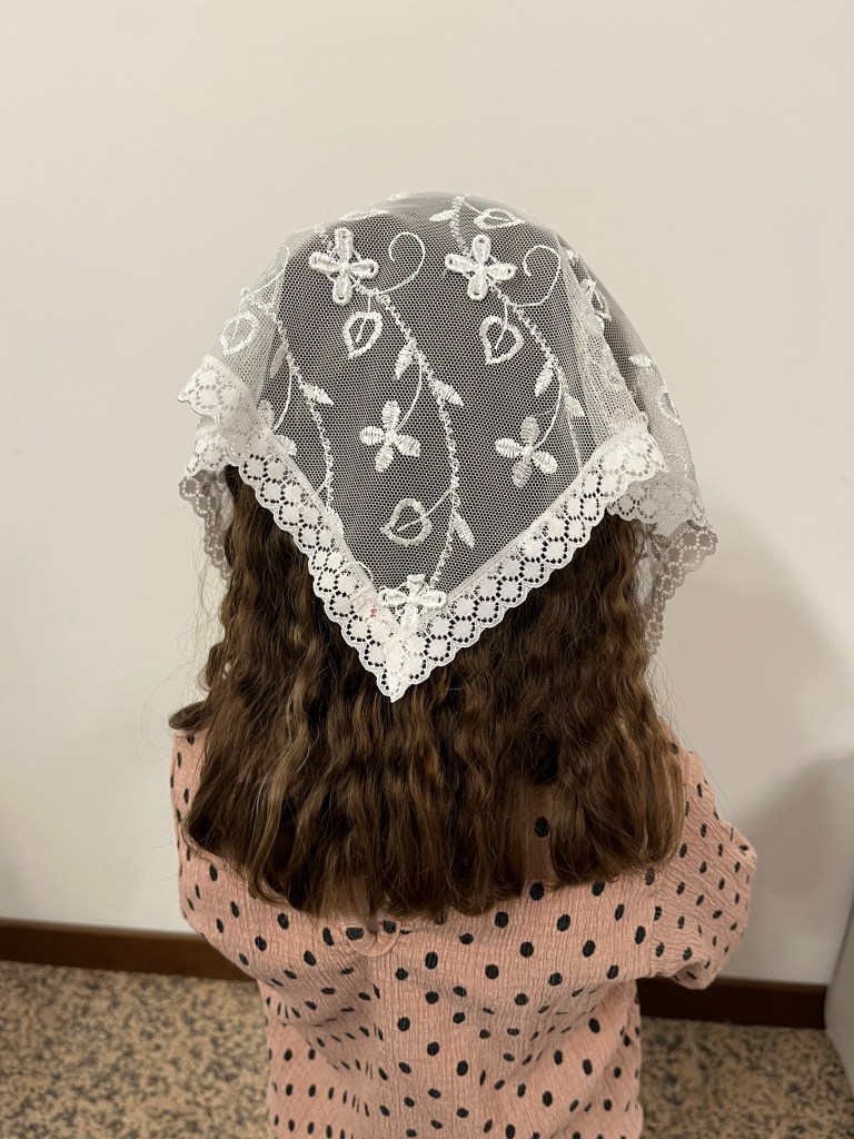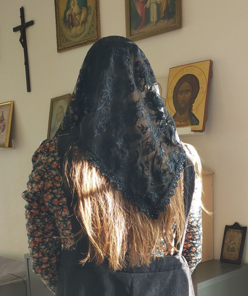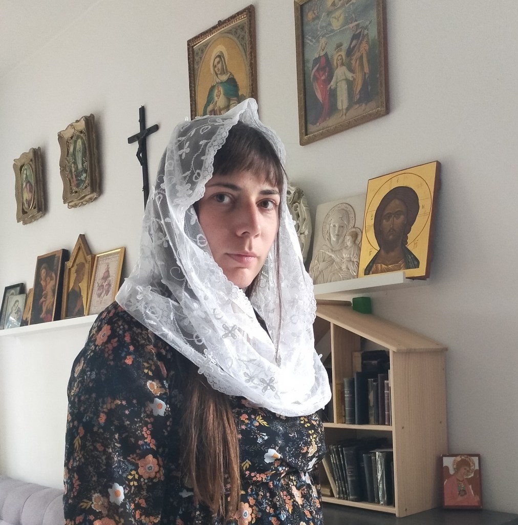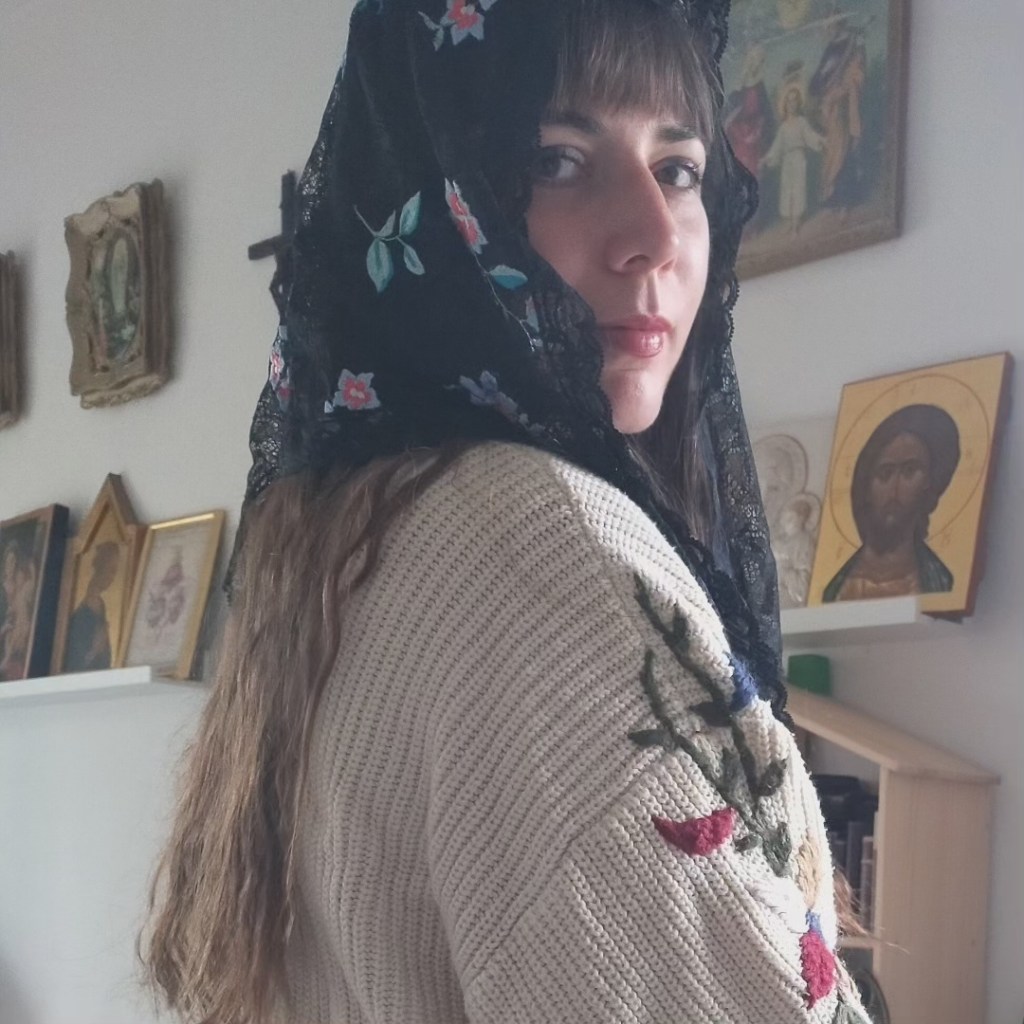 Ho pensato che questo giorno fosse perfetto per presentarvi l’ultimo velo della collezione in edizione limitata, di colore grigio. Tra l’altro, la fantasia è la medesima del primo velo della collezione, il blu Regina Sacratissimi Rosarii. Il cerchio si chiude.