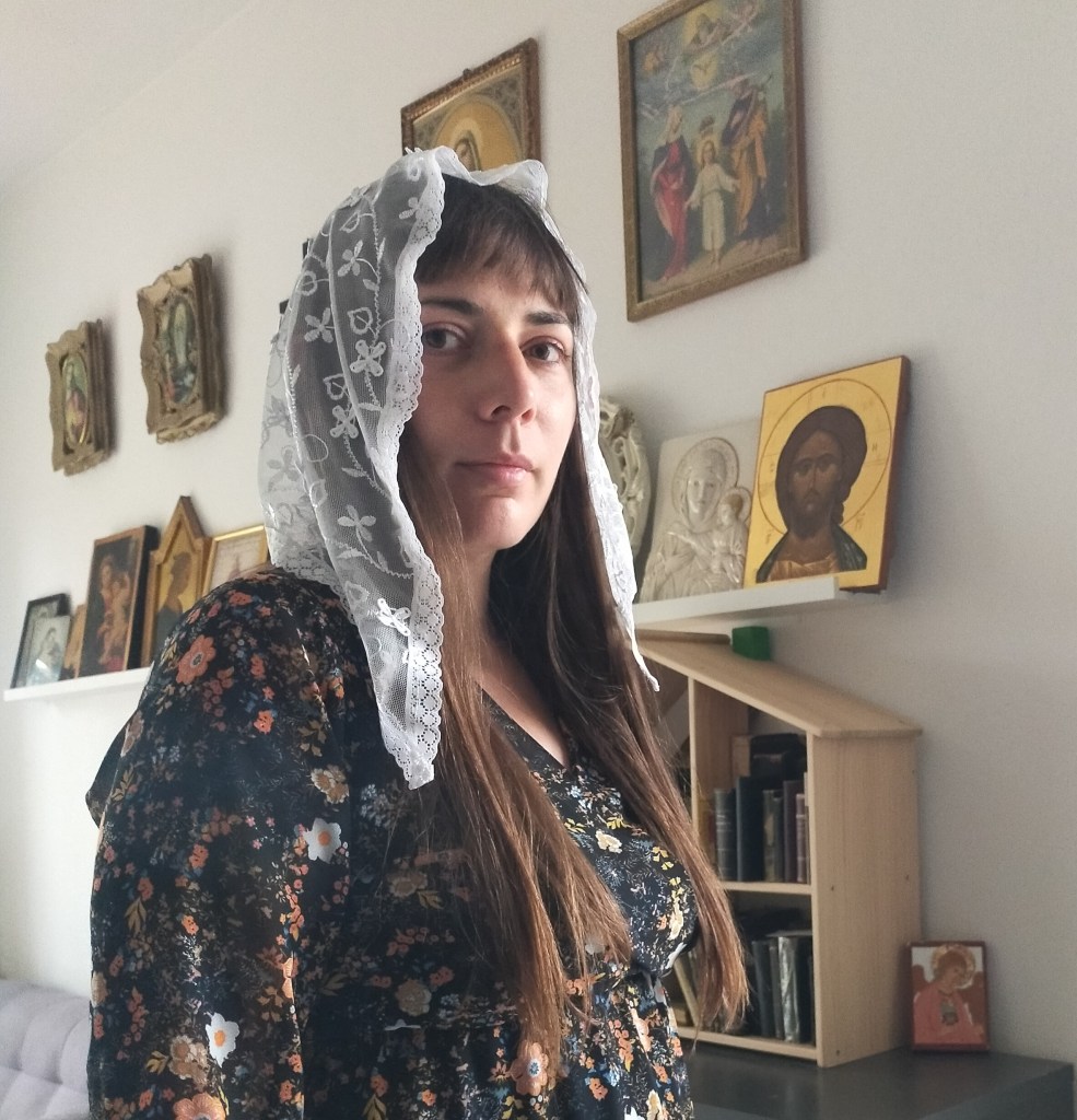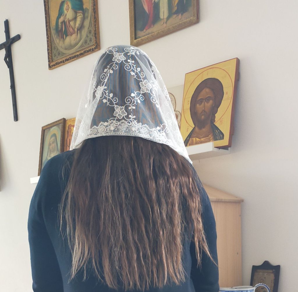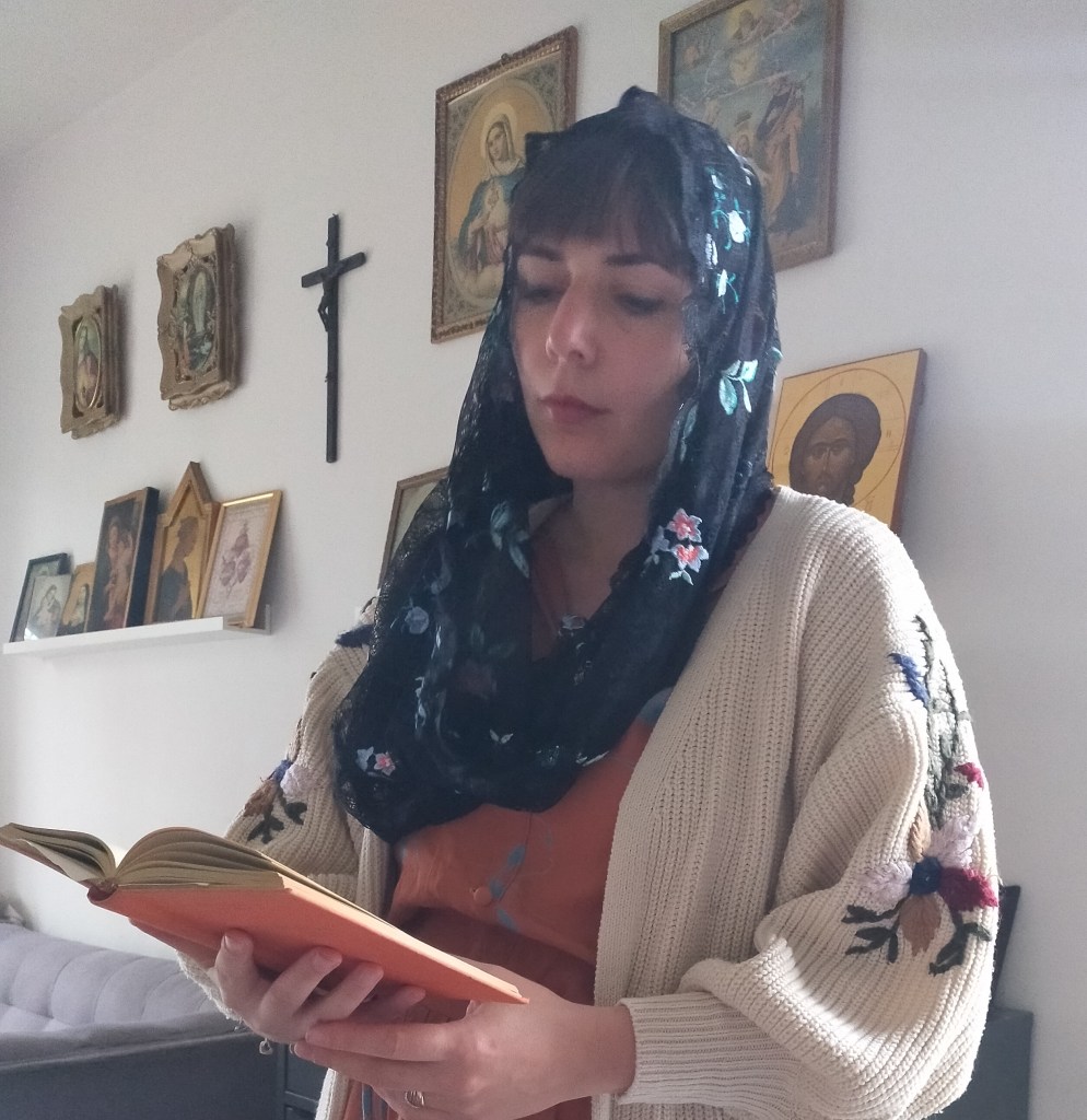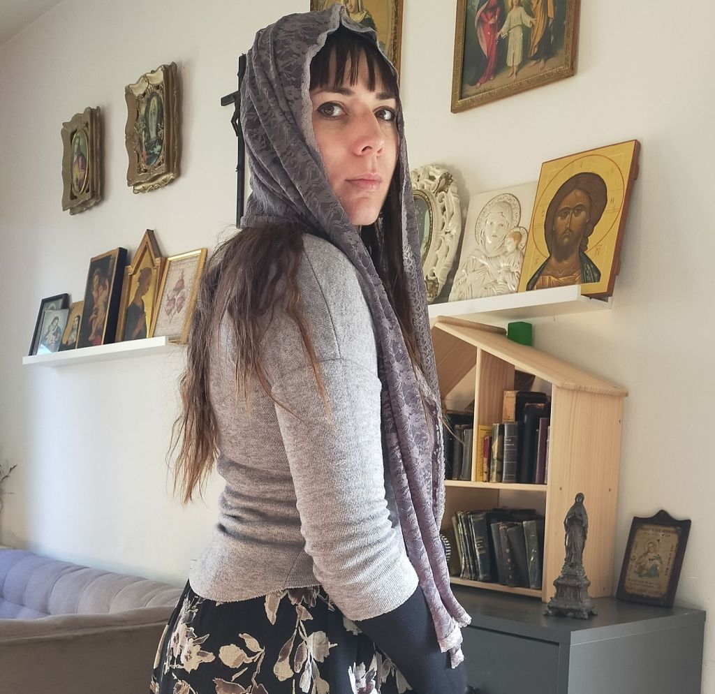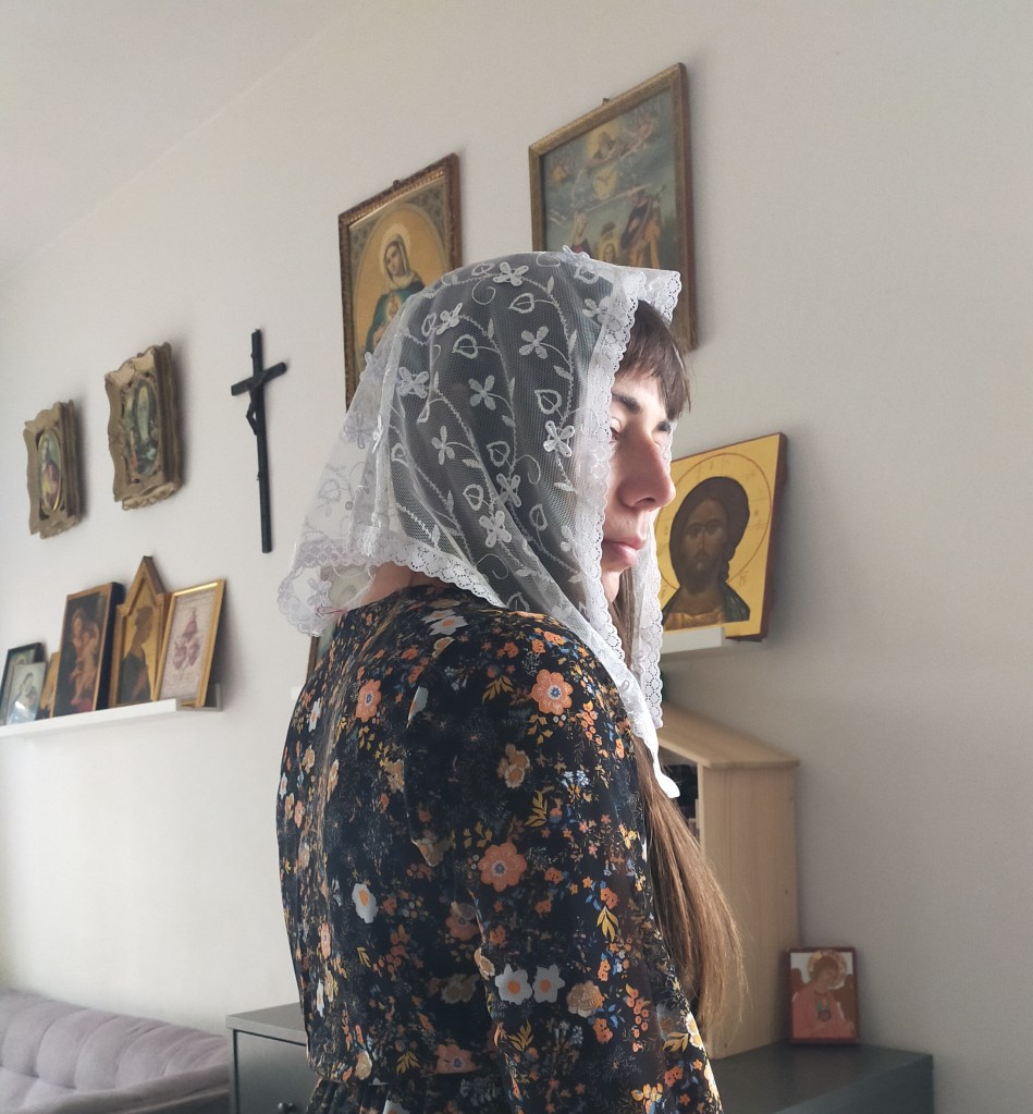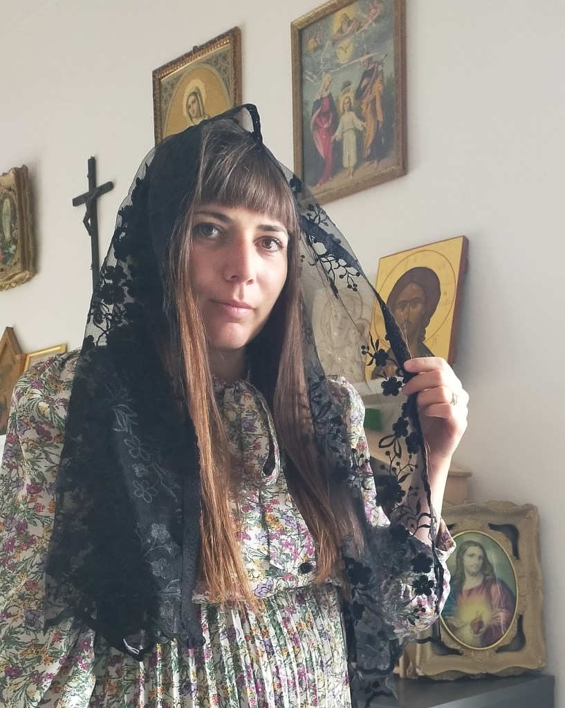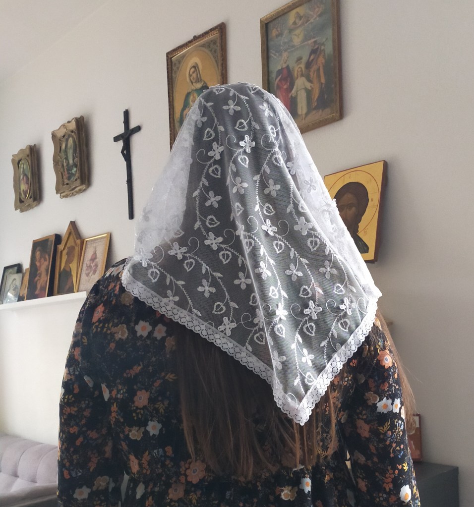 Ho pensato che questo giorno fosse perfetto per presentarvi l’ultimo velo della collezione in edizione limitata, di colore grigio. Tra l’altro, la fantasia è la medesima del primo velo della collezione, il blu Regina Sacratissimi Rosarii. Il cerchio si chiude.