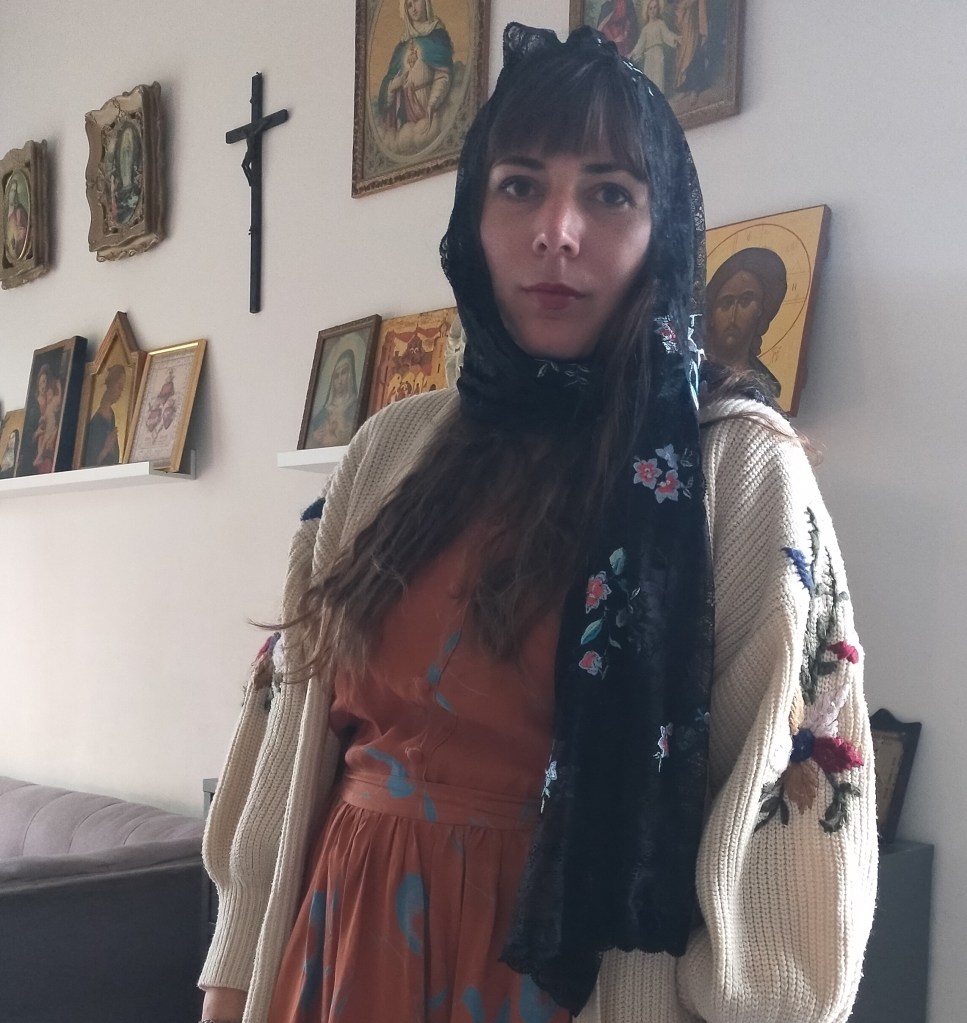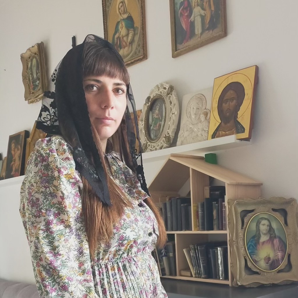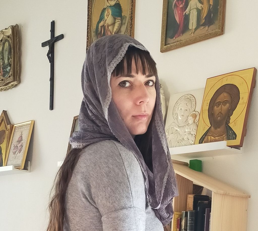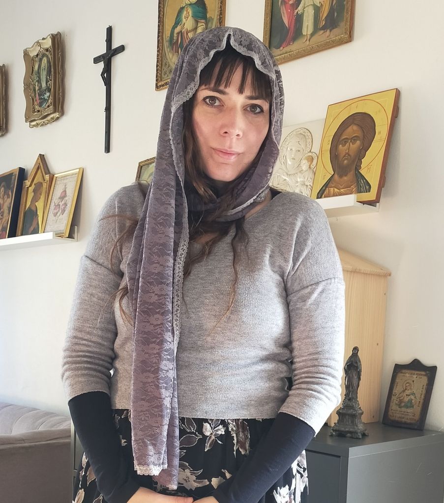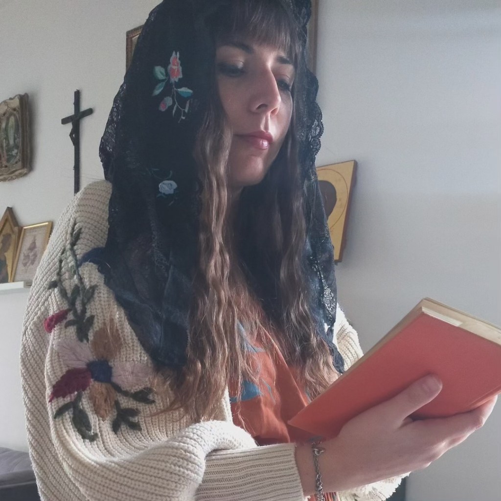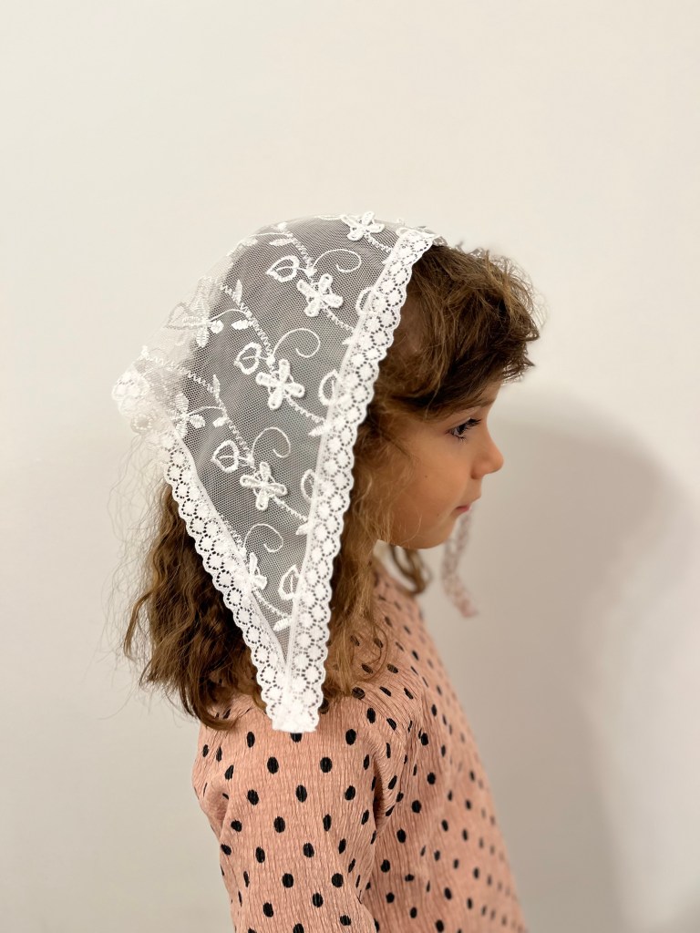 Ho pensato che questo giorno fosse perfetto per presentarvi l’ultimo velo della collezione in edizione limitata, di colore grigio. Tra l’altro, la fantasia è la medesima del primo velo della collezione, il blu Regina Sacratissimi Rosarii. Il cerchio si chiude.